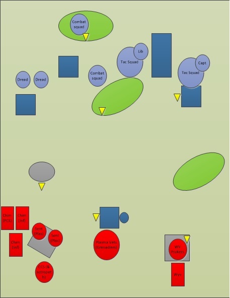 My opponent went for an infantry focused force with 3 tac squads (one split into combat squads), 2 dreads (1 anti-tank, 1 anti-infantry), a Captain and a Librarian. I went with a CCS (all plasma & carapace, Kurov’s Aquila and astropath), Vet squad (3 plasma, las-cannon, carapace and commissar), 2x armoured Sentinels with plasma, PCS & 2 squads in Chimeras, 5 Wyrdvane psykers and a Wyvern. I rolled on Telepathy and Telekinesis, and my mate went for Biomancy. We rolled for the lengthways deployment and I think it was the ‘Spoils of War’ Maelstrom mission (the one with three cards each per turn). We mutually decided to ignore night fighting & mysterious objectives to keep it simple. Marines won the role and opted to deploy and go first, and I failed to seize. Initial deployment is shown below: