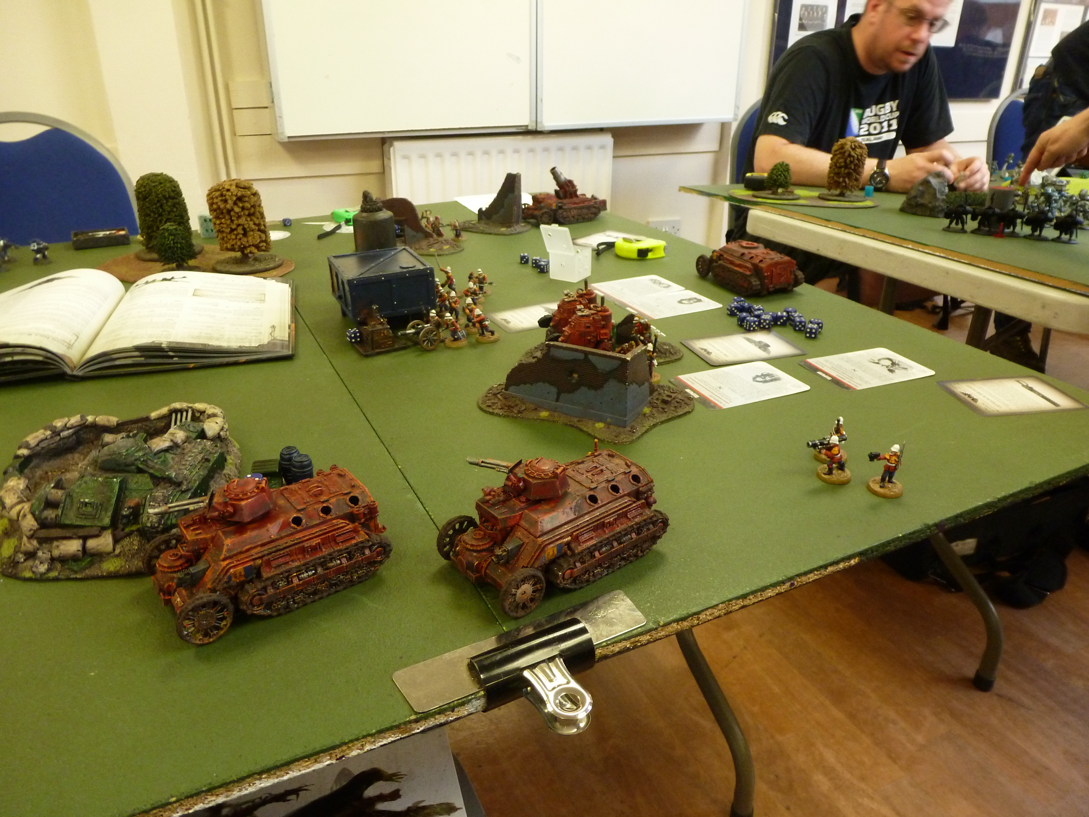 Marine 3rd turn: The Librarian and his squad spread out to cover 2 objectives, while the remaining combat squad stayed camped on their objective. The Captain’s squad broke cover and got a line on the Vet squad. Psychic phase saw Iron-arm cast on the Librarian squad again. Shooting was fairly ineffective- the Cap’s squad pinged some Vets from the back of the squad, while the Librarian’s squad and combat squad tried to damage the lead Chimera, but failed. 1 VP scored for the tactical objective held by the combat squad.