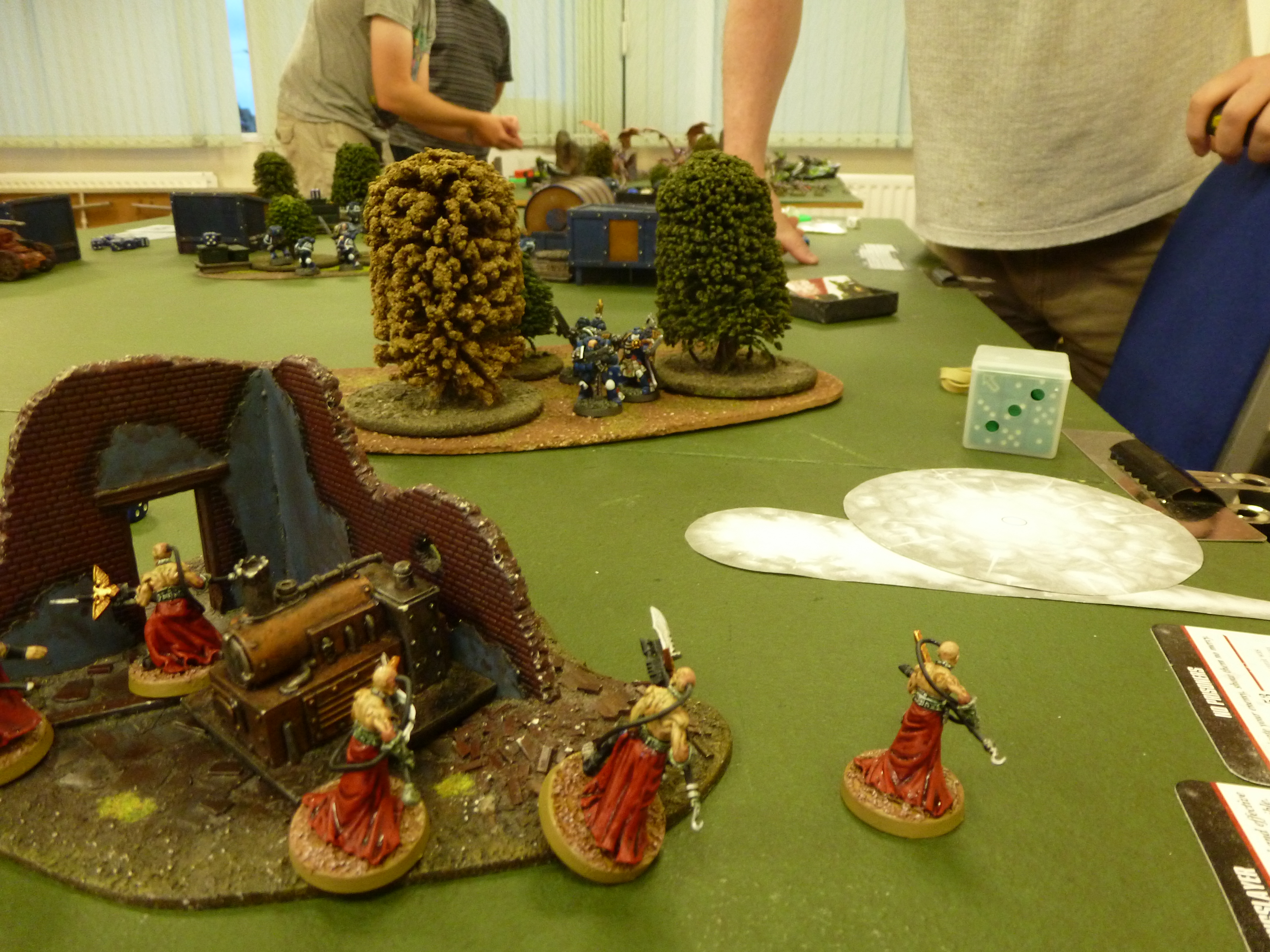 Marine 4th turn (final turn due to time): The combat squad and the Librarian tac squad stayed put, while the remnants of the Captain’s squad advanced menacingly on the psykers in the ruins. The psychic phase saw iron-arm successfully cast again, and then the Librarian & co let rip on the nearest infantry squad, killing 7 and sending the rest scurrying back to their table edge. The Captain & co charged the psykers with no losses to overwatch (despite some surprisingly accurate fire!). The psykers were unsurprisingly butchered where they stood, and the then marines did their best to consolidate into the ruins, scoring 1 VP for the objective and potentially claiming linebreaker.