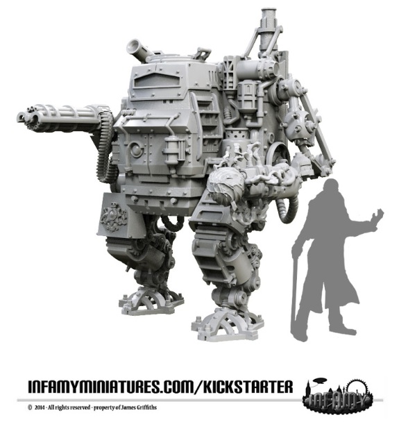 Now, I am a big fan of the Infamy sculpts to date – they are all amazing… but… this model has literally blown my mind. James has smashed the ball out of the park with this one, and I can’t wait to get my hands on it. Infamy is 32mm scale, and it sounds like this mini will be the size of a GW Contemptor, so she’s quite a hefty beast but I can see all kinds of possibilities for this kit – playing Infamy for sure, but these will be amazing counts-as Sentinels in a steampunky Guard army…. vehicles do tend to be a bit more forgiving when it comes to scale discrepancies.