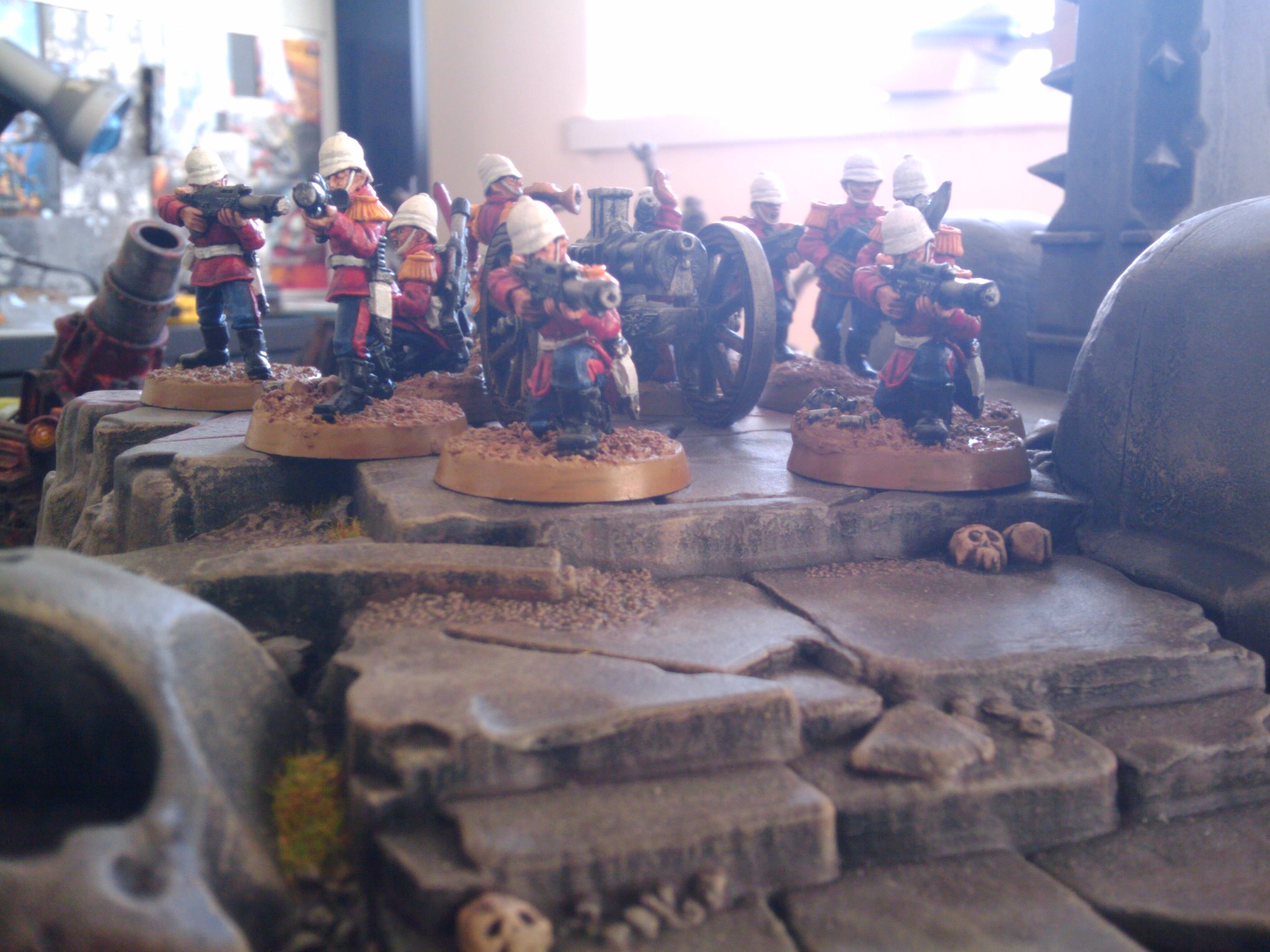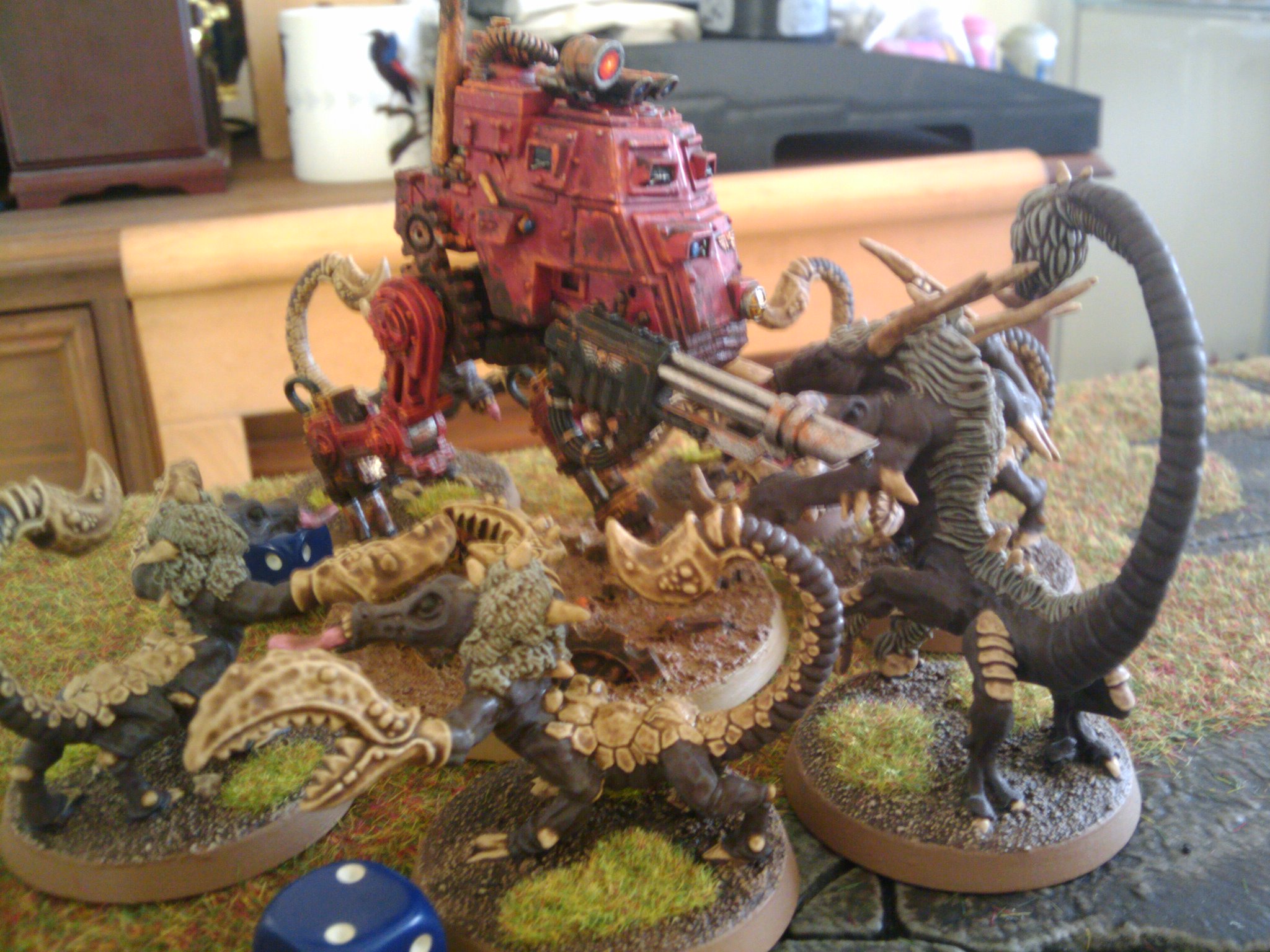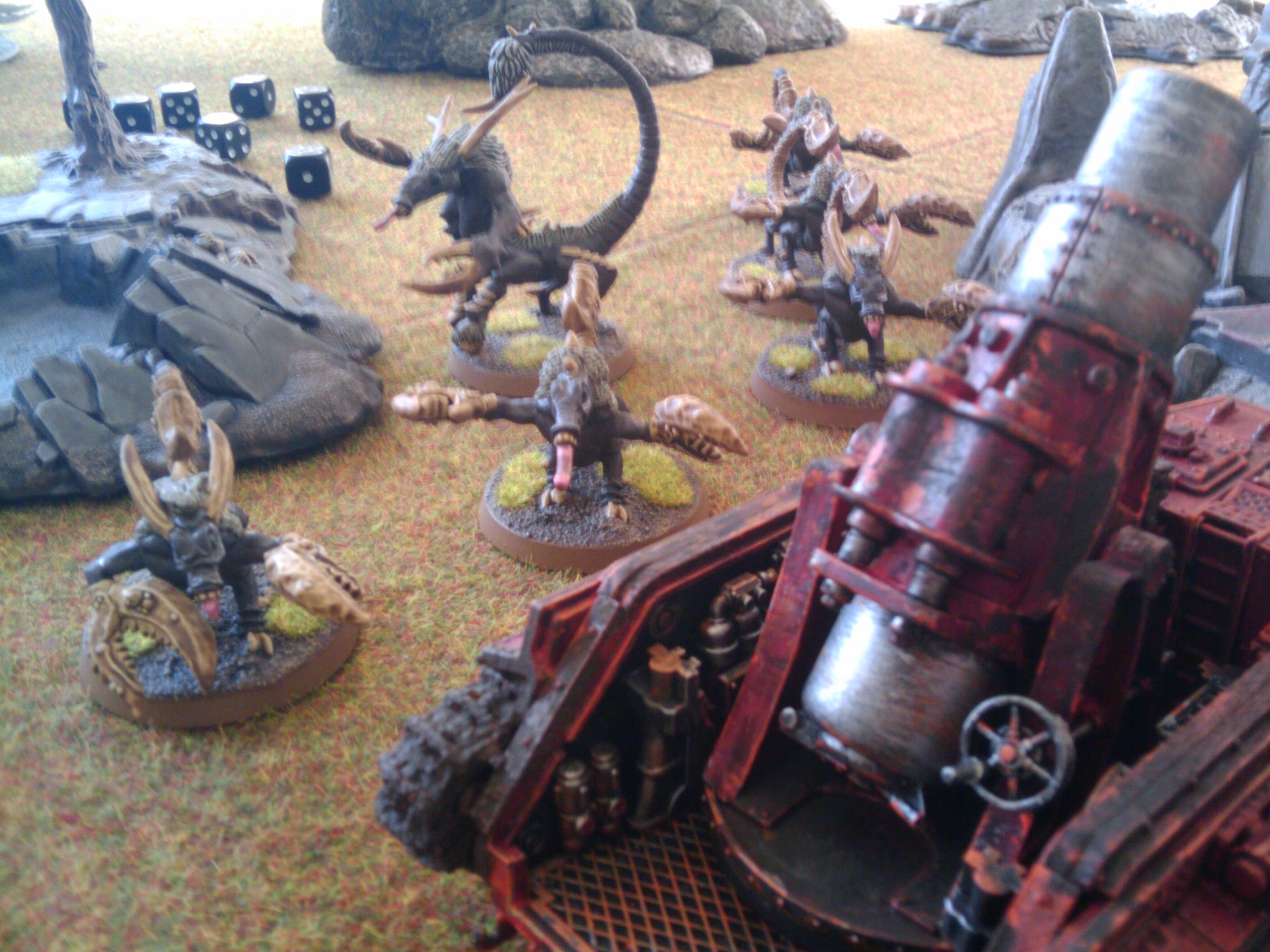 I also got an awesome day of gaming in with my pal Ross and his Stormbringers. We bodged the Stormclaw missions with our own armies – I had the Ork side with Straken in for Grukk, 10 Scions instead of Nobs, a 10 man infantry squad for Grots, and 2 sentinels and a Wyvern instead of Killa Kanz. Ross had the Spacewolves side, with a Herald on disc instead of Krom, 6 Fiends instead of Terminators, and 2 big units of Horrors instead of Grey Wolves and Blood Claws.