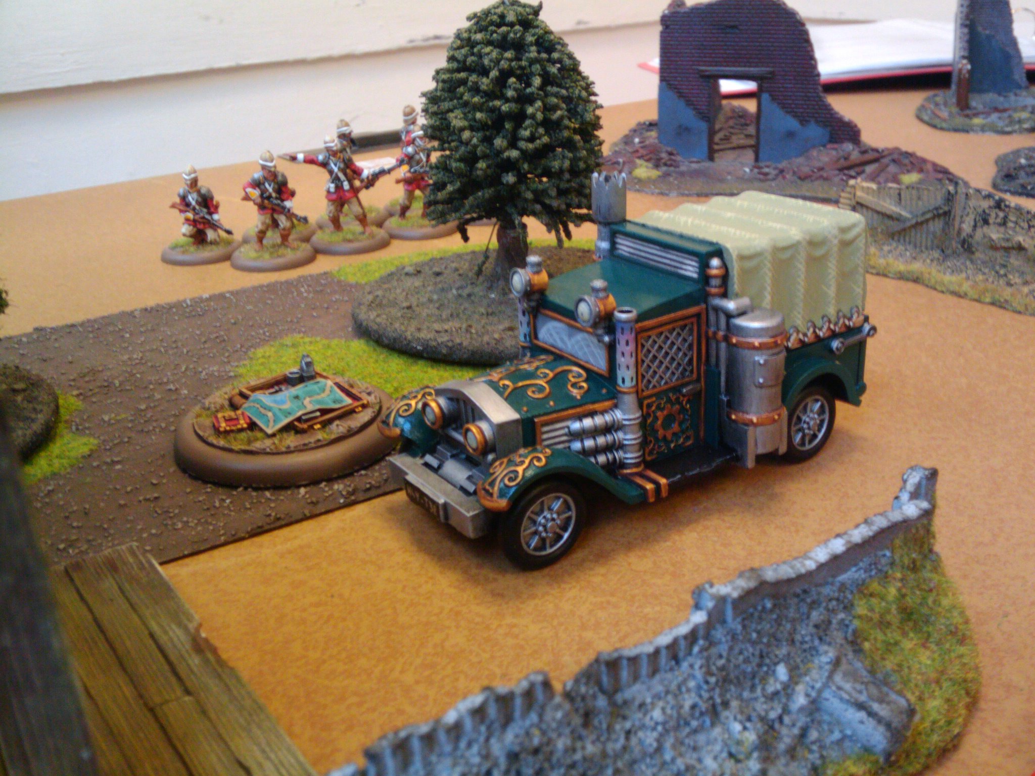 Hello chaps, I thought I’d put a quick post out – I had my first game of Dystopian Legions last night, and really enjoyed! For those that don’t know, Dystopian Legions is a steampunk skirmish game, set in an alternate timeline around the 1870’s. It’s 32mm truescale, and has some lovely models. We have the major empires of the time represented, and it looks like each is nuanced to favour a particular style of play. My pal Matt was good enough to lend me half of his Kingdom of Britannia force, and we had a good scrap with the aim of testing the rules and having a laugh. I should point out that Matt only has one or two games under his belt, so we were referring to the rules a lot :-)