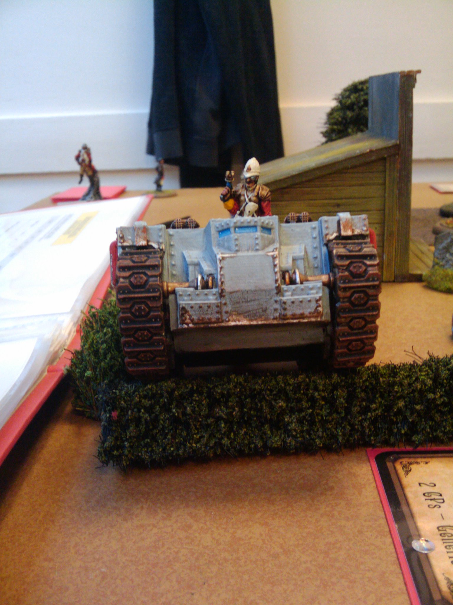 The first thing that stands out is the per unit activation, so it needs more thought than 40k. Second thing is the really cool dice mechanic… 4’s and above are (usually) successes, and you use different coloured dice (depending on what you are firing, range, etc.), while 6’s usually apply bonuses. This is quite cool, and can produce some outrageous shooting with a bit of luck, especially on the red dice! Another thing that I noticed was that you need to be a bit more thoughtful about facings, fire lines, etc. It’s a bit more to think about when compared to 40k, but is handled nicely in game. It flowed well, and would be even better with a bit of practice. There is a nice ‘orders’ mechanic for buffs & debuffs at play as well – I got the feeling that mastering this would go a long way to getting good at the game… the term ‘easy to learn, difficult to master’ springs to mind. Oh, and tanks are crazy-powerful in DL, (as well as looking f***ing awesome).