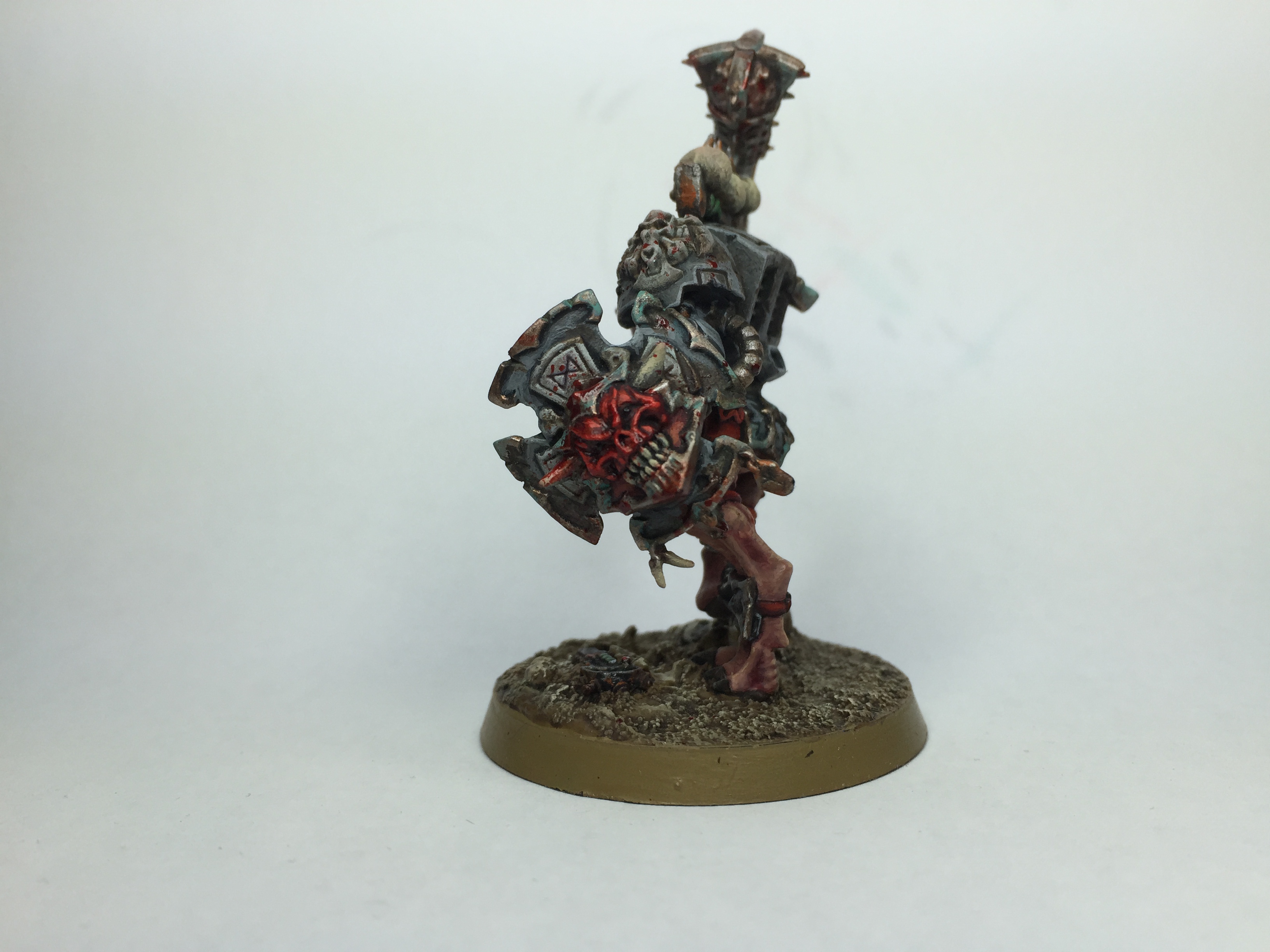 He was great fun to build – I used the Bloodletter legs & dog-head from the Wrathmonger kit, and a bit of work on the shield & a weapon arm swap. I was concerned how well the dynamic legs would go with the Terminator body, but I think that the bare arm counters the more static nature of the power armour, and gives a pleasing overall pose. Paint-wise, I went with the same dark grey armour, but had fun with all the extra skin on show, blending him up from a deep crimson wash to give a suitably grim and chaotic look. Here are some more pics (taken with my shiny new iPhone):