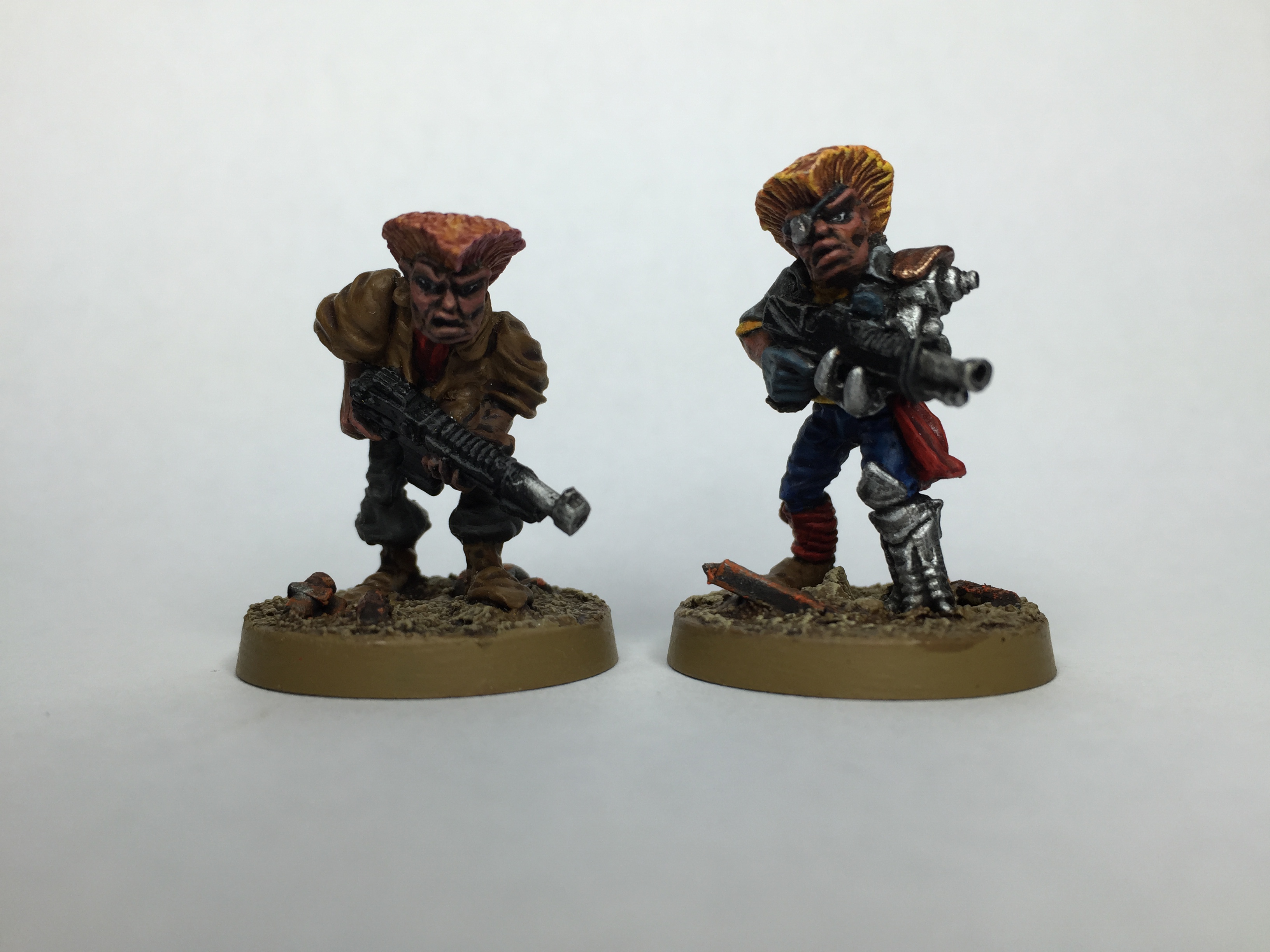 Another point of interest is the guy on the right – his leg had me scratching my head… I just couldn’t make out if it was supposed to be biological or mechanical! A quick check on some old flyers with the full range painted up confirmed the latter, which makes more sense and goes nicely with his bionic arm… whether his bionics are xenos in origin is open to speculation! He is going to be at least a champion/sergeant level character, with bonuses for his bionics in RT, (or a power glove in 40k).