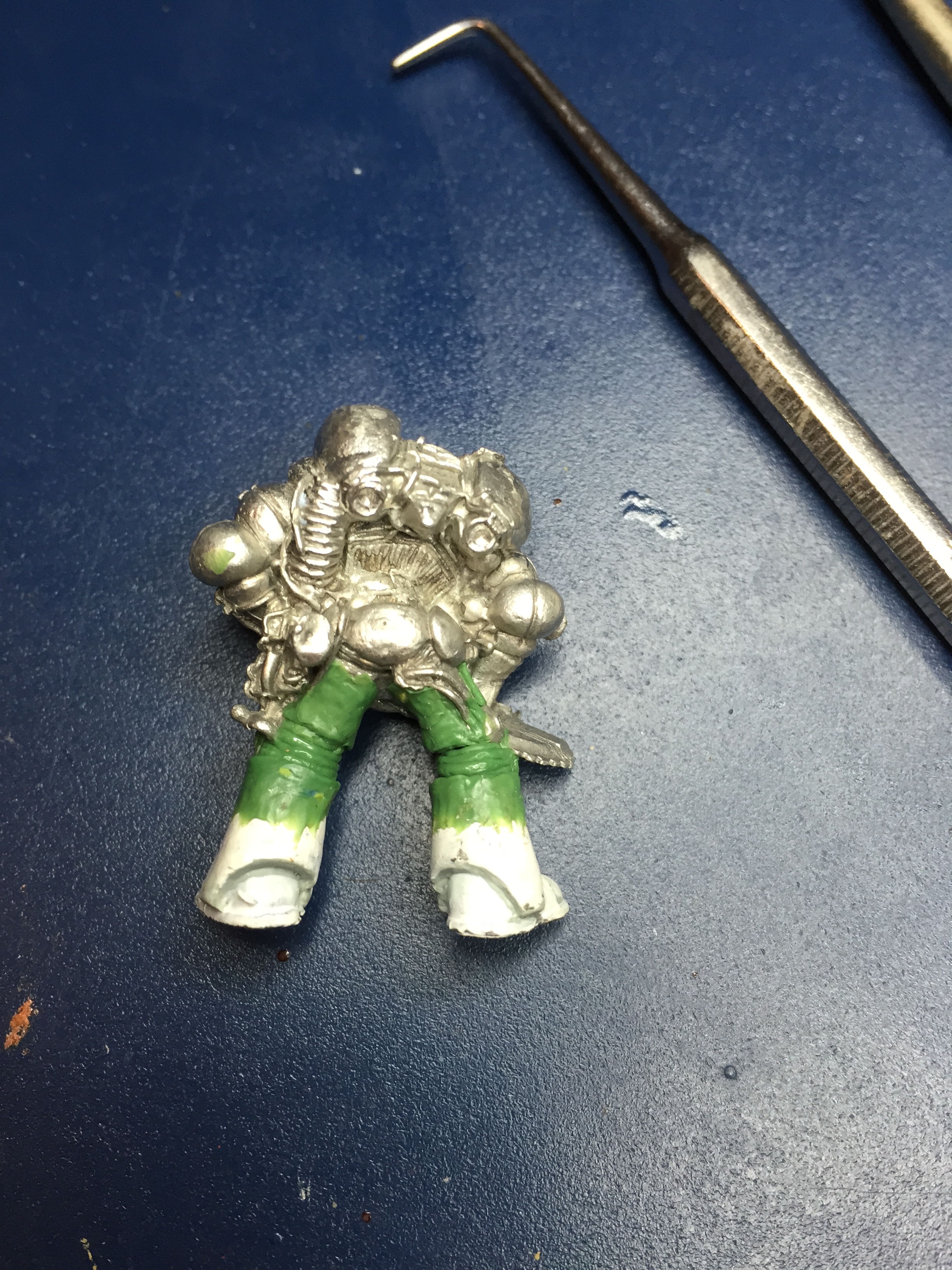 So, after much soul searching I took the plunge and booked my LE10 in for surgery. A pair of Mk8 Marine legs (from the original ‘Errant’ sculpt, 1991?) were sourced & dry fitted. I had to really bulk out the thighs & knees with GS to make it look ‘right’, and my undeveloped sculpting skills were sorely tested! After much head scratching and faffing around, I arrived at this point: