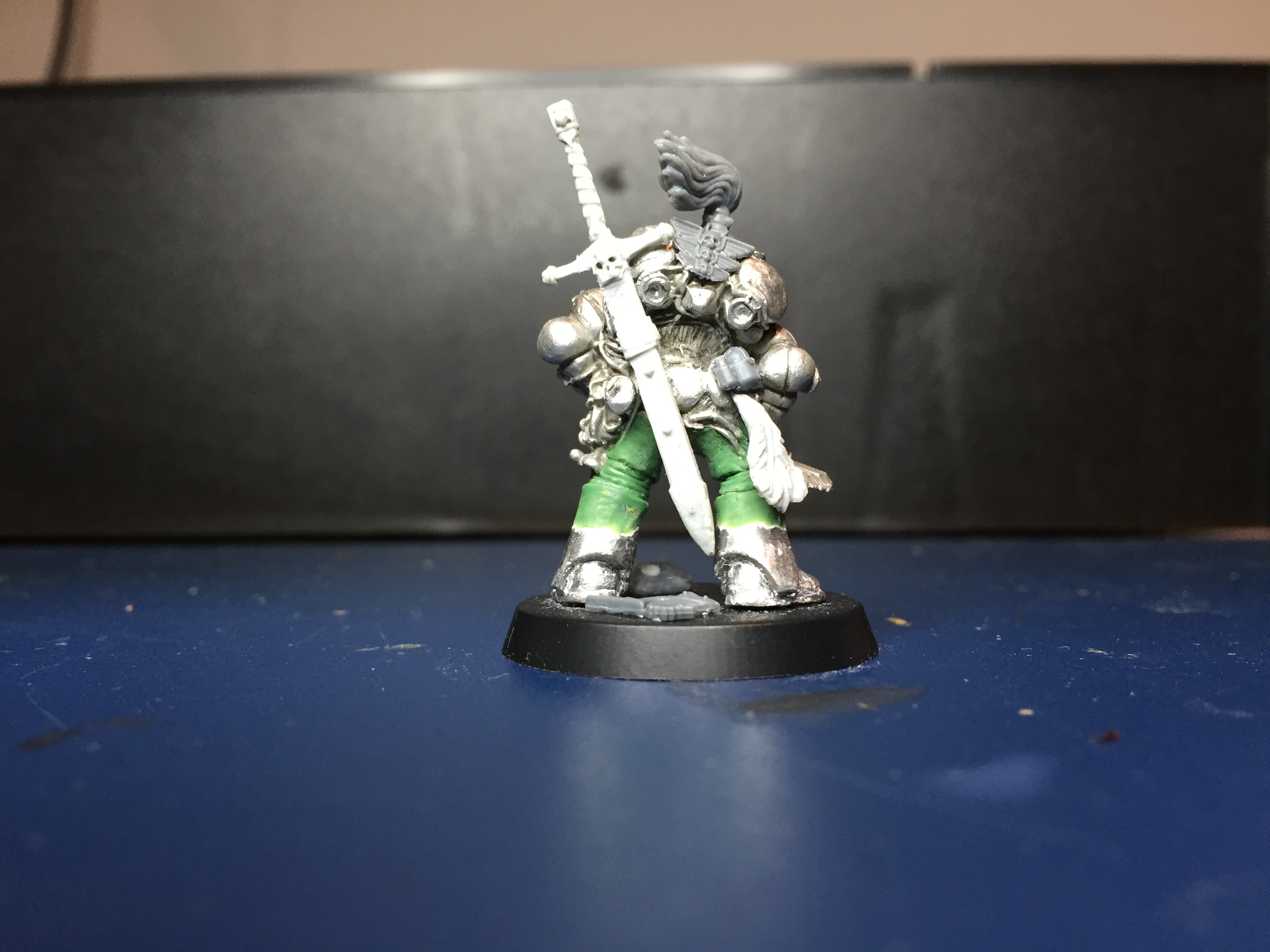 Once I was happy with the proportions, I spent some time stripping the paint off the legs… (yeah… really wish I had done that first JB!), and filing the GS as smooth as possible. I also started adding bits and bobs to the model – some Imperial iconography, grenades, and a badass sword. I also found space for a cool space feather, (no doubt some valuable and exotic trophy), and a funky plume (a nod to the picture of Rogue Trader ‘Jeff Zuckerman’ in the book of the Astronomican). I also added a 32mm base. So here he is at the moment – still some way to go, but hopefully you get the idea: