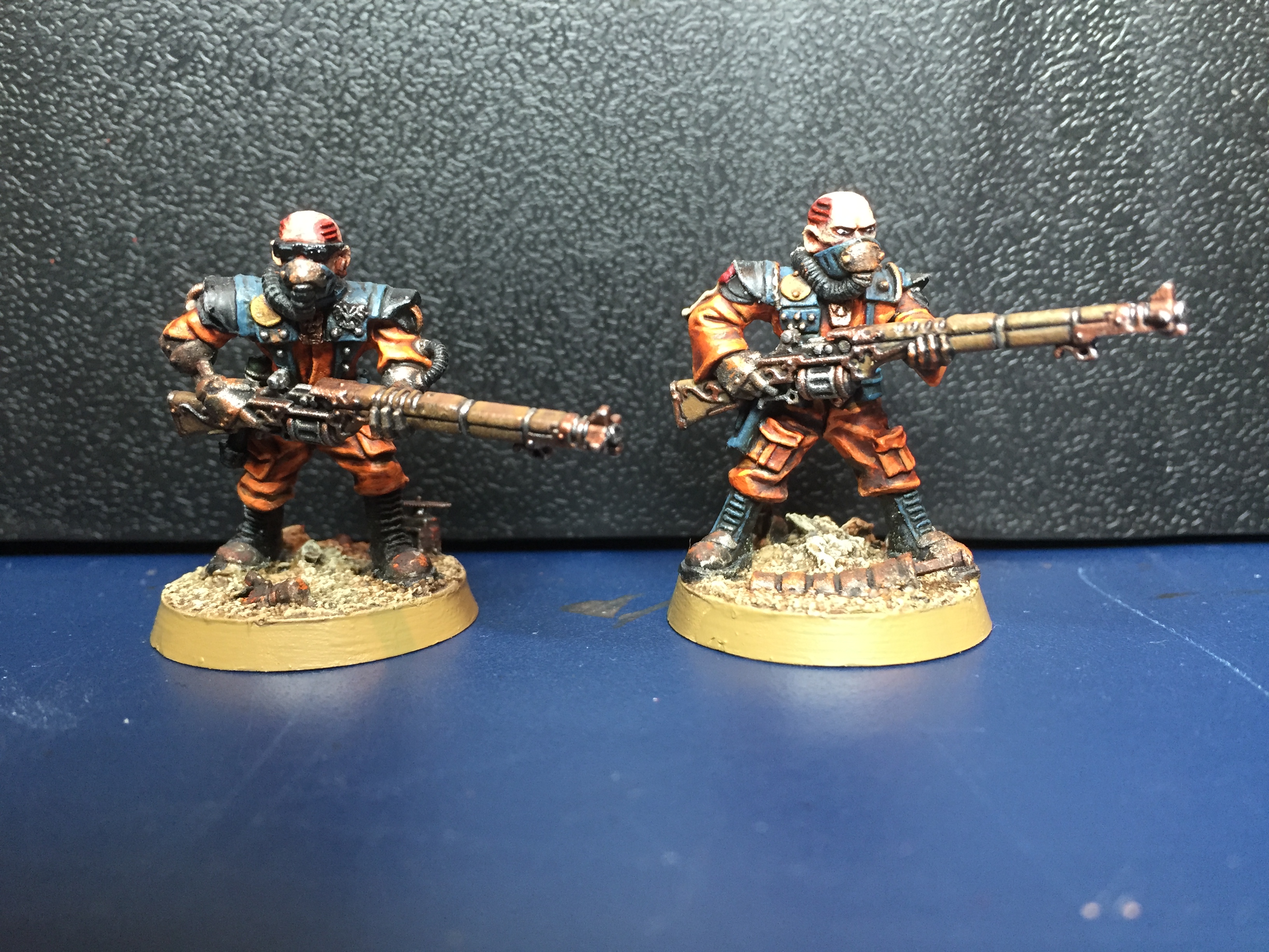 Happy Wednesday folks, a very quick one from me today – I finished the last of my ’91 Marauder tech gangers with modern AdMech arms & weapons. These guys are going to be part of the Agentia Scrutator salvage squad I mentioned in my last post, and they are also the last of the ‘half-finished projects’ from my pile! Yey! My decks are clear! Here they are as a pair, and then the whole group together: