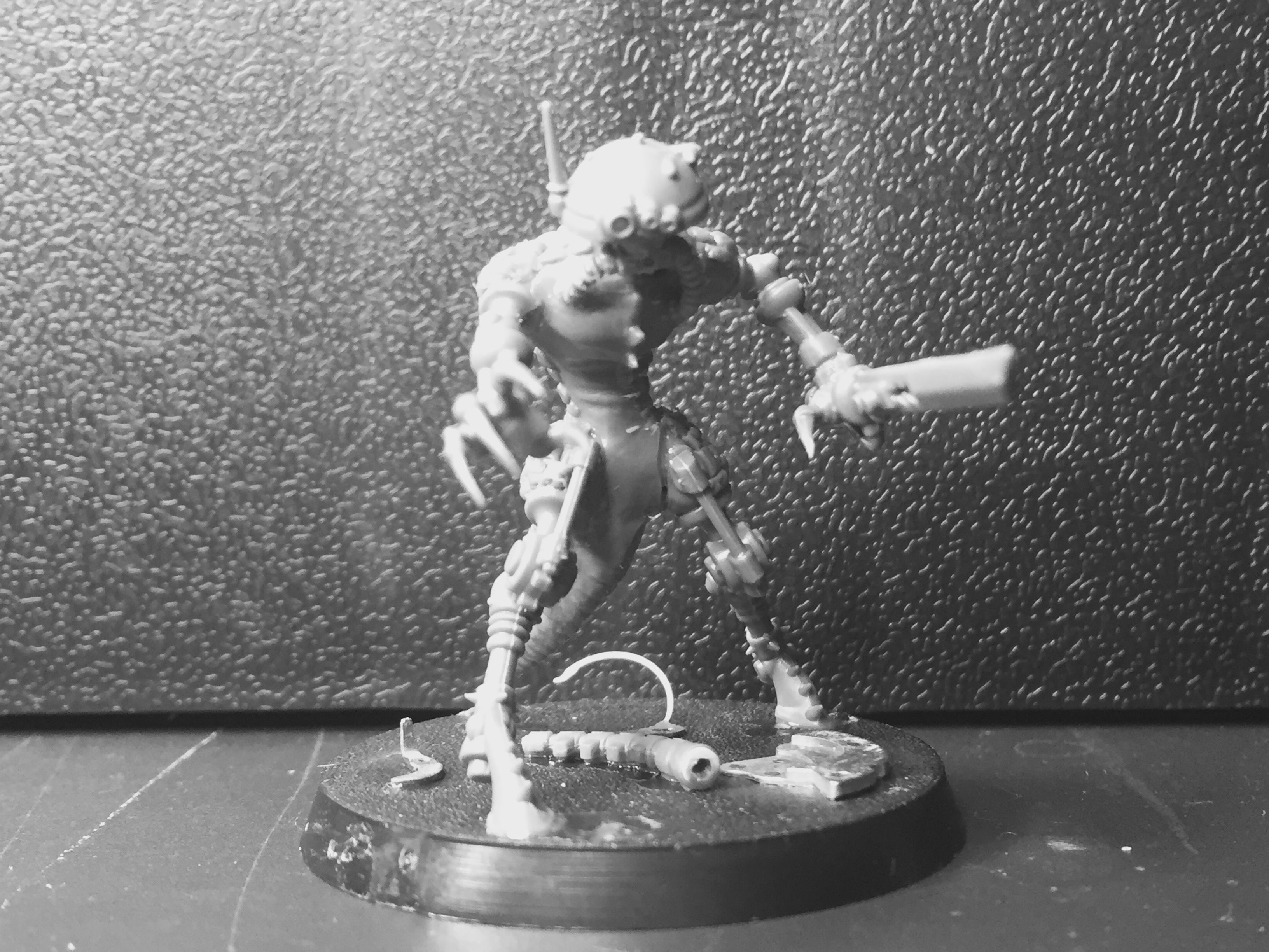 Pretty nasty looking, right? It’s a fairly simple mix of Lizardman & Ruststalker bits, but is the latest in a long line of (mostly crap) attempts at doing 40k Lizardmen… I really do like this guy & may end up expanding this idea.