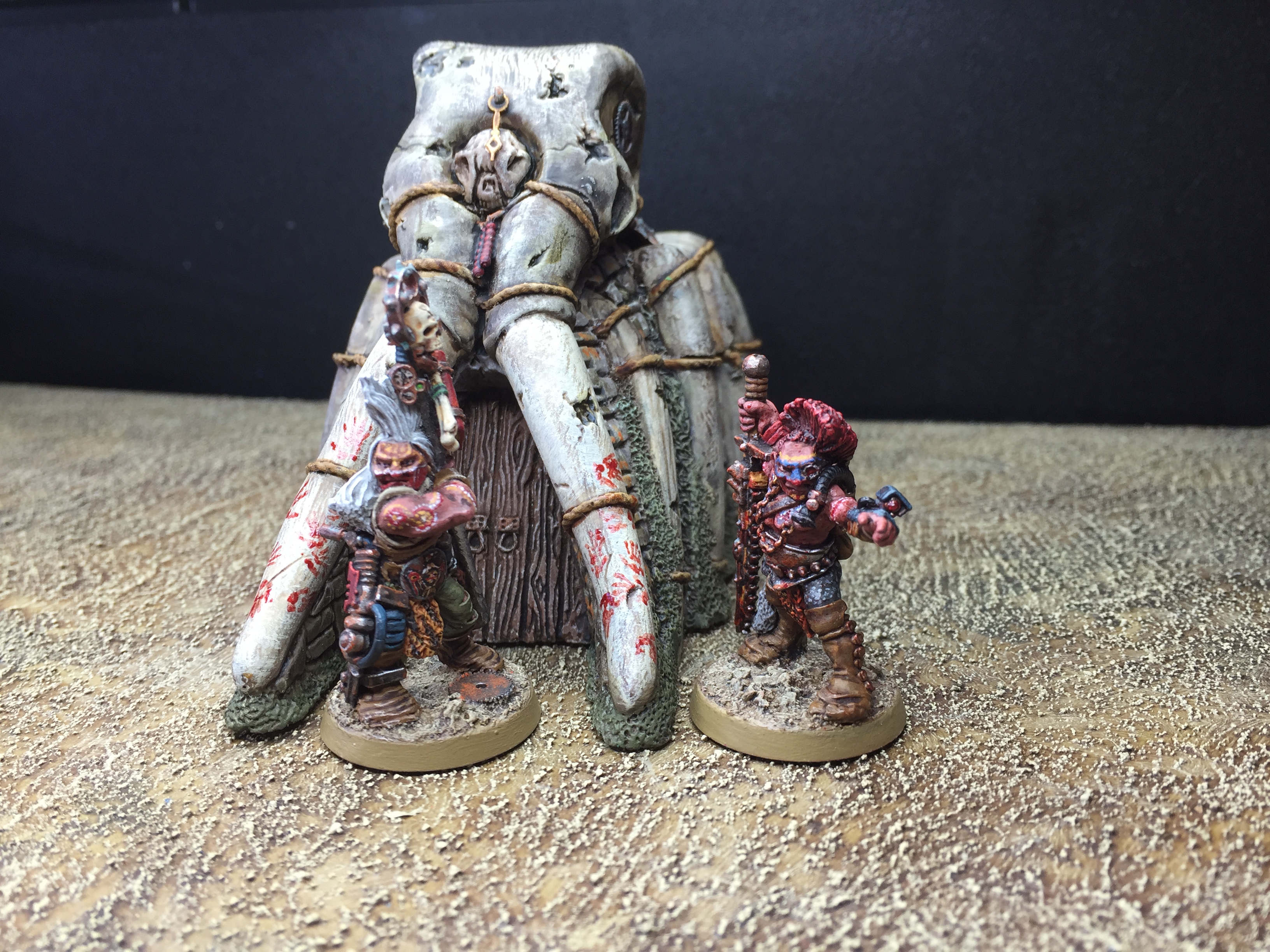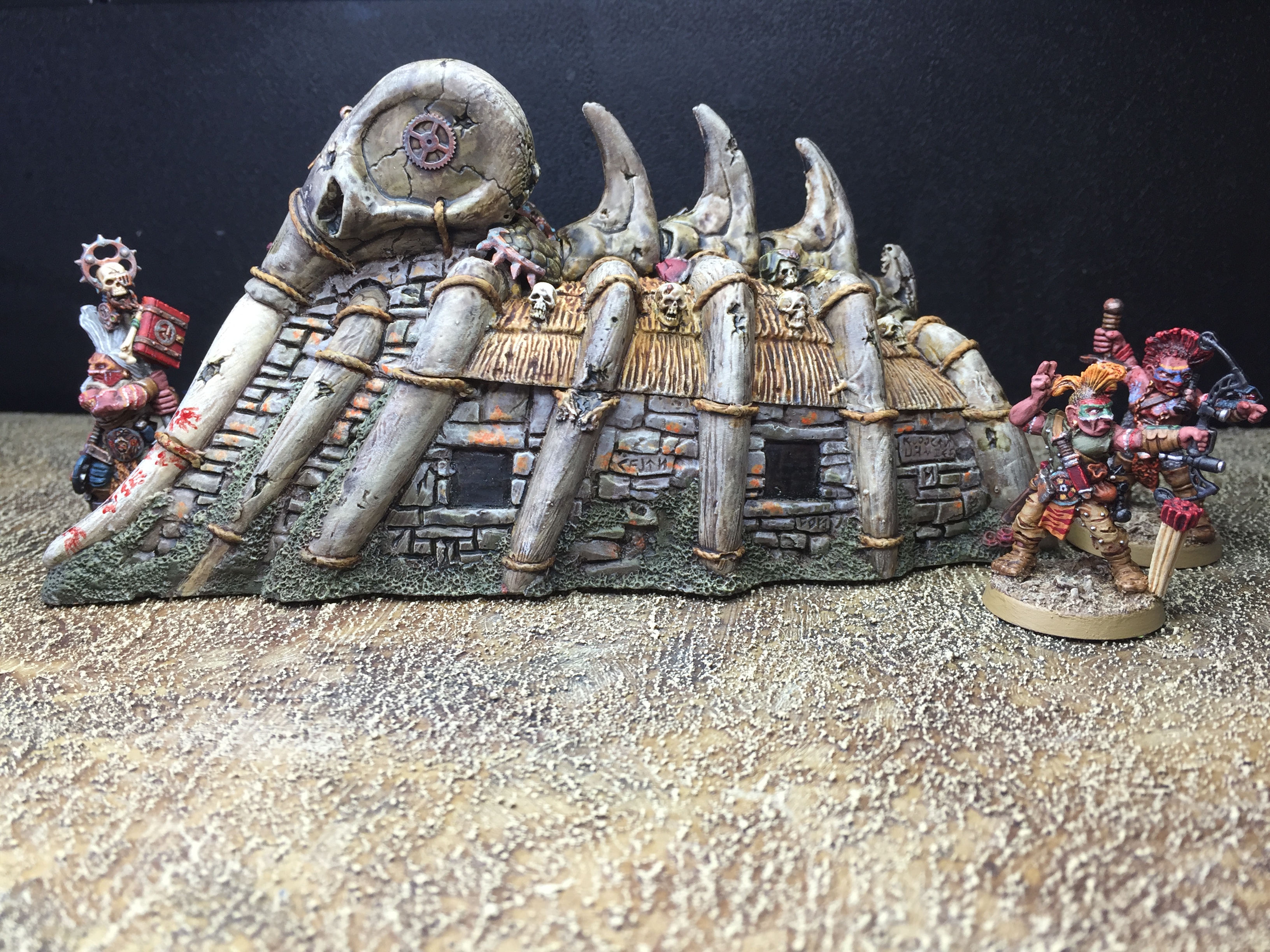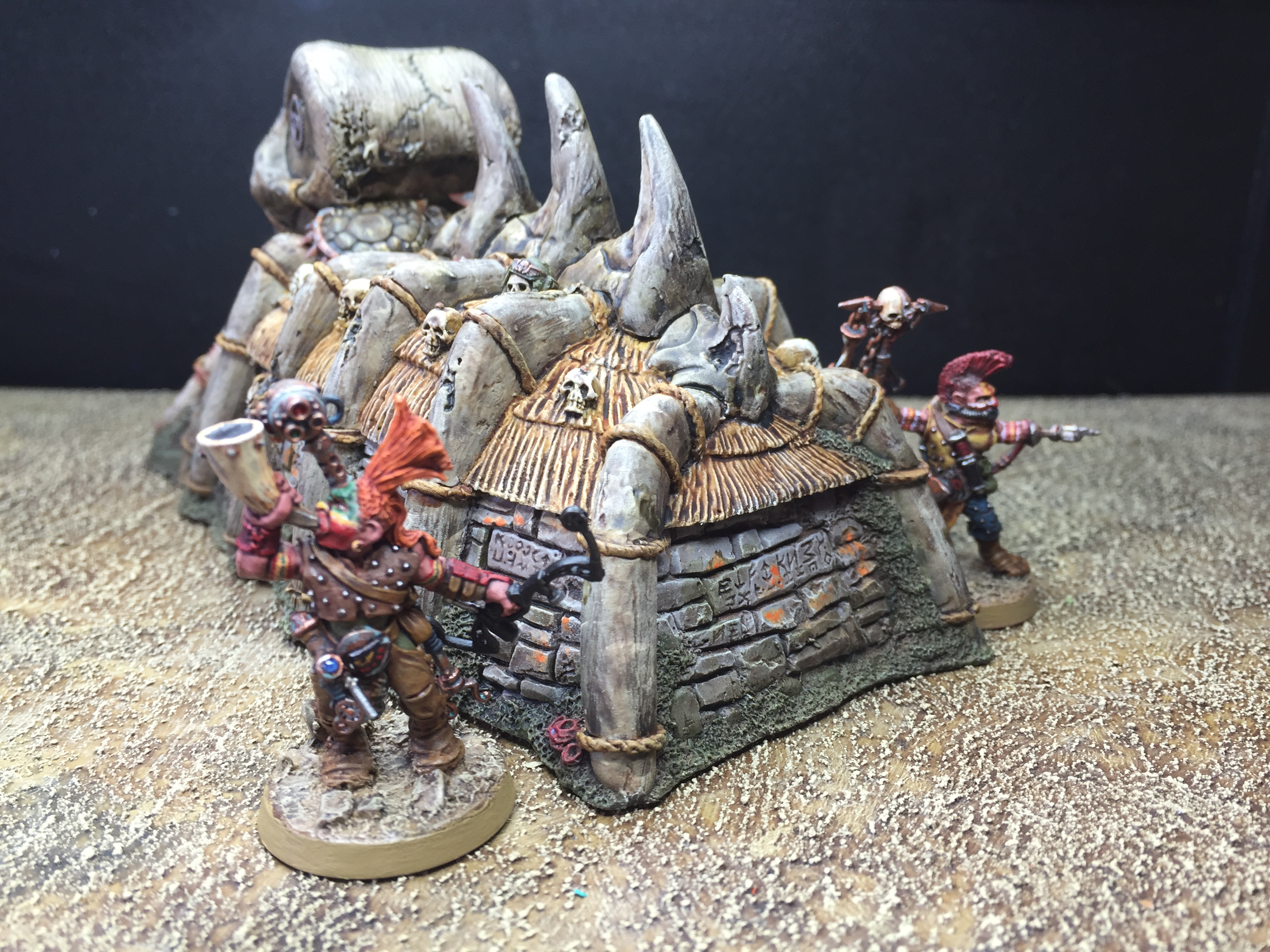 This is a set of ‘Barbarian Huts’ from Scotia Grendel Productions, and is a bit of an indulgence if I am honest… I wanted some scenery for my Techno-barbarians, but didn’t want to go all ash-waste/mad max with it. The buildings are solid blocks of resin, and they took some cleaning up and a bit of repair here and there, but the overall quality and detail is pretty darn good! I’ve embellished the huts with a scattering of 40K bits and bobs, made repairs where needed, and applied the base coat thus far. I also pushed ahead and finish up the ‘Barbarian King’s Longhouse’ to nail down the look. It is the biggest and most complex piece, and I’m pretty chuffed with how it came out. I had great fun with the lichen and moss on the stonework, and I shamelessly stole the ‘bloody handprint’ idea from Krautscientist and his excellent Chaos Knight, the Warrior King ‘Gilgamesh’. I imagine the warriors of the Azmaa ritually cutting their hands and adding their prints for luck as they head off to battle… “Witness Me!!!”   Anyhow, here it is, along with some minis for scale: