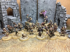 30 including command for maximum buffs – each mini gets +1 attack at unit size 20, and +2 attacks at unit size 30. Having a command section is a good thing as well – the champion has +1 attack, the musician guarantees a minimum 6″ charge , and the standard bearer returns D6 slain models to the unit each turn!