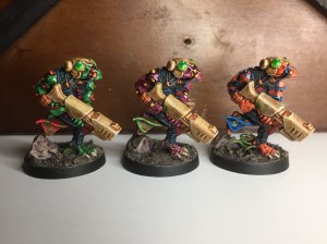 Hello there! A little bit of painting to share with you all today – some troops for my new Eru-Kin project. The Eru-Kin Kickstarter provided a wealth of cool and unusual sculpts to choose from, including a batch of 4 sculpts that form what I look on as ‘core’ tactical troops, (‘Braves’ in the RT Slann background). I’ve got three of each sculpt, and decided to batch paint them one group at a time, (so the next few posts are going to be broadly similar I’m afraid). In the interests of trying to make them look a bit more individual, I have incorporated some of the old RT fluff regarding skin colour & patterning and exotic animal hides – there is some rather extreme colour experimentation along the way… I’ll be honest, there are some colour combos that don’t exactly rock my world, but hey-ho, it’s an army of space-frog-lizard-men things so who am I to judge! I’ve finished the first batch so let’s take a look: