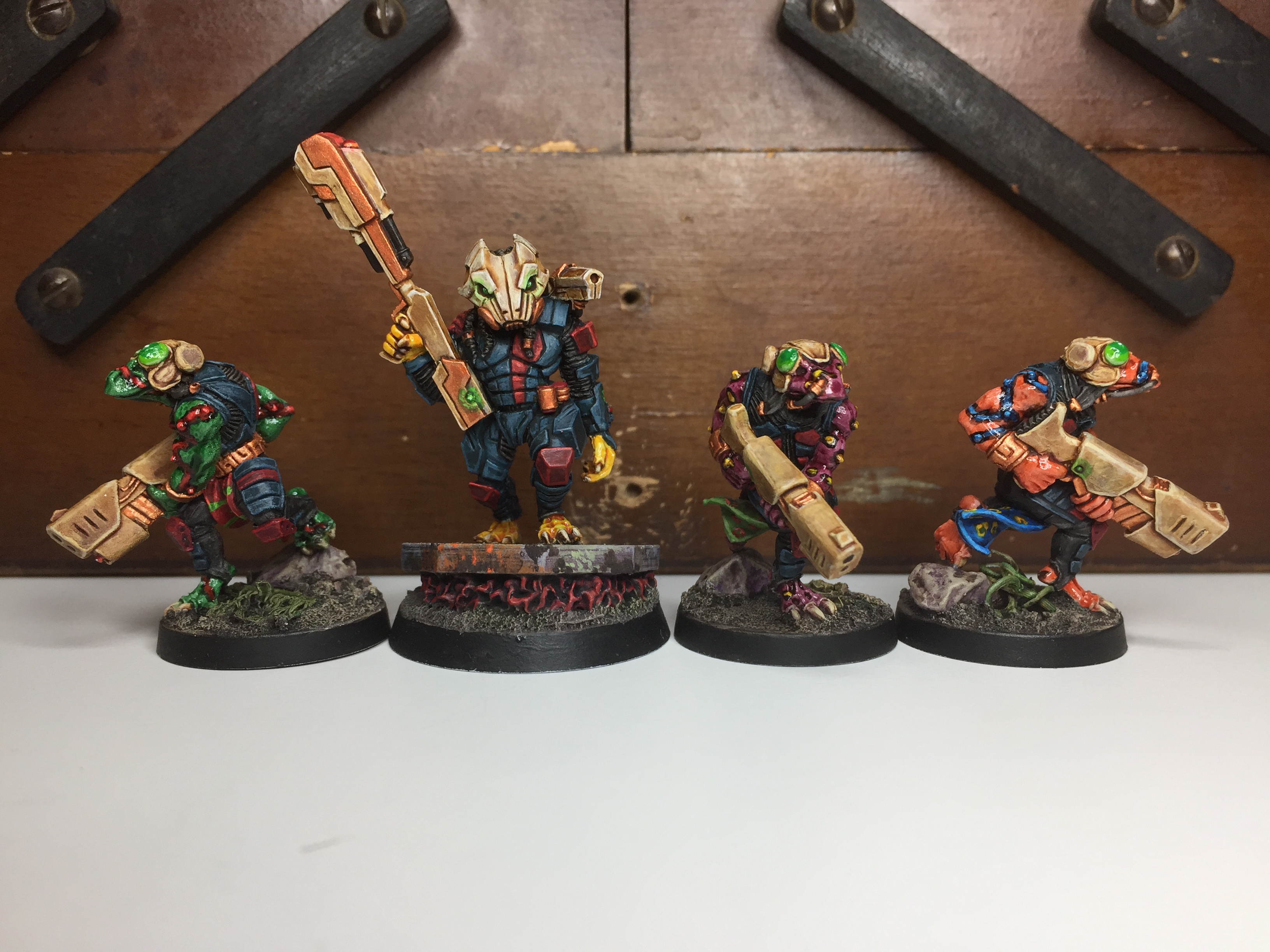 Hello there! A little bit of painting to share with you all today – some troops for my new Eru-Kin project. The Eru-Kin Kickstarter provided a wealth of cool and unusual sculpts to choose from, including a batch of 4 sculpts that form what I look on as ‘core’ tactical troops, (‘Braves’ in the RT Slann background). I’ve got three of each sculpt, and decided to batch paint them one group at a time, (so the next few posts are going to be broadly similar I’m afraid). In the interests of trying to make them look a bit more individual, I have incorporated some of the old RT fluff regarding skin colour & patterning and exotic animal hides – there is some rather extreme colour experimentation along the way… I’ll be honest, there are some colour combos that don’t exactly rock my world, but hey-ho, it’s an army of space-frog-lizard-men things so who am I to judge! I’ve finished the first batch so let’s take a look: