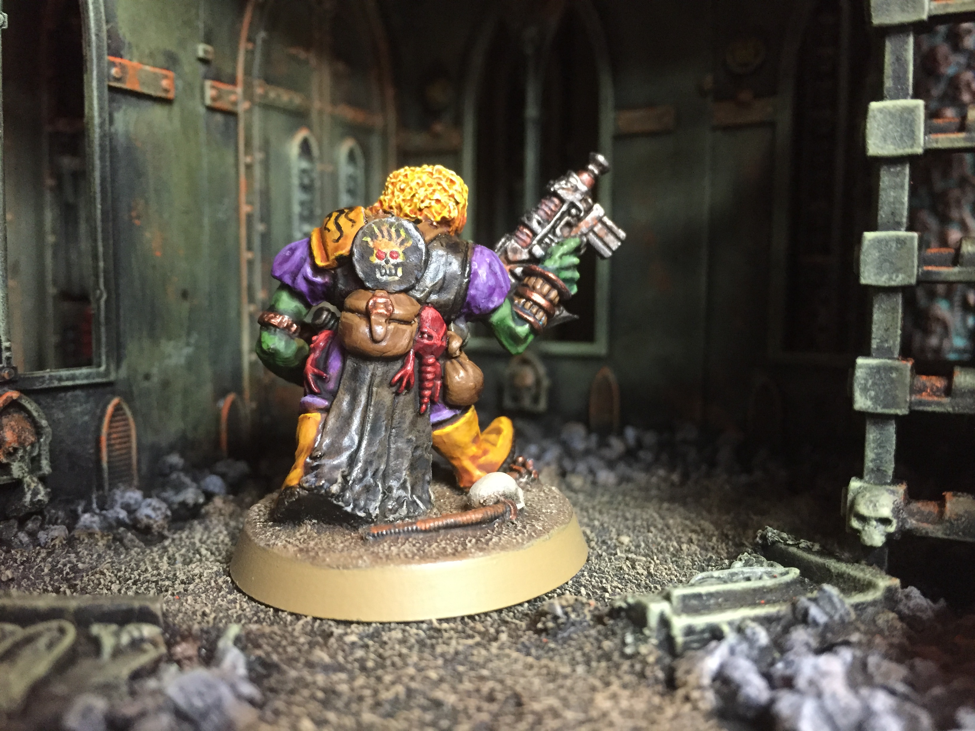 In terms of painting, I wanted to make Fogg quite flamboyant, so went with bright yellow & purple as the main theme – I love his snazzy yellow boots! His hair got strongly emphasised, as did his crazy eye, complete with subtle glow effect. Other than the slight gripe with the too-subtle vortex grenade, I’m really happy with this guy, and I think he reads well as a crazy-assed psyker!
