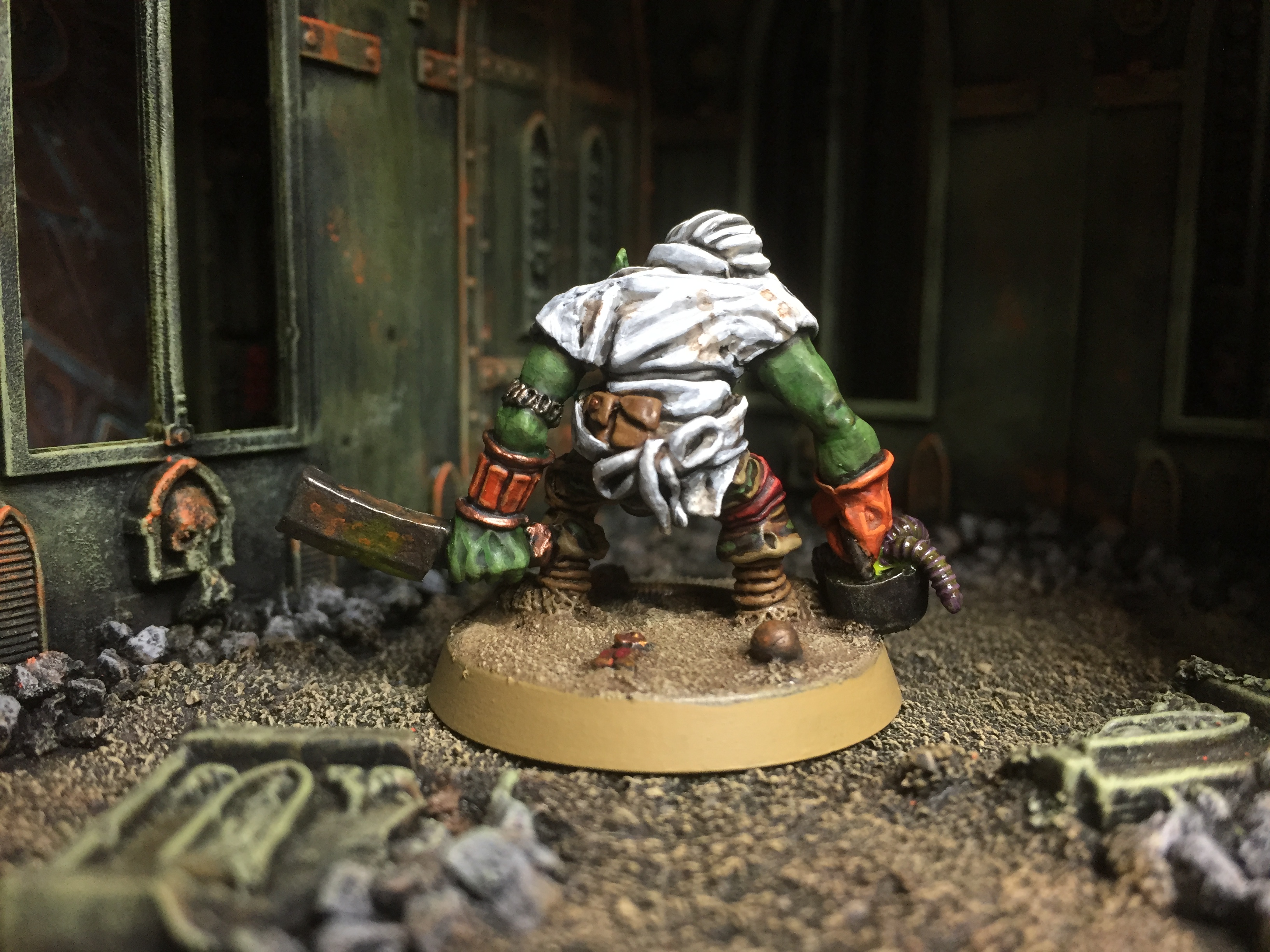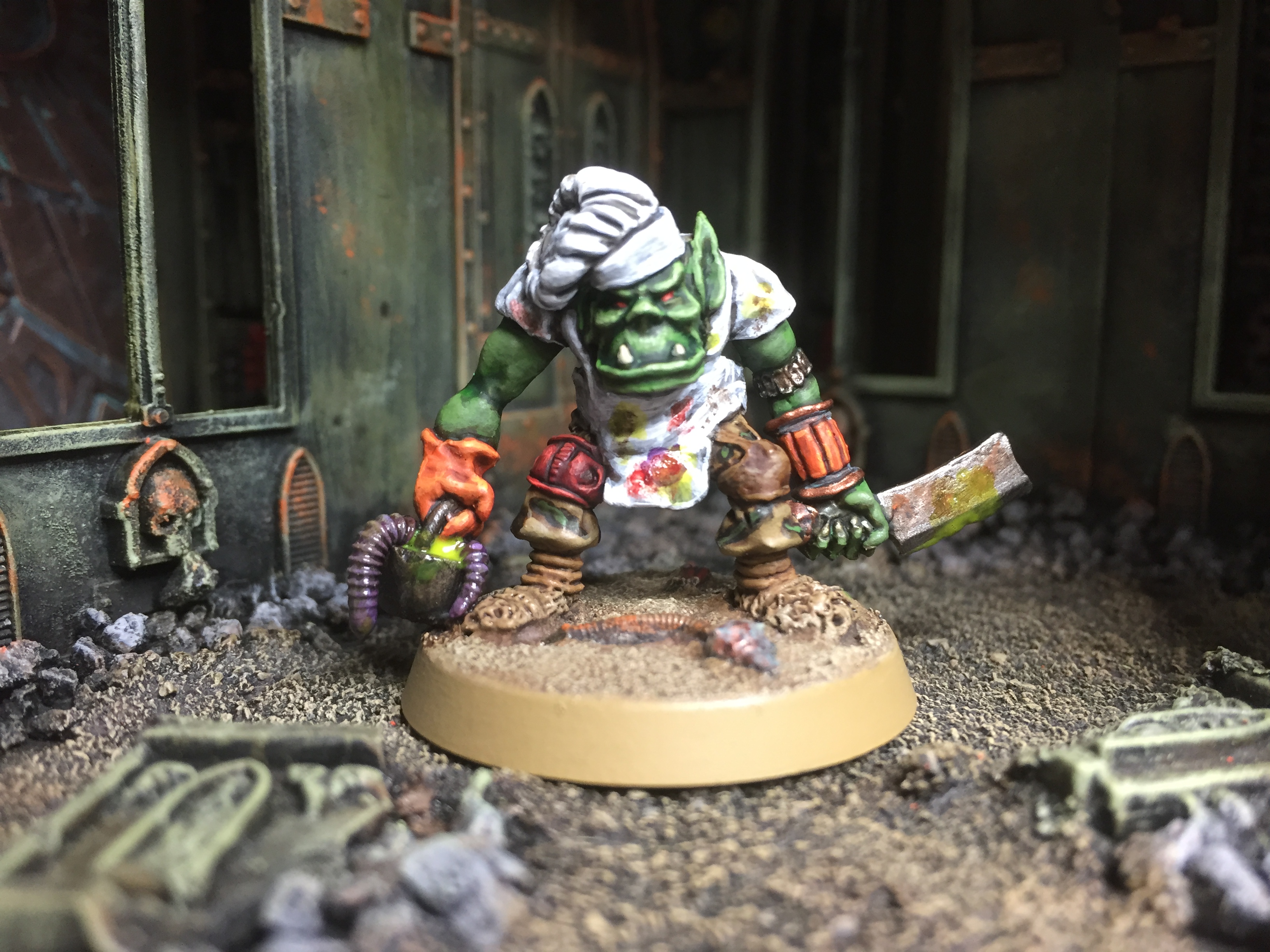 Ram’s-Eye already had his cleaver, so I just needed to sculpt his chef’s apron & hat, and his right forearm & cooking pot (complete with squig gribble-stew). I didn’t give him a gun, (he’s more of a skulker than a fighter), but I’ll do a bunch of kitchen squigs for him to fight with in-game. I hope I get enough players to warrant using him!