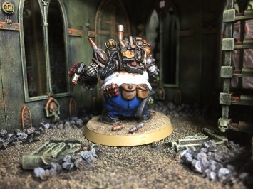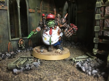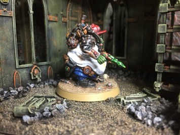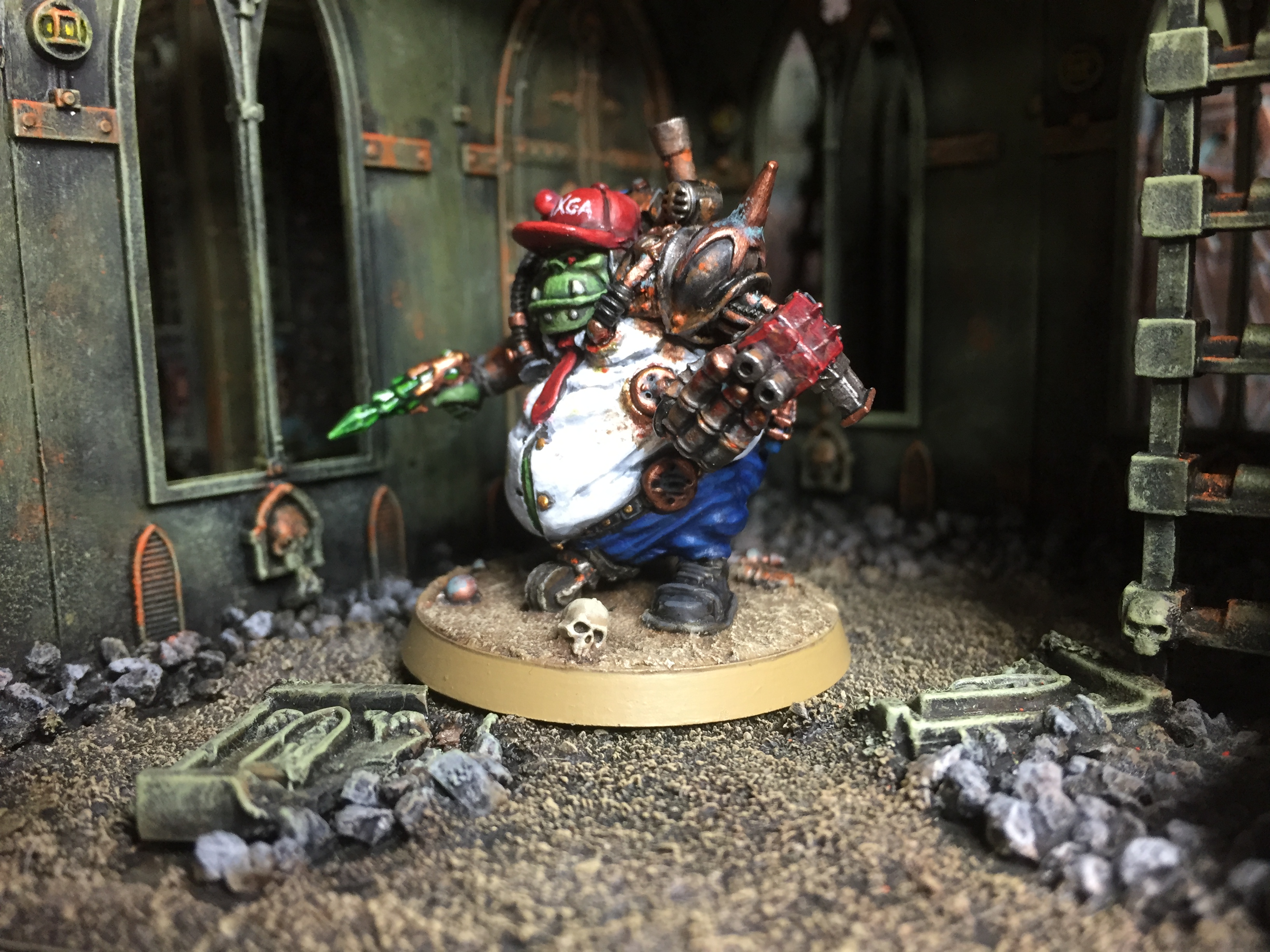 Appropriately for the head honcho, this was a very involved and complicated conversion… I started with an old Judge Dread Fatty, and added the shoulders & head from the Evil Sunz Nob from the ‘Ere we go range of Orks. His left arm comes from the mini I used for Rulko, and he has twin Bolt pistols mounted on the power glove (otherwise, how would he ever be able to use them!?). The right arm was donated from a damaged LE1 Space Orc that I picked up on the cheap – note the delightfully small hand ;-) I also changed the gun out for a new Neuro-disruptor from the Harlequin mini. Next, I added a backpack from an ‘Ere we go Mega Armoured Nob, and started adding cables and other gubbins to the mini. I wanted the backpack to look like some sort of primitive life support system for Kulo, as well as the generator for his Powerglove. Finally I sculpted on a few details – more suitably sized feet, collar & (power) tie, baseball hat, pouches, a holster & doodabs.