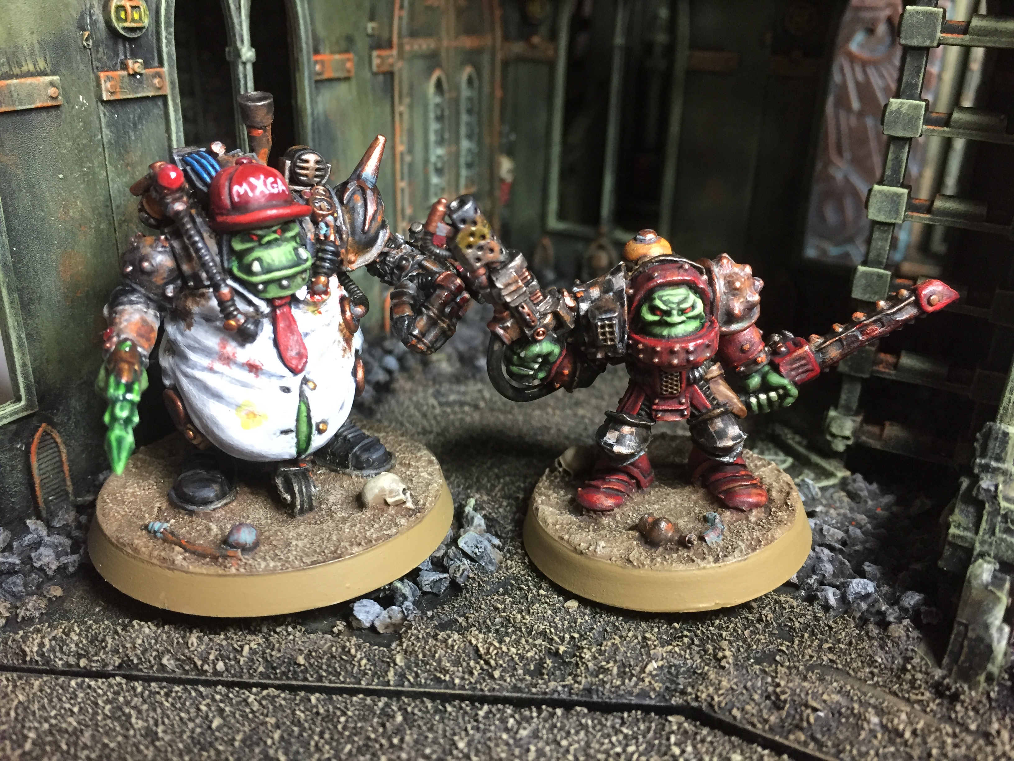 I used another classic ‘Ork-in-Power-Armour’ as the base model for Rulko, but removed the power glove & replaced it with a metal Painboy arm (donated from Doc Spleenripper!). I over-sculpted the arm to match it to the rest of his power Armour, and did the same with the Doc’s saw to make it into a Chainsword. Finally, I sculpted on a wee Bolt pistol, and converted his main gun to be a Flamer (including fuel tank on the back). It’s all quite subtle work, and I think Rulko really does look like a ‘proper’ figure from that period. He doesn’t really look sneaky as per his character description, but really, how sneaky can an Ork in Power armour actually look? I painted him up predominantly red, and with less weathering & rust compared to the other PA Orks – I figured as Captain, his kit would be better maintained than the other guards.