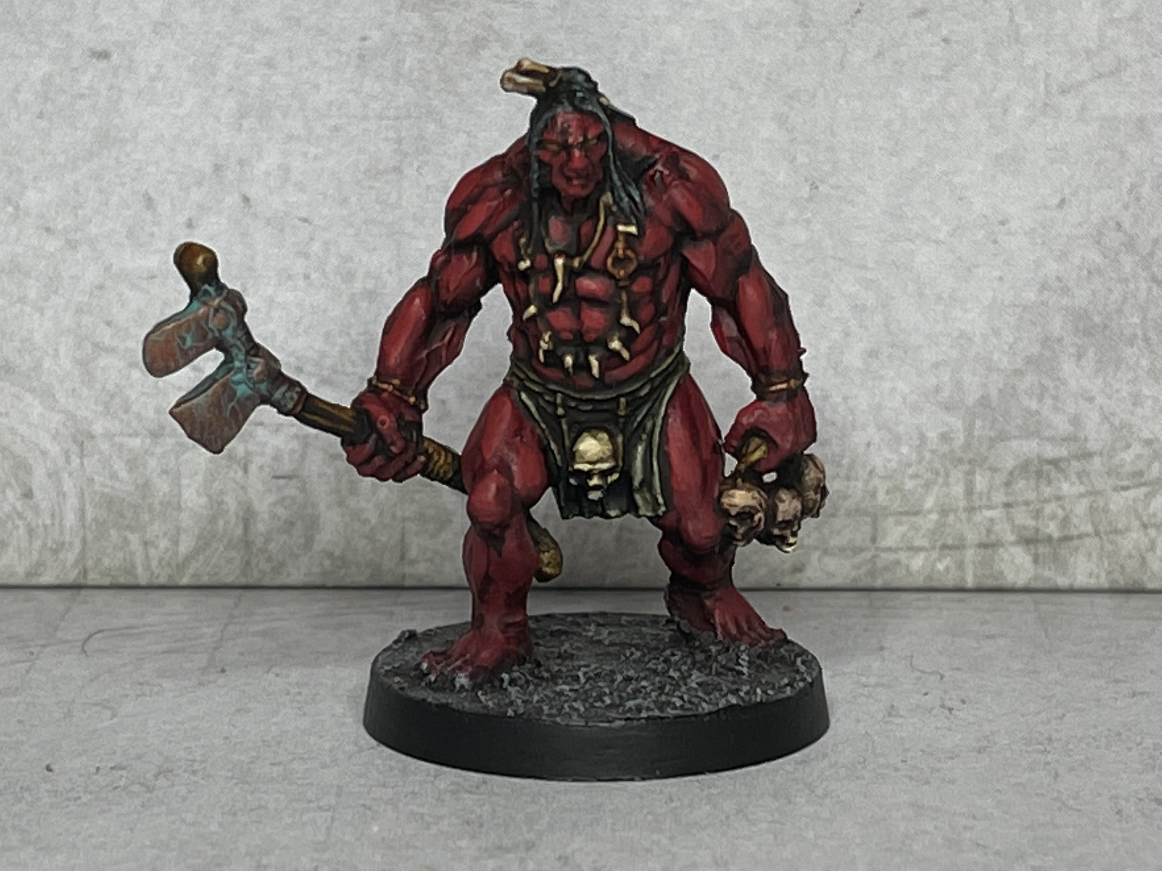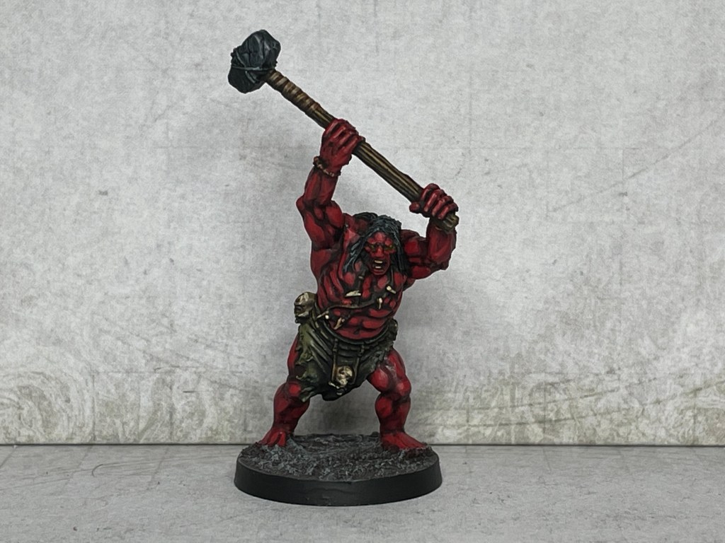 Now, a couple of months back my eldest Son, (now a fully signed-up member of the Guild of Obnoxious Teenagers), briefly exited cyberspace & asked me to show him some painting techniques. I grabbed something quick, cheap and simple – a Pict from the Conan boardgame (by Monolith). We went for a crimson skin tone just for some visual interest – a bit Uruk-hai perhaps, or maybe it’s body paint, or perhaps they he’s a bit demonic? The main thing is that he stands out from the norm in much the same way as the green skin of Orcs make them clearly ‘other’. I think the axe handle is supposed to be bone & the axe heads stone, but I went for wood and bronze respectively: