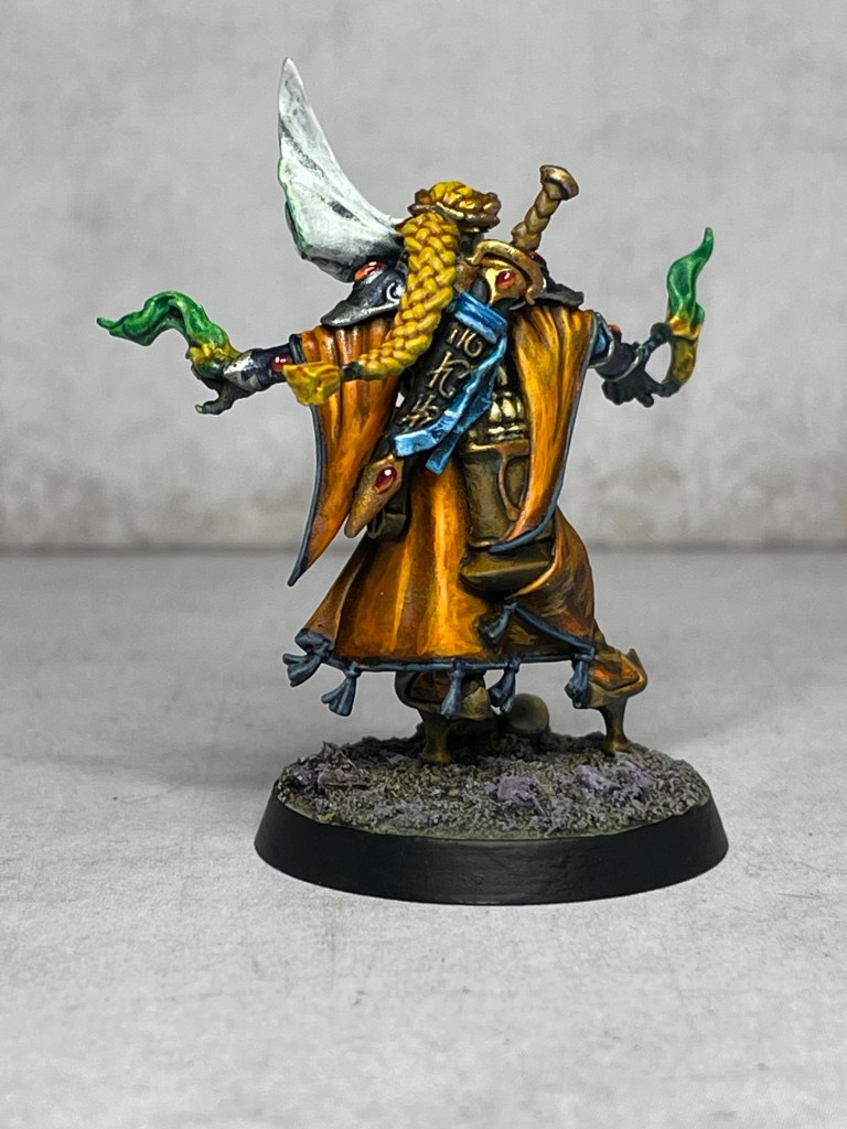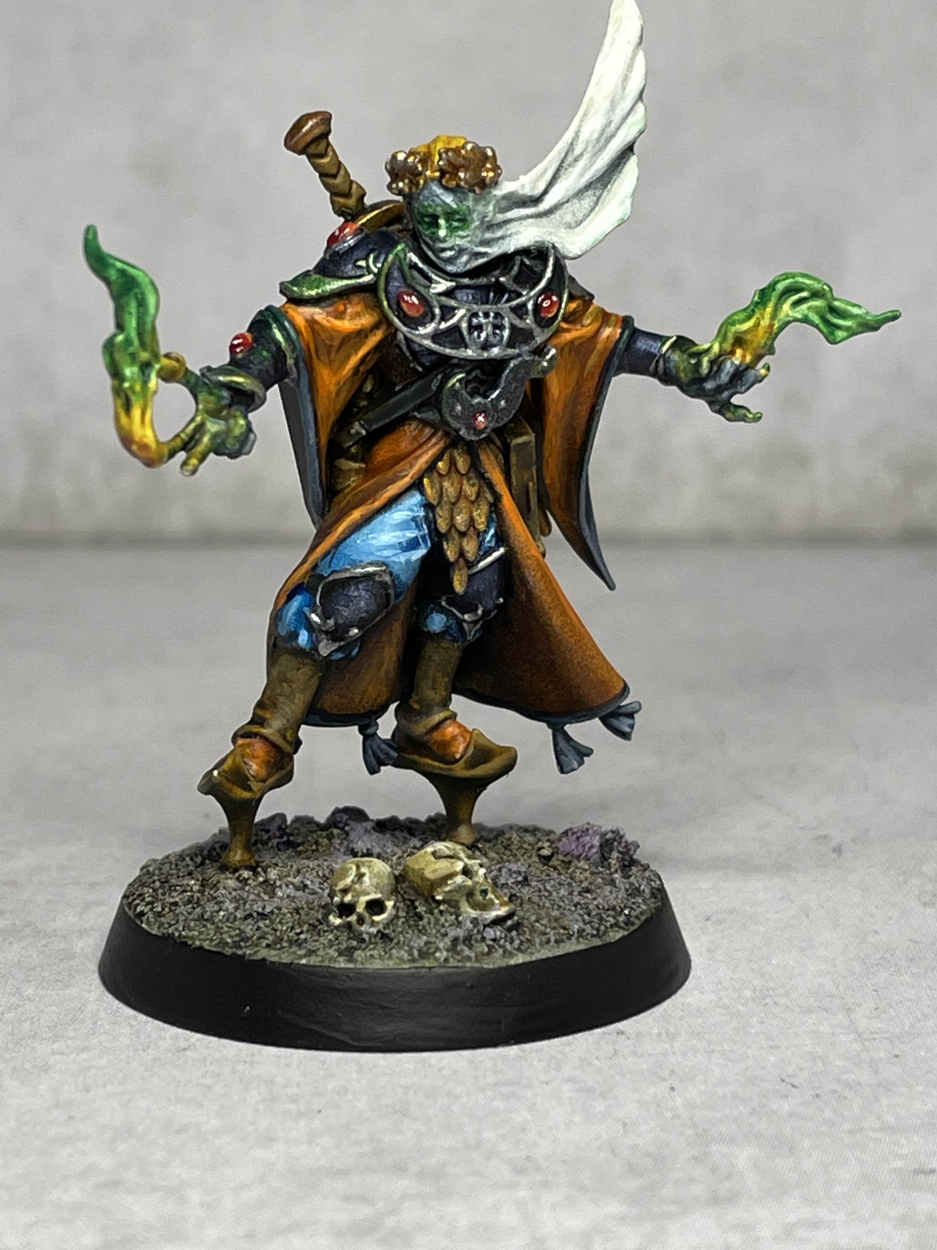 Greetings Terrans, last time I gave you an overview of how I generated my starting warband, chose my Champion stat card, and I shared pics of the followers all painted up. I still needed a model for my Champion, and the Loreseeker card got me looking at the Lumineth range for inspiration. I also needed a name, so a roll on some internet generator gave me ‘Scynir the Architect’, and after a bit of converting and painting, here she is: