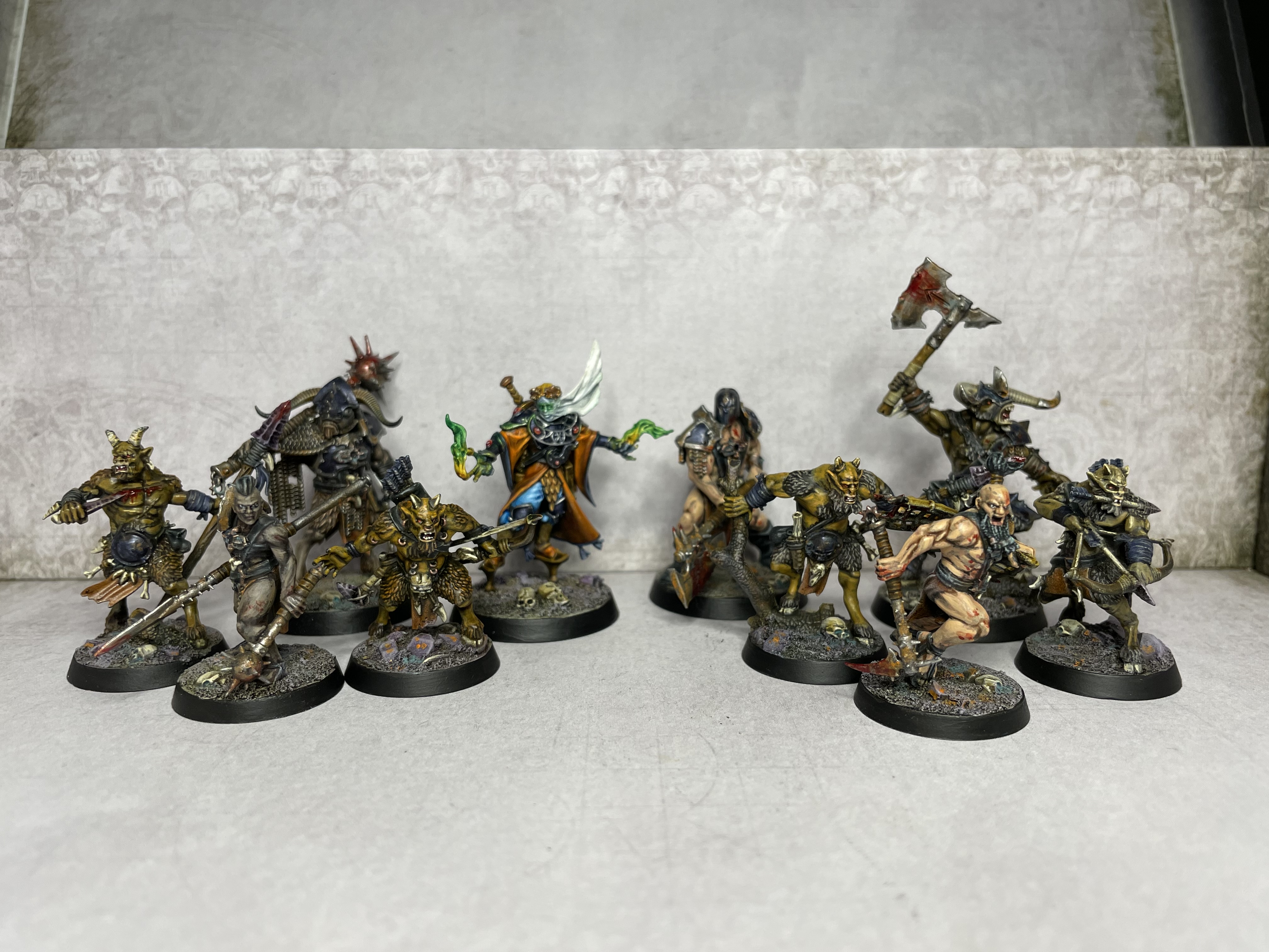 Slowly, Scynir regained her feet and her sword, and, blinking away livid afterimages, she continued to back away from the raiders. As her vison cleared, she realised that most of them were now motionless on the ground, flesh charred, low flames sputtering as they continued to feed on fat and tissue. A thick greasy smoke rolling into the air, adding to the cloying stench of burnt meat. Slowly a few of the raiders staggered to their feet – a giant of a man with a massive headsman’s axe, a pair of gladiators – one armed with spear and the other with net, and the towering Beastman, fur singed and its heavy mace gripped in massive fists.