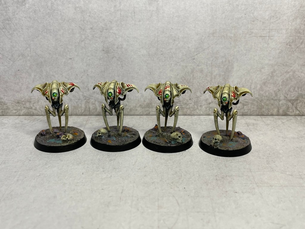I know that these are called ‘Spindle Drones’, and that they live in the Blackstone Fortress, but otherwise I know nothing about them & I have no strong opinions on how they should look. They strike me as being quite organic so I started out painting them in a neutral bone colour, but they were really, really boring… I wanted to zhuzh them up a bit & settled on splashing some pseudo-tribal blood markings around. No idea if that fits with the fluff, but zero fucks given – it stops them from being so boring and that’s the main thing. Here’s the four of them together: