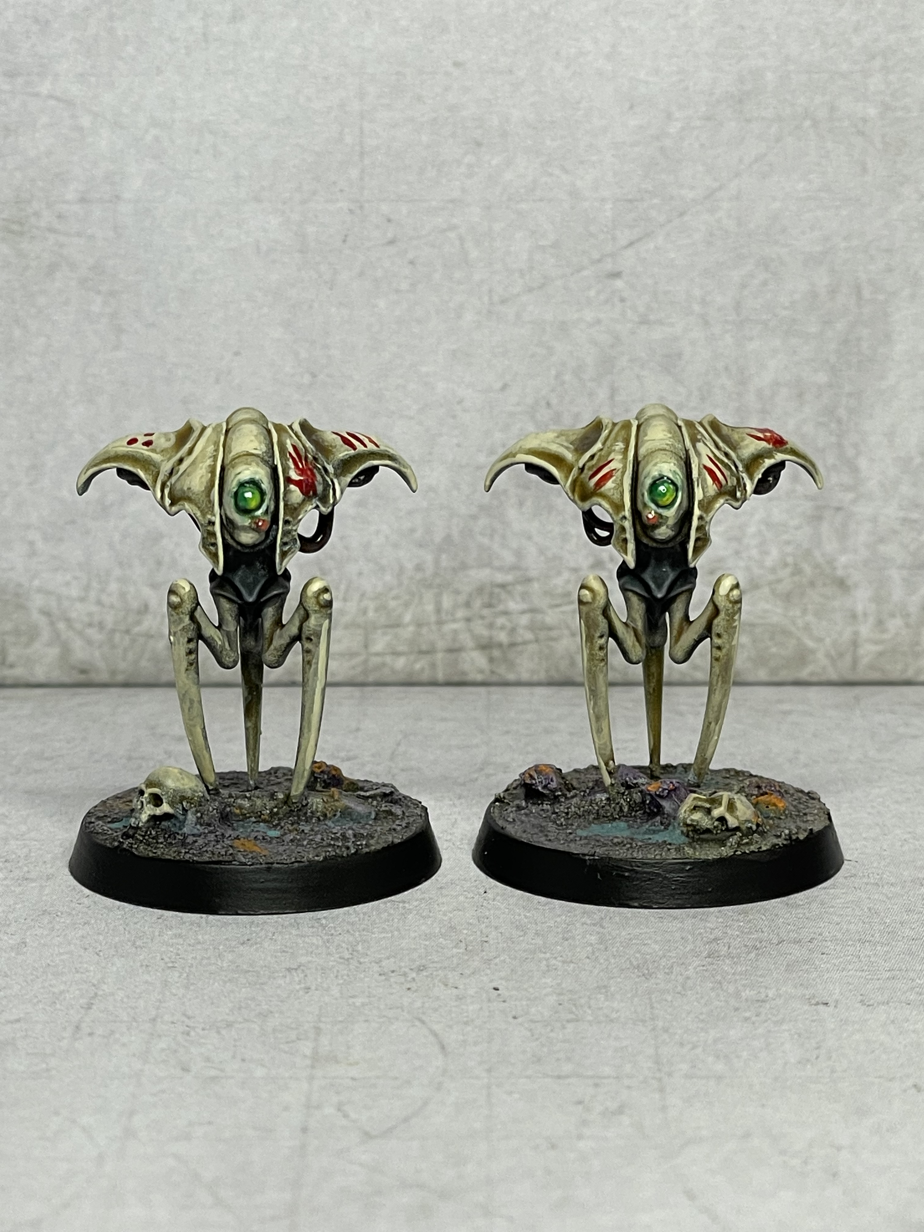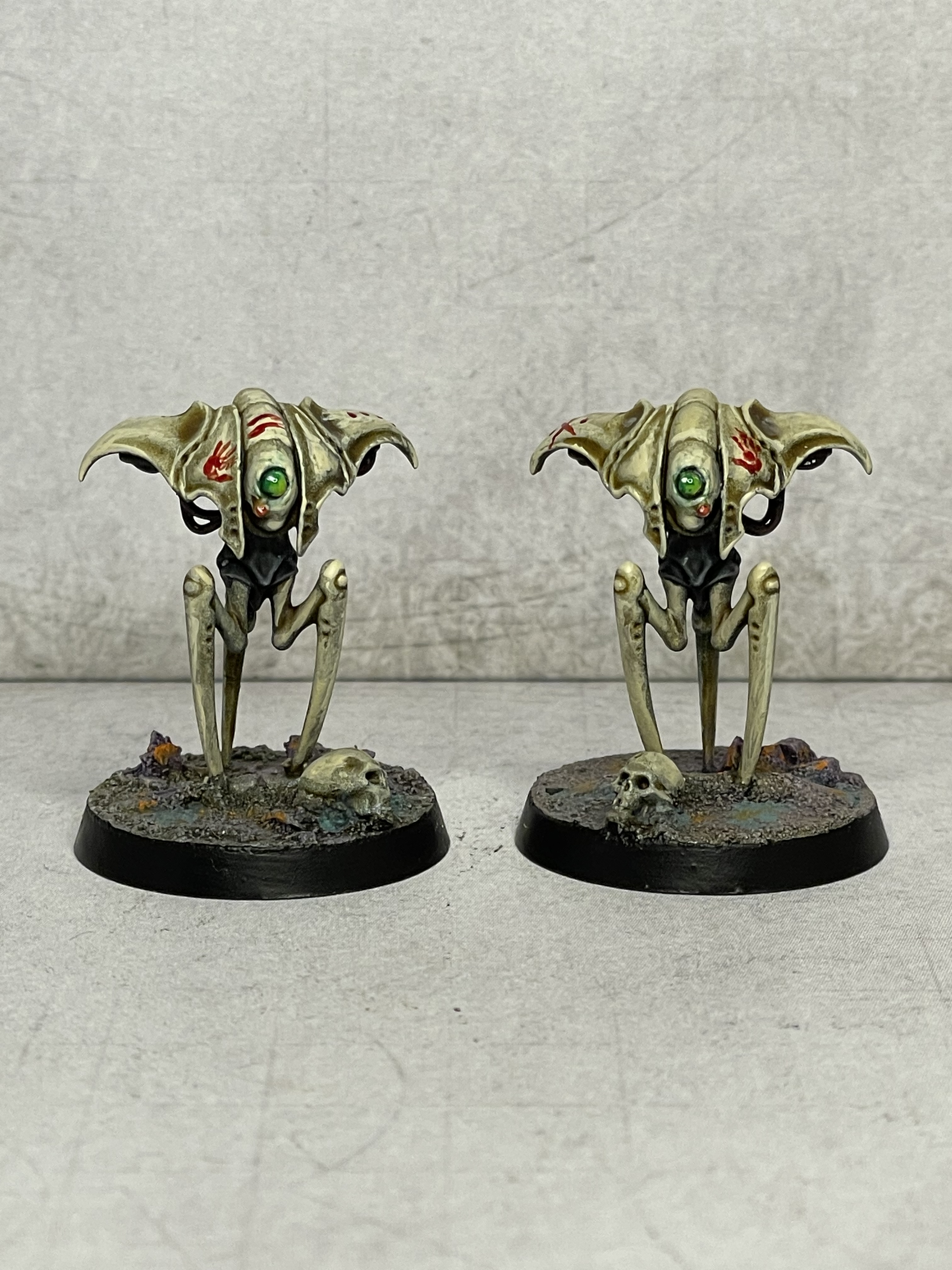 I know that these are called ‘Spindle Drones’, and that they live in the Blackstone Fortress, but otherwise I know nothing about them & I have no strong opinions on how they should look. They strike me as being quite organic so I started out painting them in a neutral bone colour, but they were really, really boring… I wanted to zhuzh them up a bit & settled on splashing some pseudo-tribal blood markings around. No idea if that fits with the fluff, but zero fucks given – it stops them from being so boring and that’s the main thing. Here’s the four of them together: