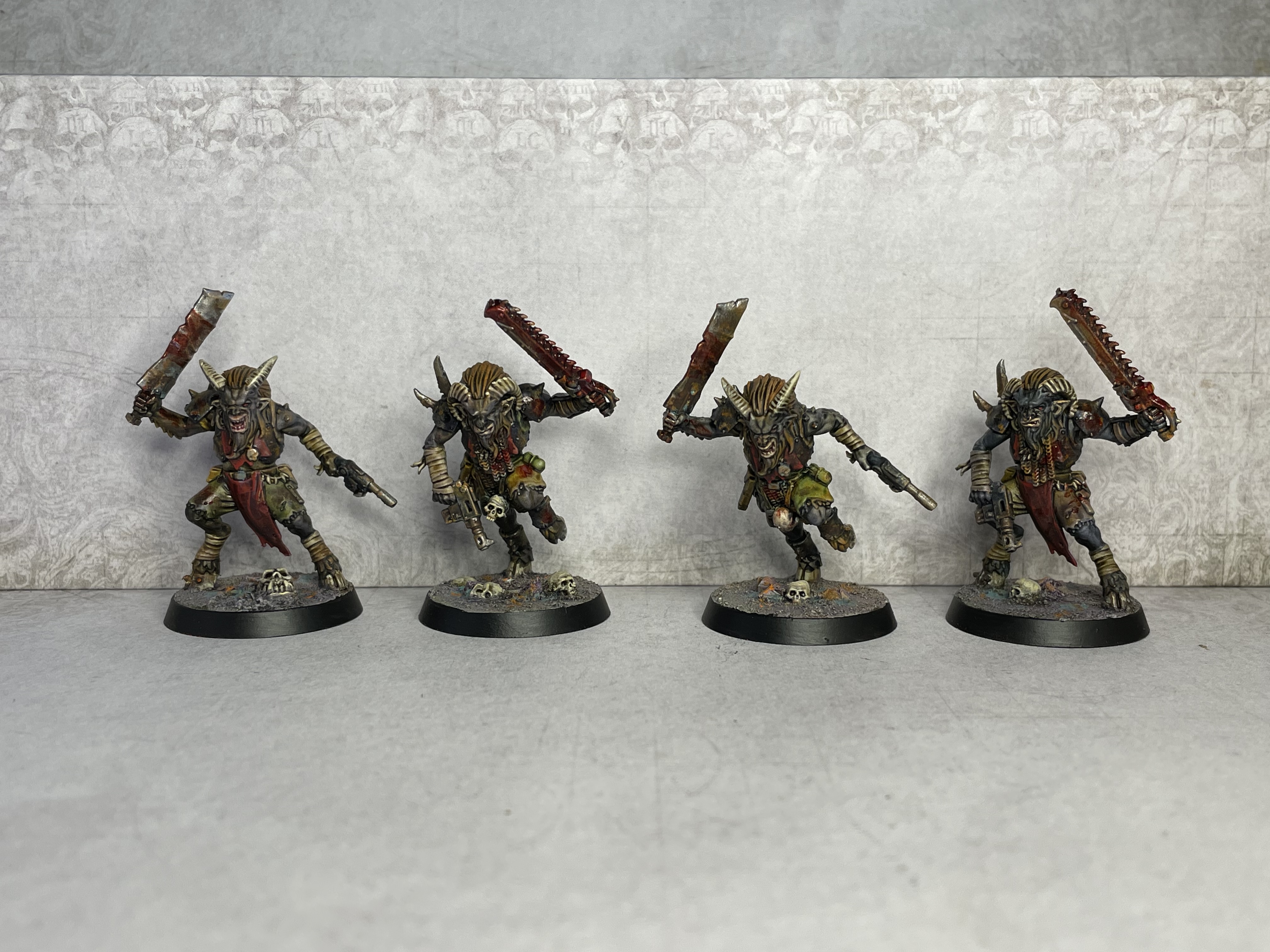 Not a hugely exciting set to paint to be honest – the four comprise of two top halves and two bottom halves, so you can combine them in different ways to make four ‘unique’ models, but there’s no getting away from how samey they look. Still, I’m pleased with them – I painted them up in the same scheme as the Cultists, and they all work well together. I could’ve done more to convert them and so on, but the juice didn’t seem worth the squeeze & I’m happy to have them done. Here they are together: