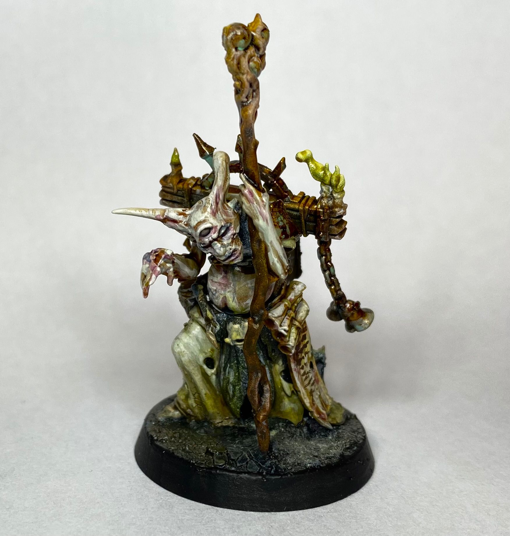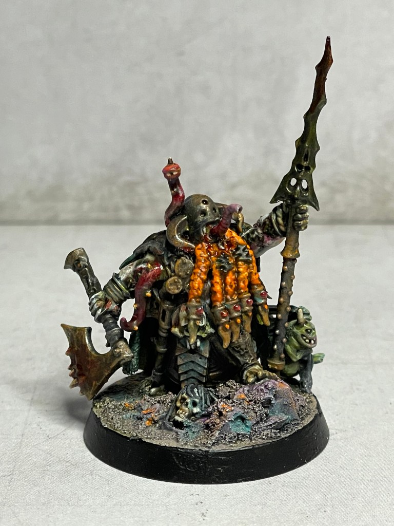 This is Mark’s Champ – Bloabech Wormfinger, human mage, with Horns of Nurgle and Additional Eye, carrying a concussion into the next game: