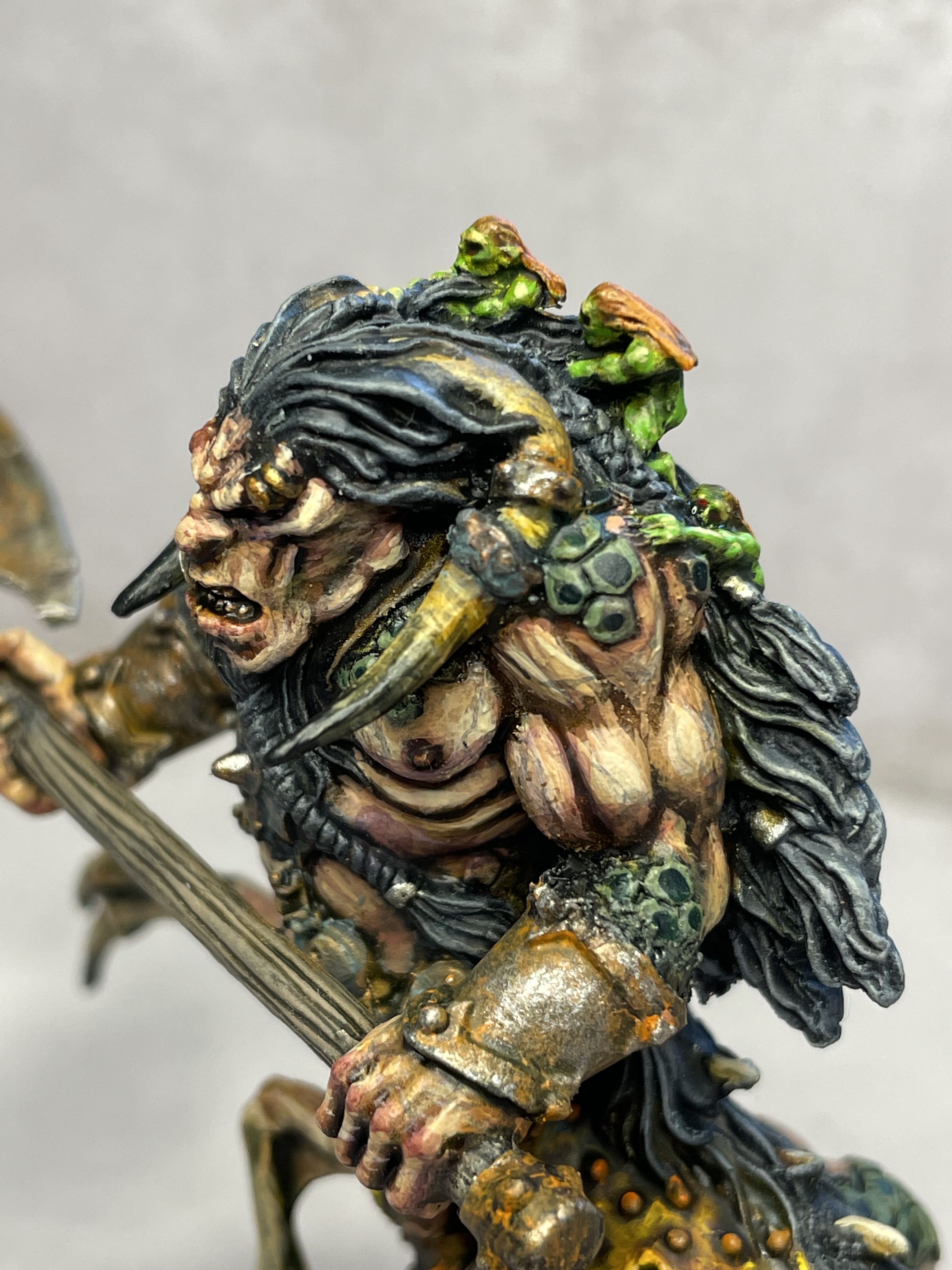Wow, what a mini. I picked up this resin gem a while ago & have been looking forward to and dreading painting it in equal measure. There is a lot going on here, and it’s quite an intimidating piece to tackle. That said, once I got started, it was actually pretty straight forward, with lots of fleshy areas to play with. I didn’t want to do any converting here – mainly because I reckon it’s a great model as-is, but also I’m always a bit wary of faffing around too much with resin. As is now usual for me, I used Contrast paints to block out the main areas before shading & then highlighting back up with ordinary layer paints. I went back in for another round of finer shading & highlighting, and generally messed around for a while before calling it done. Here’s a few closeups of the head and face, including the lil’ critters living in it’s hair: