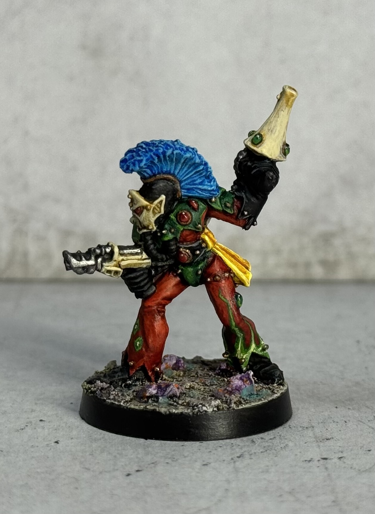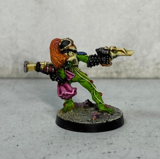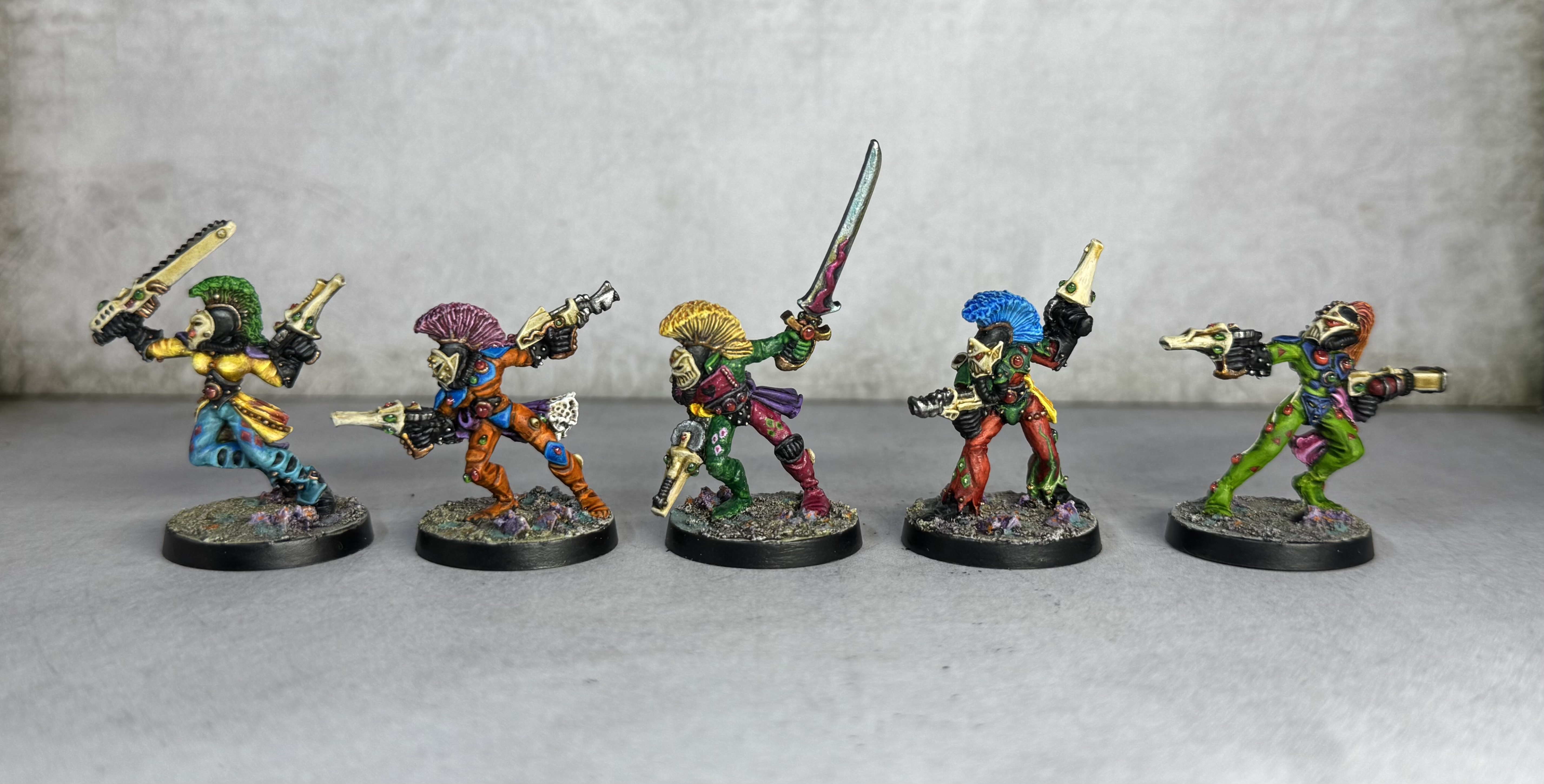 Greetings Terrans, and may your next orbit of Sol be pleasant and fruitful. I have another bit of progress to report on my growing Eldar army – as promised, I used the holiday to crank out small group of RTB06 Harlequins. I have been holding on to these guys since the late 80’s, so good to finally get them painted properly! I found the sculpts to be pretty decent for the most part – quite delicate and complicated for the period, though a few do have badly misaligned faces, (on the vertical axis front-to-back due to mould slip), though luckily you can’t really see that unless you are looking head on. Paint-wise I treated each as an individual as per the original concept of Eldar Harlequins, rather than the more uniformed approach used by modern studio painters. Here they are, front and back: