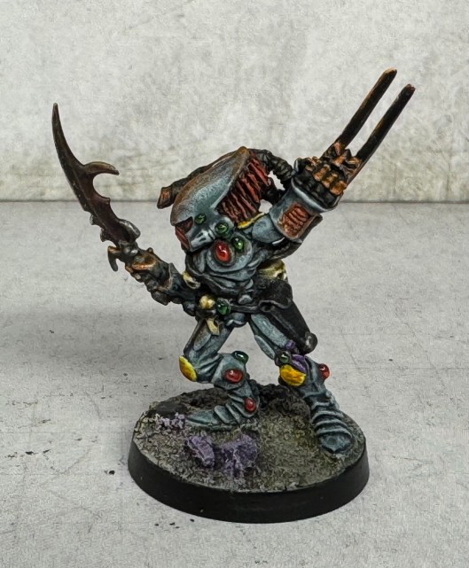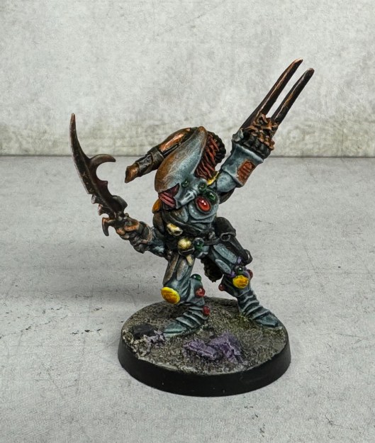 This is a solitary member of a homebrew Aspect shrine, the ‘Silent Headsmen’ or Shaedra-Torrith. I envisage this shrine as being a rare offshoot of the Striking Scorpions that revel in the hunt and the claiming of trophy skulls… Painted in gritty tones, with an attempt at some OSL, this guy is intended to be used as a Predator analogue in a planned ‘Tyranid Pyramid’ game in the summer – basically Aliens v Predator v Colonial Marines in 40k. Should be amazeballs if it happens!
