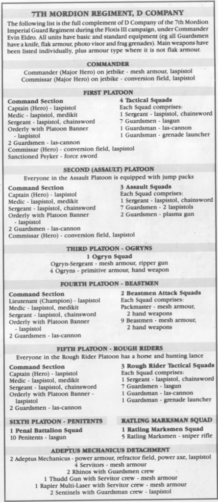 Greetings Terrans. As I approach the end (for now) of my Elday project, I can’t help but look forward to the next big thing on my hobby agenda – an army that has fascinated me since the first time I saw it in the Warhammer 40,000 Compendium in 1989… You may have guessed from the title that I’m talking about the army presented in the article ‘The Pacification of Flotis III‘ by Graeme Davis, and beautifully illustrated by the peerless Pete Knifton. The army is a real showcase of the units that were available to the Imperial Guard at that time, and is still recognisable today, (Ogryns, Ratlings, Rough Riders, Sentinels and so on), but of course the thing that drew me in the most was Pete’s artwork:
