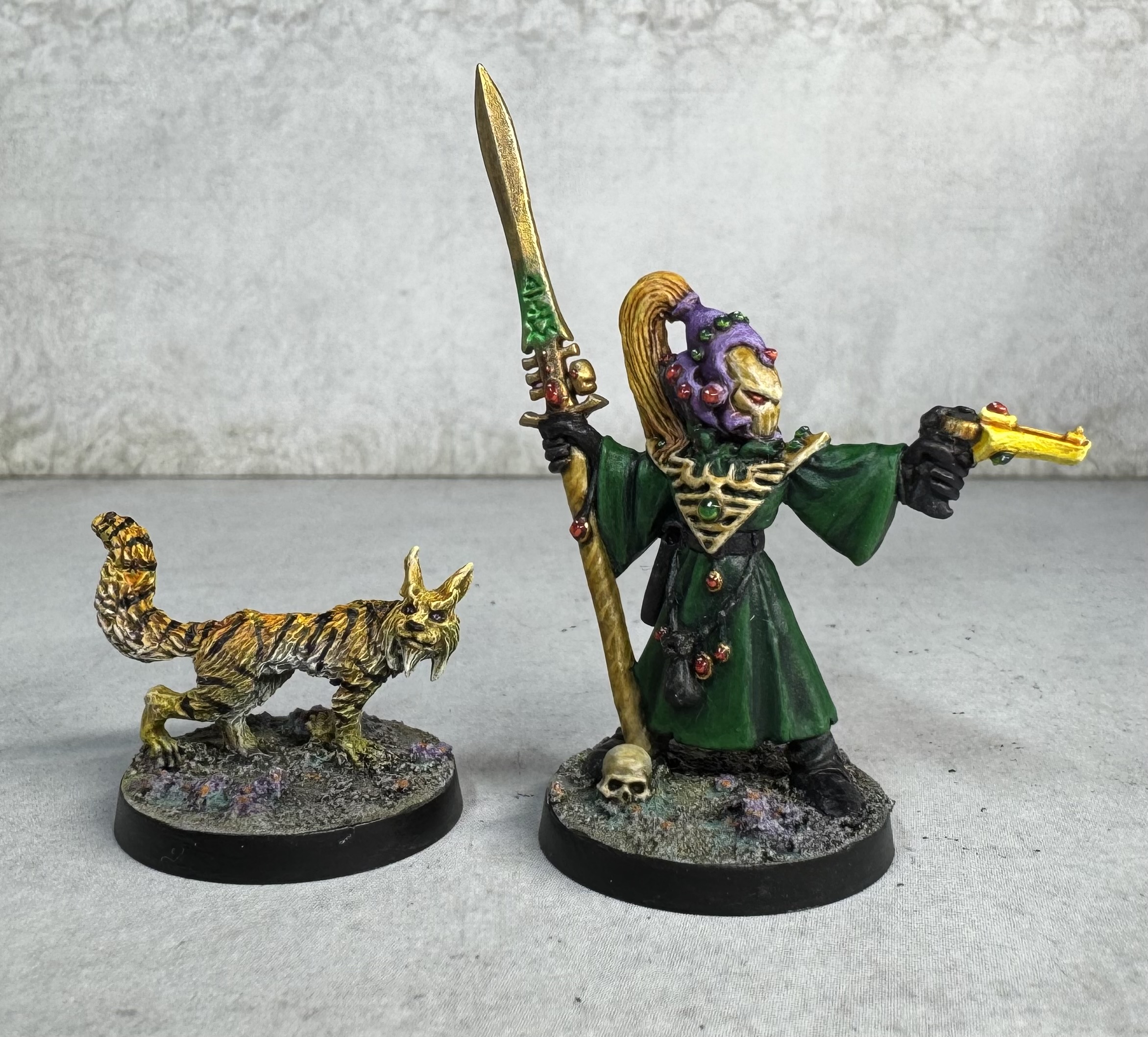 Fantastic looking Warlock and companion Alex, the color schemes on both work really well, the cat reminds me of the one from the Dark Eldar/ Eldar set of three characters, and obviously the original Rogue Trader entry.