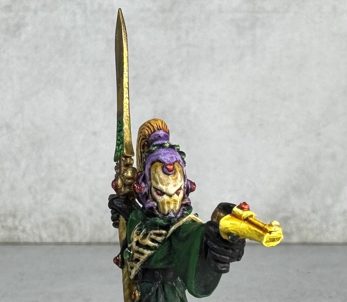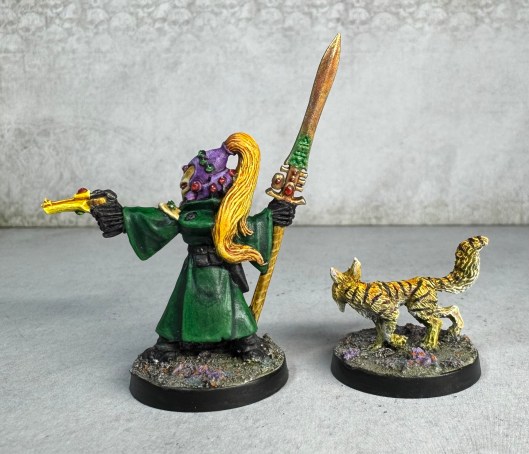 Greetings Terrans, I’ve hit a bit of a milestone on my Eldar project that I am happy to share with you today – I have completed the last of my original Eldar miniature pile! As such, this will be the last post on this subject for a while. The model in question is one of the OG Warlock figures, (‘Warlock 2’ to be precise), albeit with some weapon swaps to replace parts that had been chopped off in the dim and distant past. I also painted a companion Gyrinx – I think from the second Colony 87 Kickstarter from 2016… Seemed appropriate for the Warlock to have a psychically attuned companion :-)