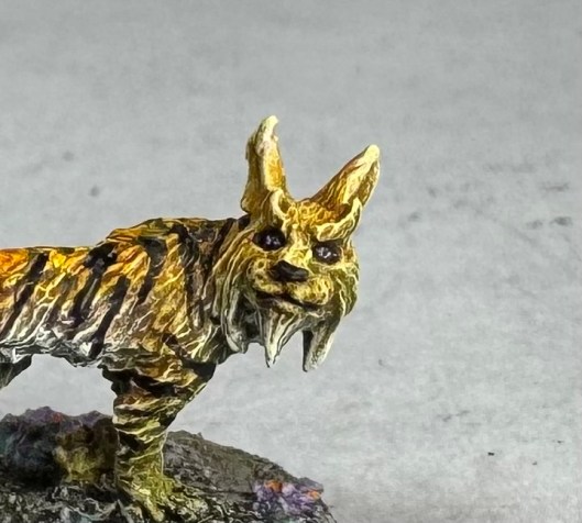 Painting was a very pleasant affair – I love working with dark green, and the rest of the Warlock was handled with Craftworld purple & yellow, combined with bone. The Gyrinx was fun – a nice easy wash & drybrush approach, again, using Craftworld colours. I’m pretty pleased with the tiger stripe pattern!