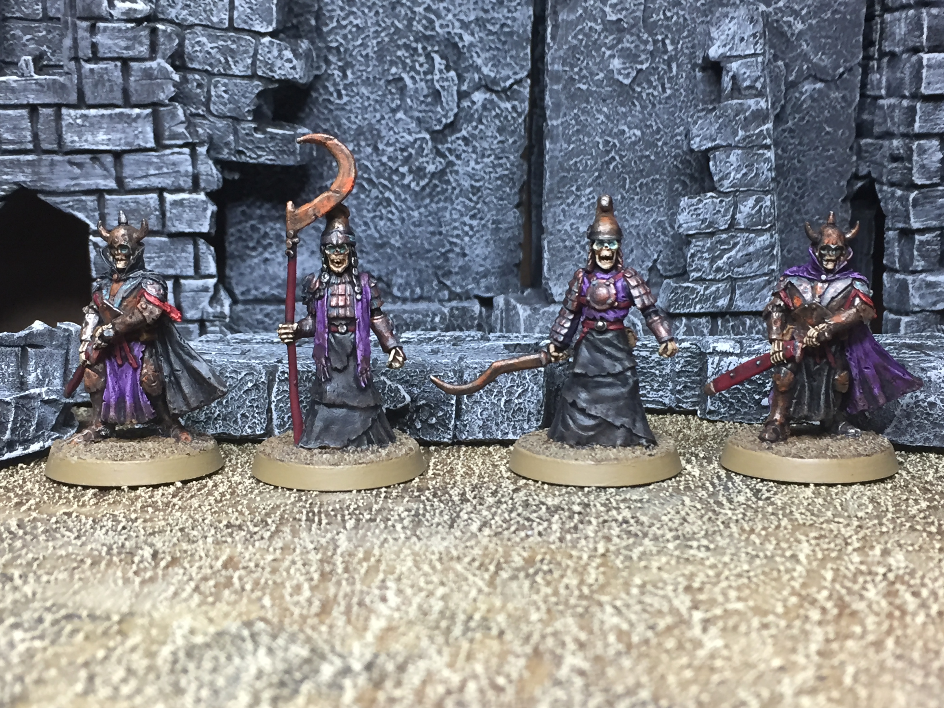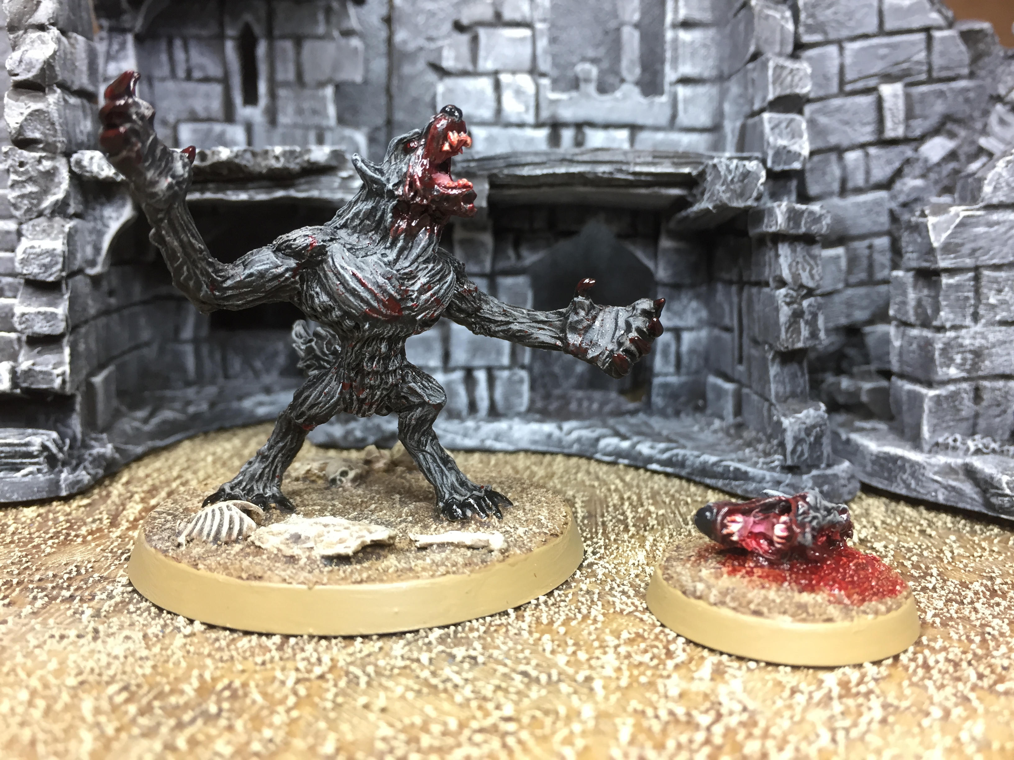 We were going to play Frostgrave as a trio of Wizards, but my eldest got a bit teenagery about it all, so it has just been me & my youngest son playing co-op. We deliberately went for non-fighty wizards to start – he went Illusionist, and I went for Soothsayer. Neither has any combat spells in their starting deck, and we haven’t taken warbands either, so we’ve been a bit crap really!! 😊 That said, the illusionist can cast ‘Monstrous Form’ or ‘Beauty’, and my son and I agreed that it would be good to have minis to represent this. We roped in a mildly converted Knightmare Miniatures ‘Hook Horror’, and some random nudie elfin lady that I had in the pile. Both got a spooky glow-type paint job to show their illusory & magical nature on the table top: