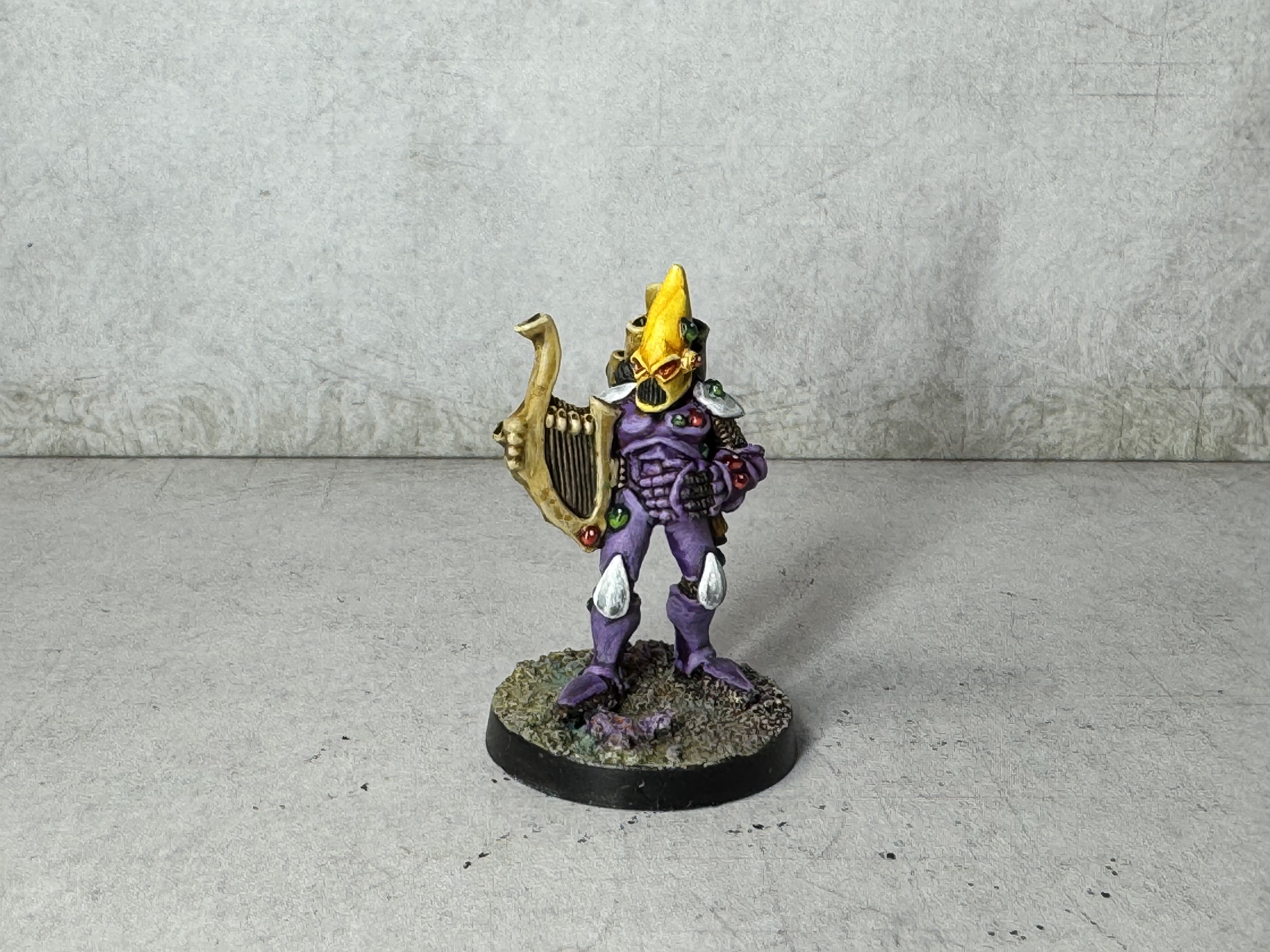 Next we have a musician – Kelos Longfinger. This is actually a strip & repaint of a mini I first painted back in 2015(!!). I’ve used bone and white to tie this Guardian back to the Howling Banshee shrine – which also ties in with the idea of using sonics as a weapon: