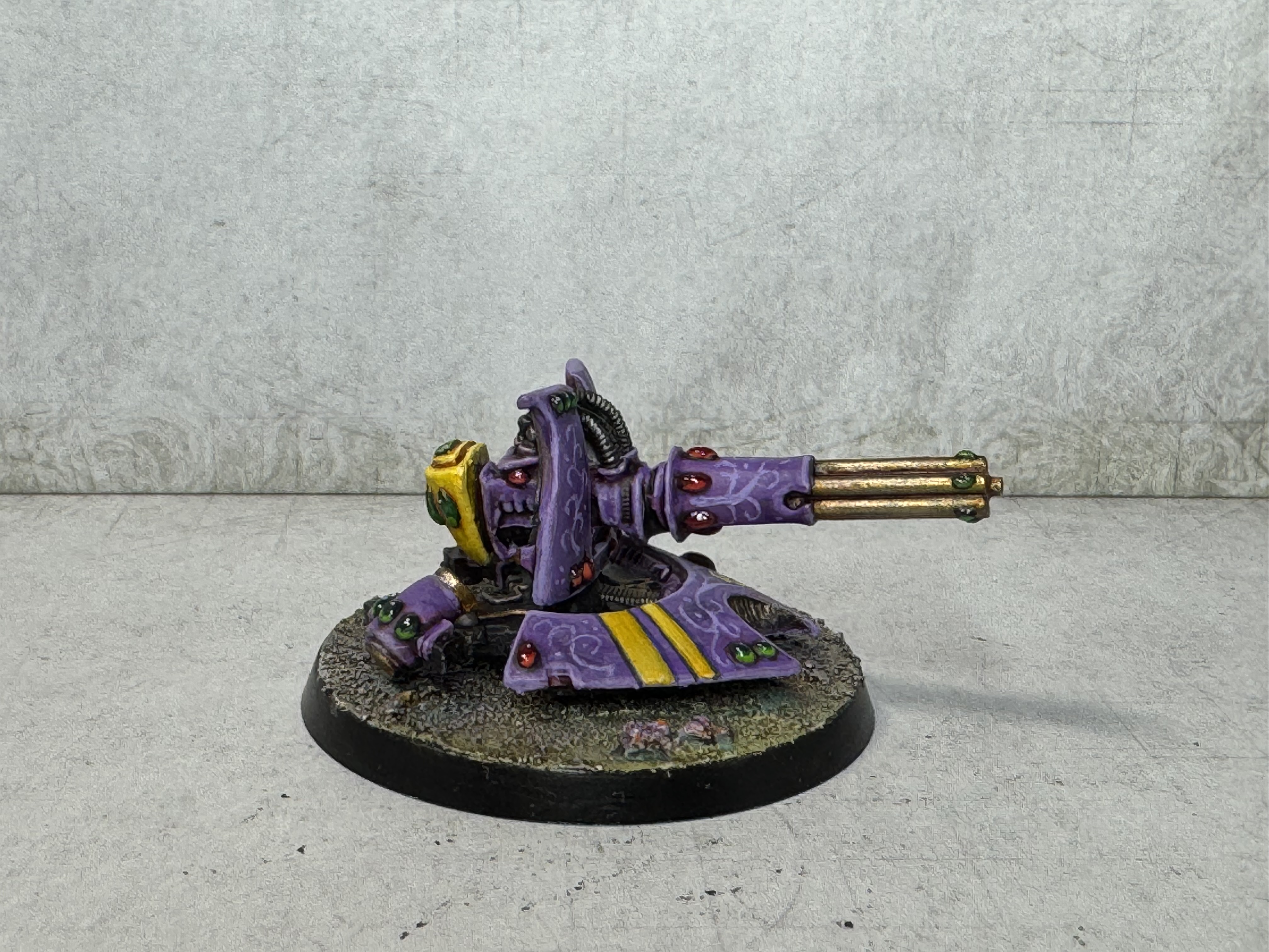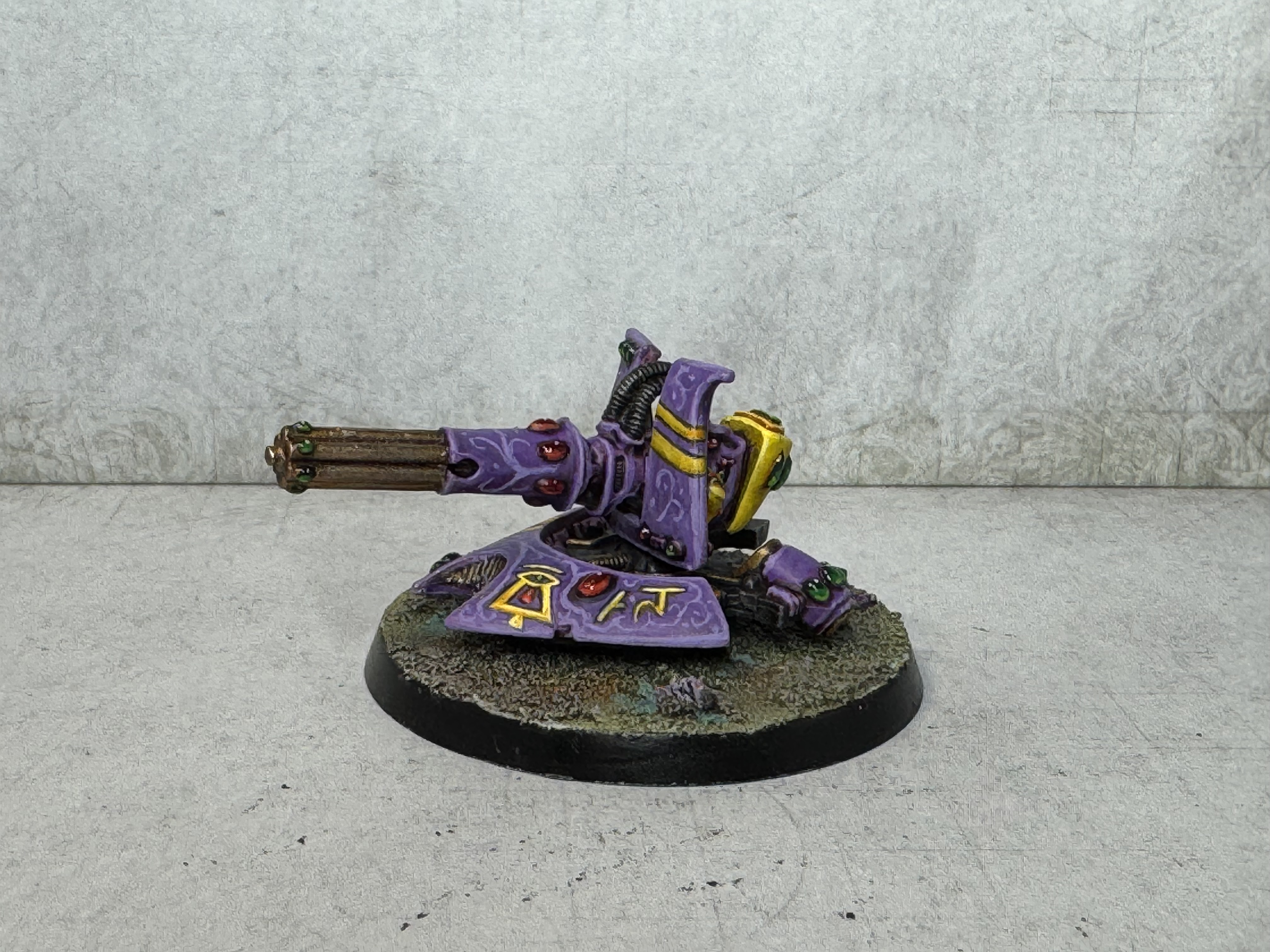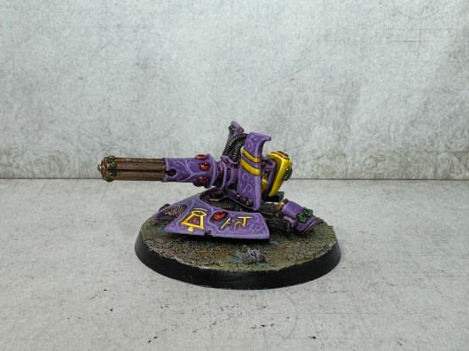 Finally, we have a heavy weapon platform and crew – I think the weapon & grav platform are from around1990, but the crew are a little older, (slight hand swap conversion on the dude with the hairdo). I’ve used a very darker purple here, tying these two back to the Dark Reaper shrine: