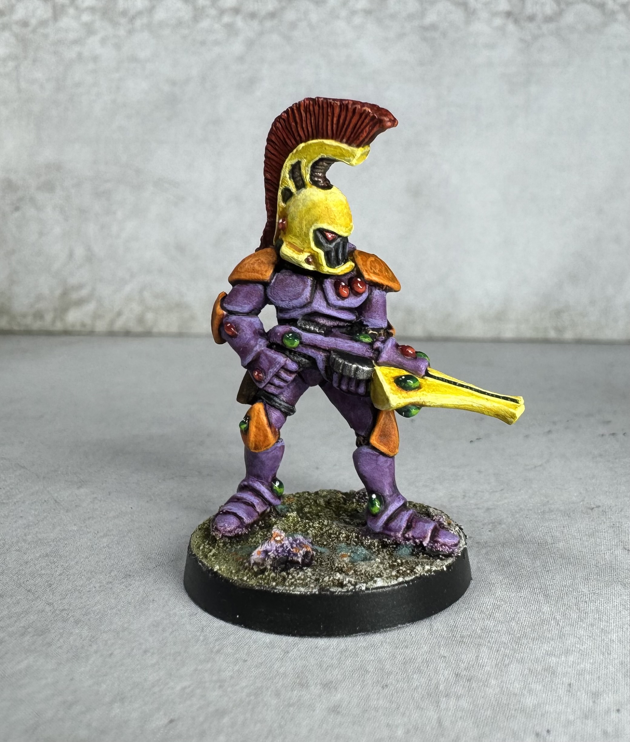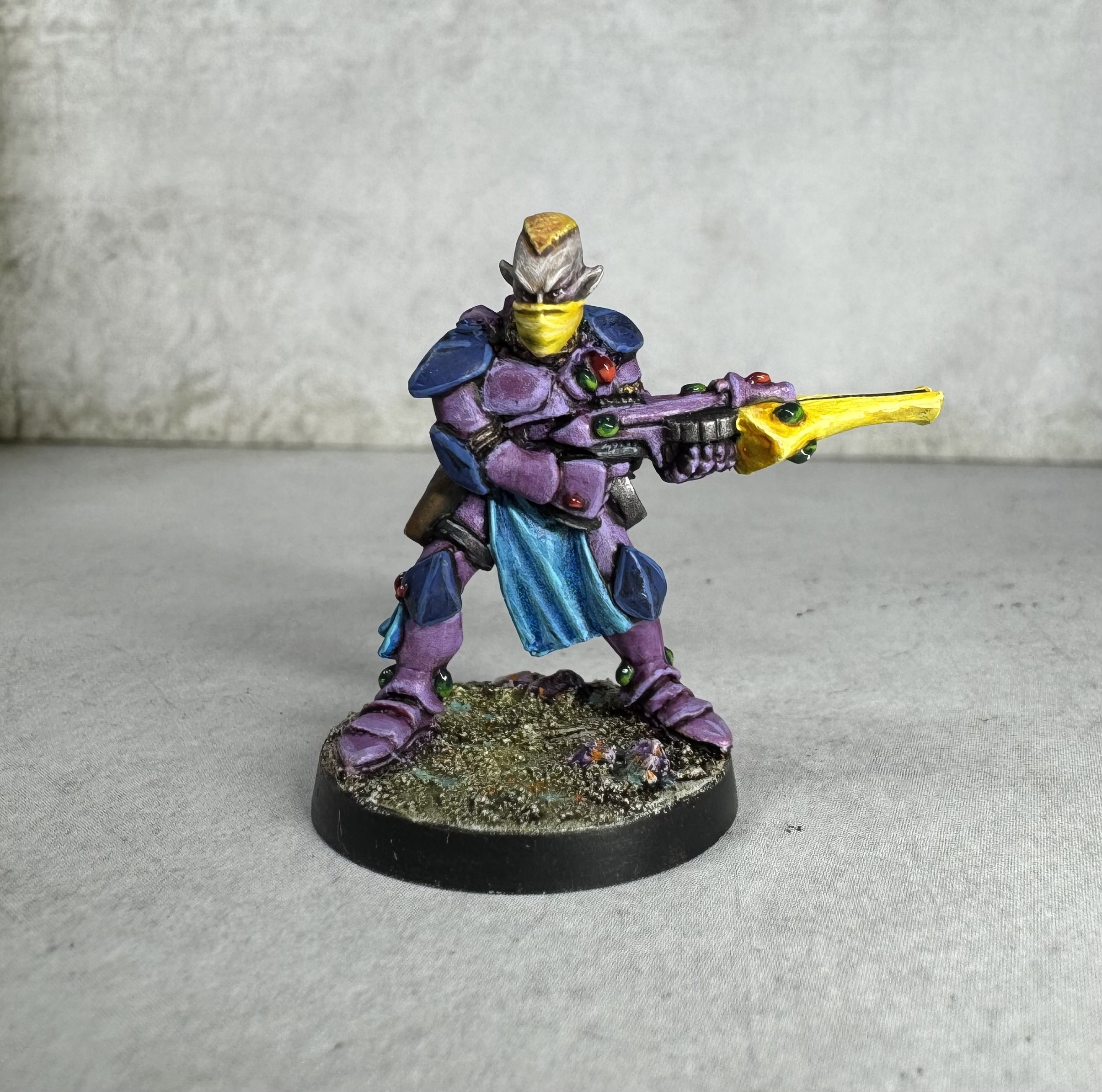 1: I’m going with a Homebrew Craftworld rather than one of the established ones – I’ve settled on a purple/yellow colour scheme for Guardians from my (still) unnamed craft world. I’ll use purple as the main colour, and yellow on helmets and key armour pads, but I also had the idea of some Guardians being ex-Aspect Warriors & maybe carrying colours over from their former shrines, (just as a bit of fun & to add some variety).