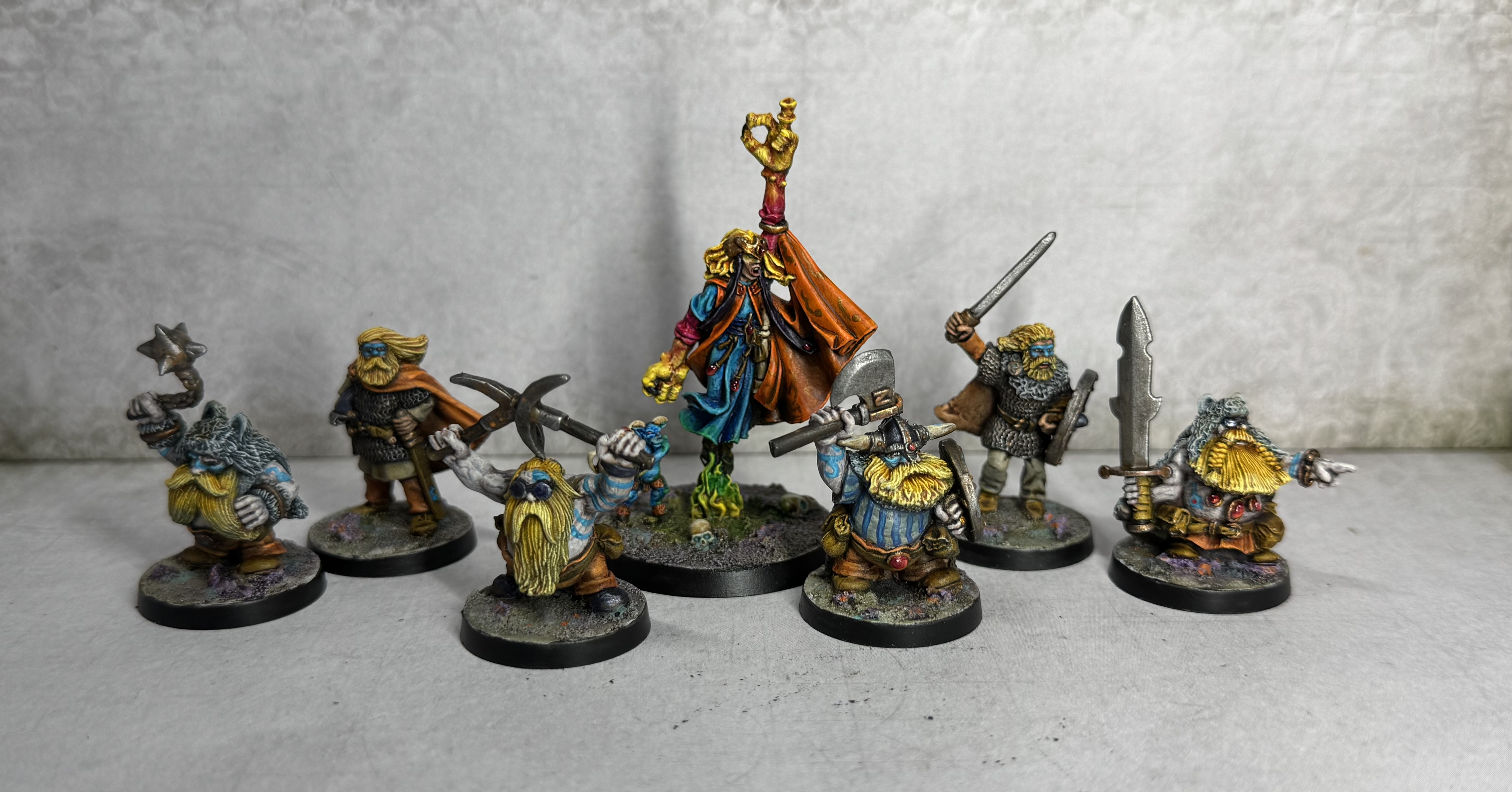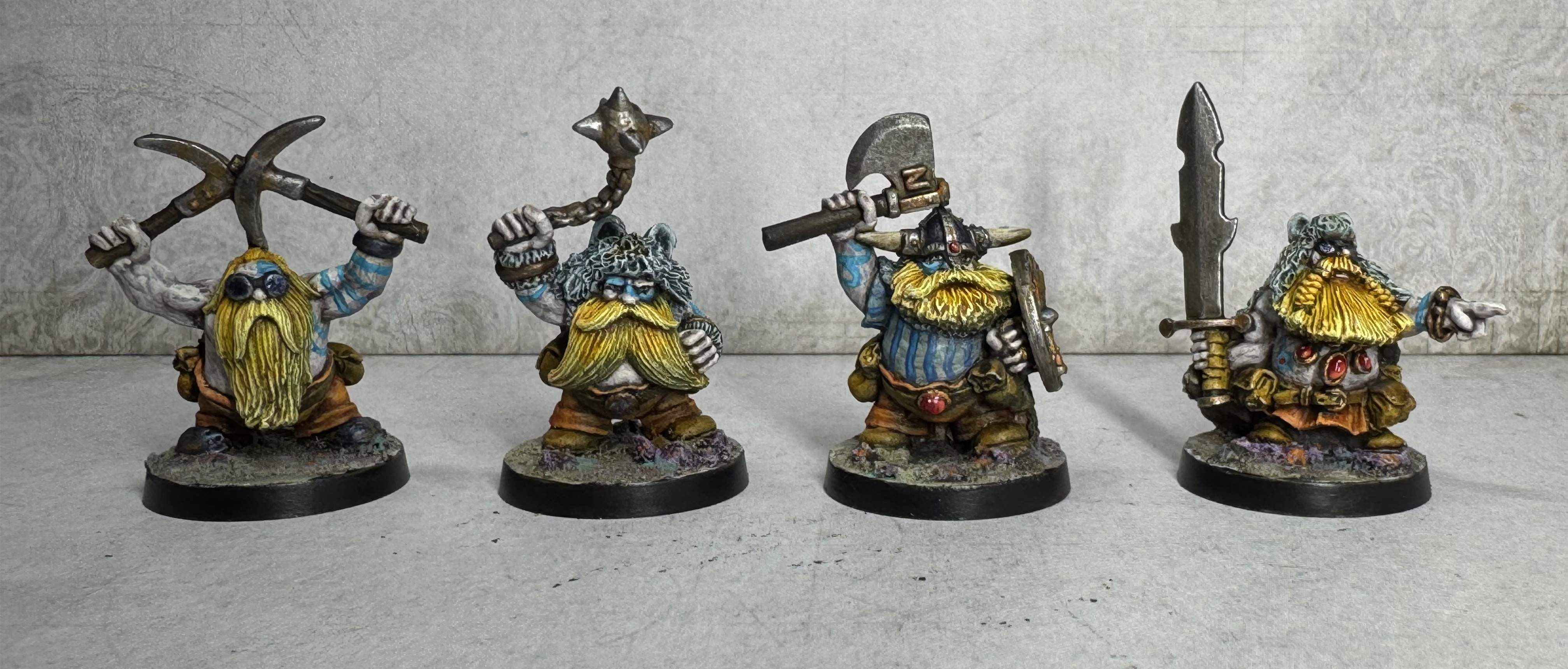 Nothing too much to say here – they are all ‘Norse Dwarfs’ from Foundry, and they are all are broadly painted as per the earlier warband members. The only exception is the pale skin & more extensive blue markings – whether these are warpaint, tattoos, or marks of Tzeentch is unclear!