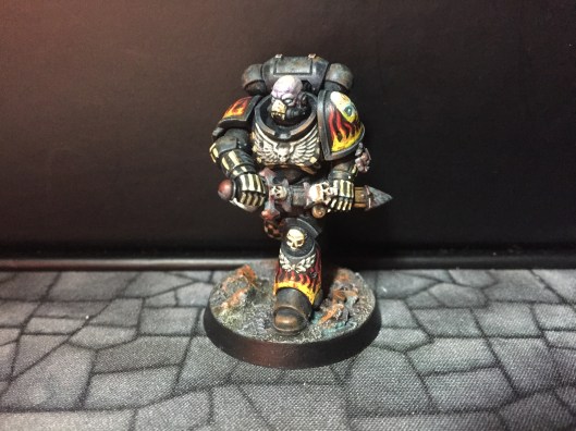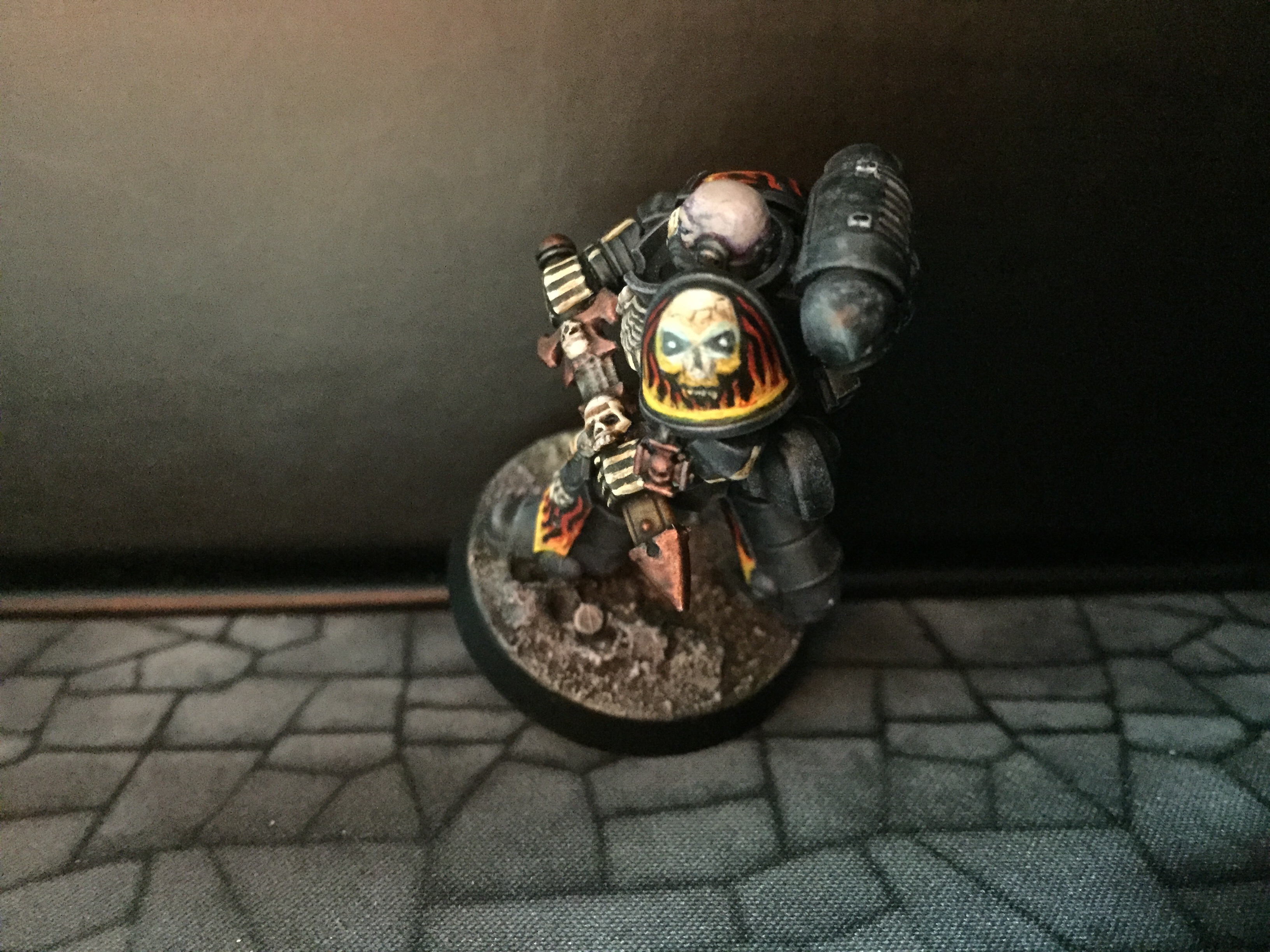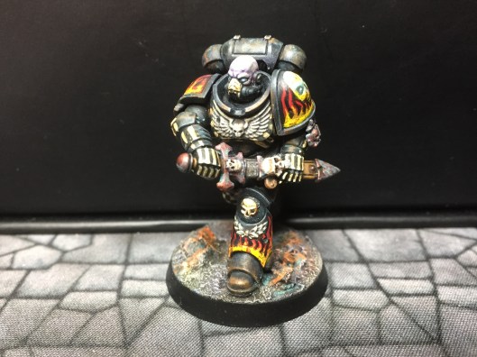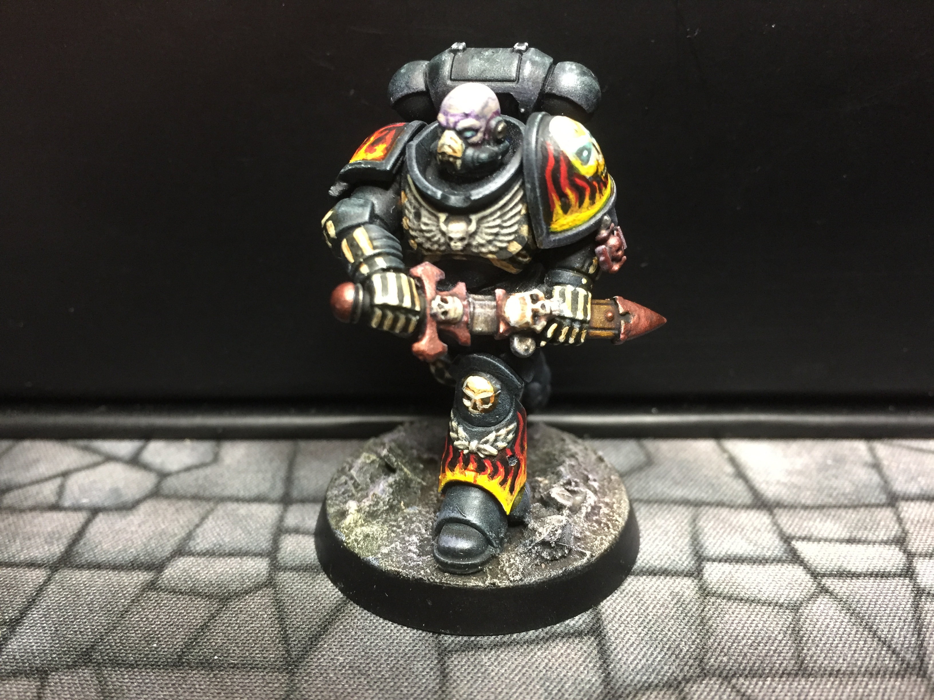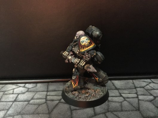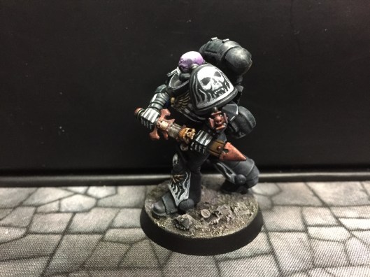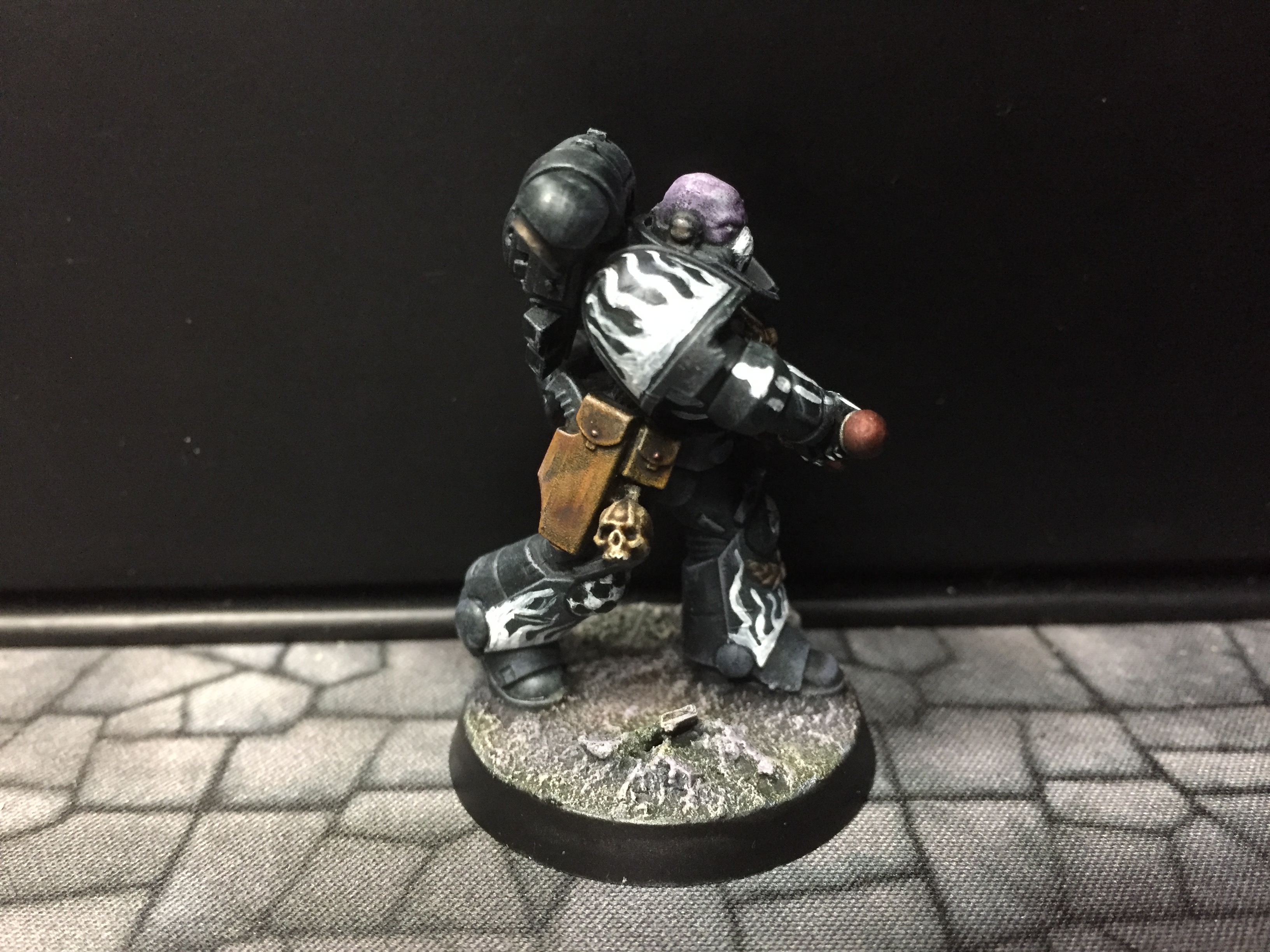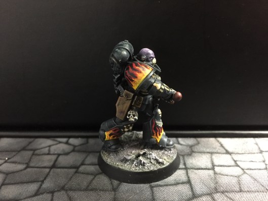 7: Now we get to the fun part – using white scar, I pick out the eyes and/or eye lenses. I also freehand on the details I want to add – in this case, there are a couple of skulls, and I did bones on the arms and some ribs. The rebreather got a bone muzzle type thing, and the helmet (clipped to the mini’s belt at the back) had the faceplate painted like a skull. The flames are just rough wiggly lines, and I also did a chequer pattern on the right knee. Don’t be too precious with this stage, you can always cut back in with Abaddon Black to tidy things up, but rough and ready is just fine for now: