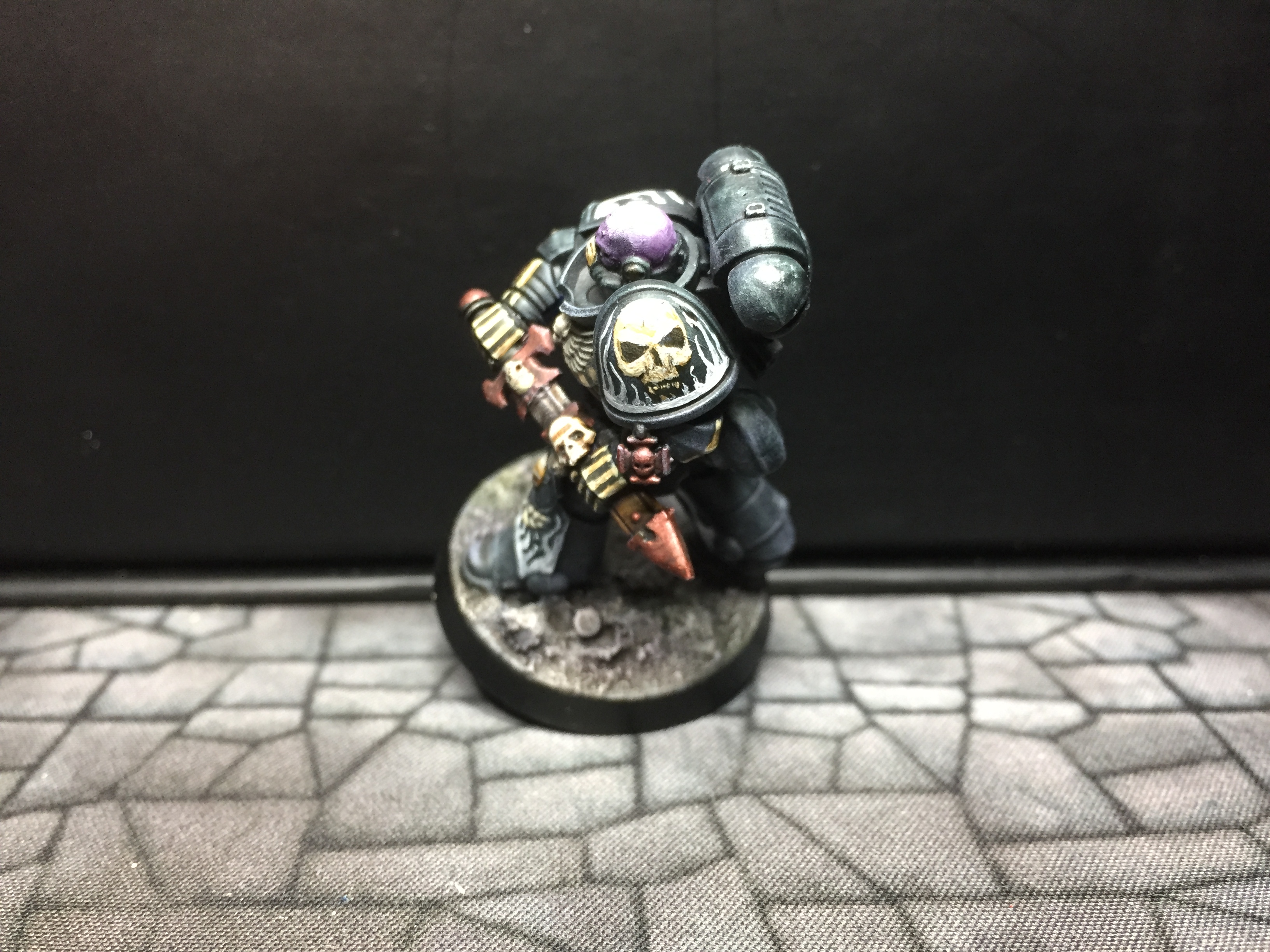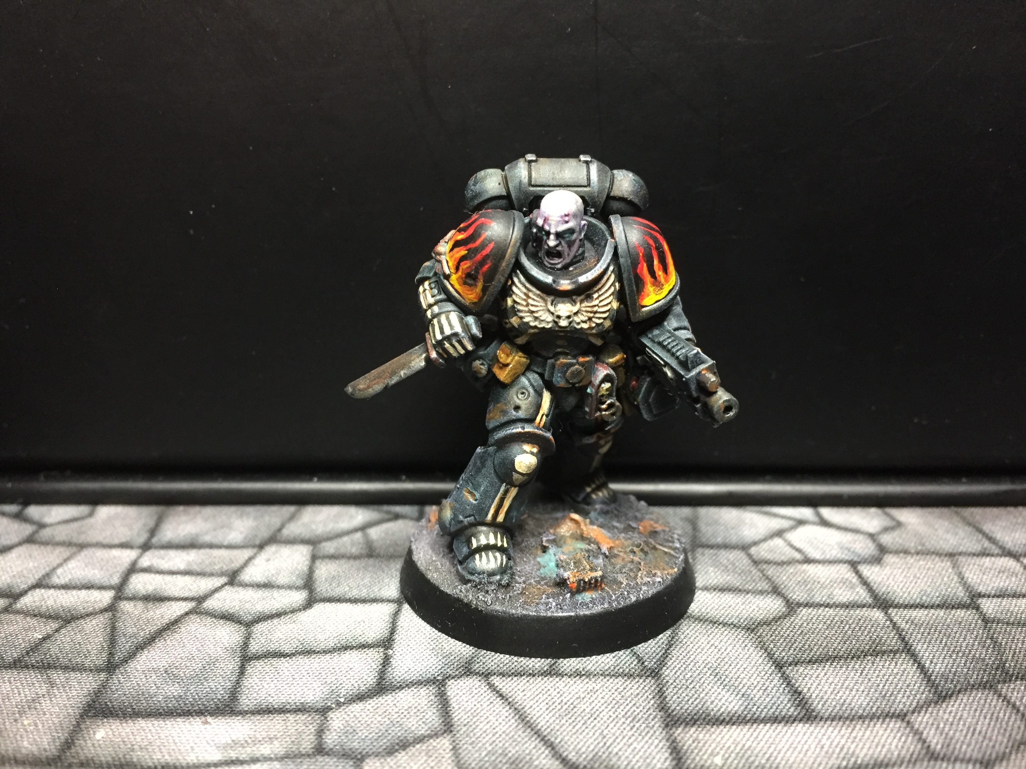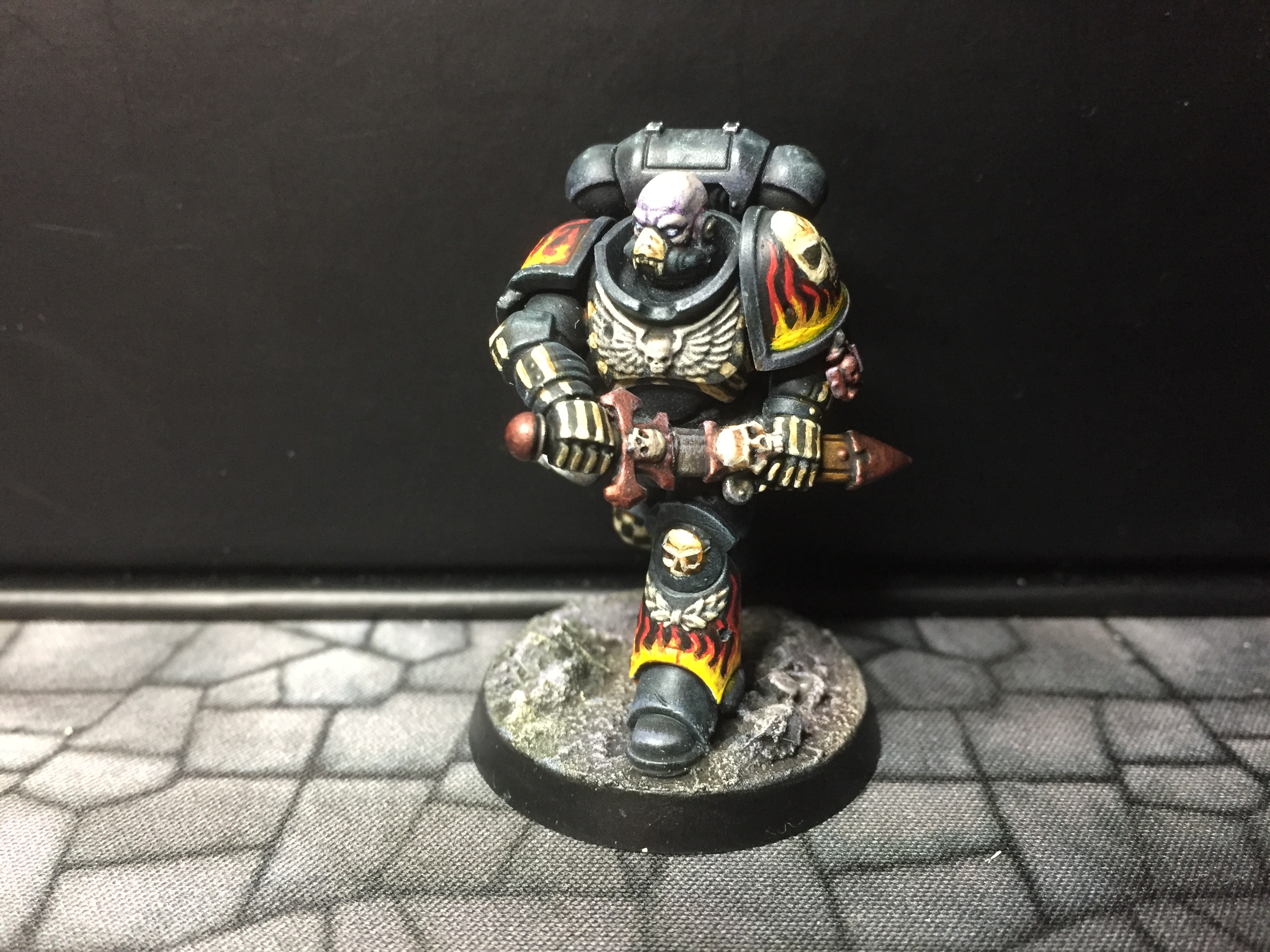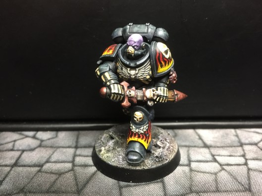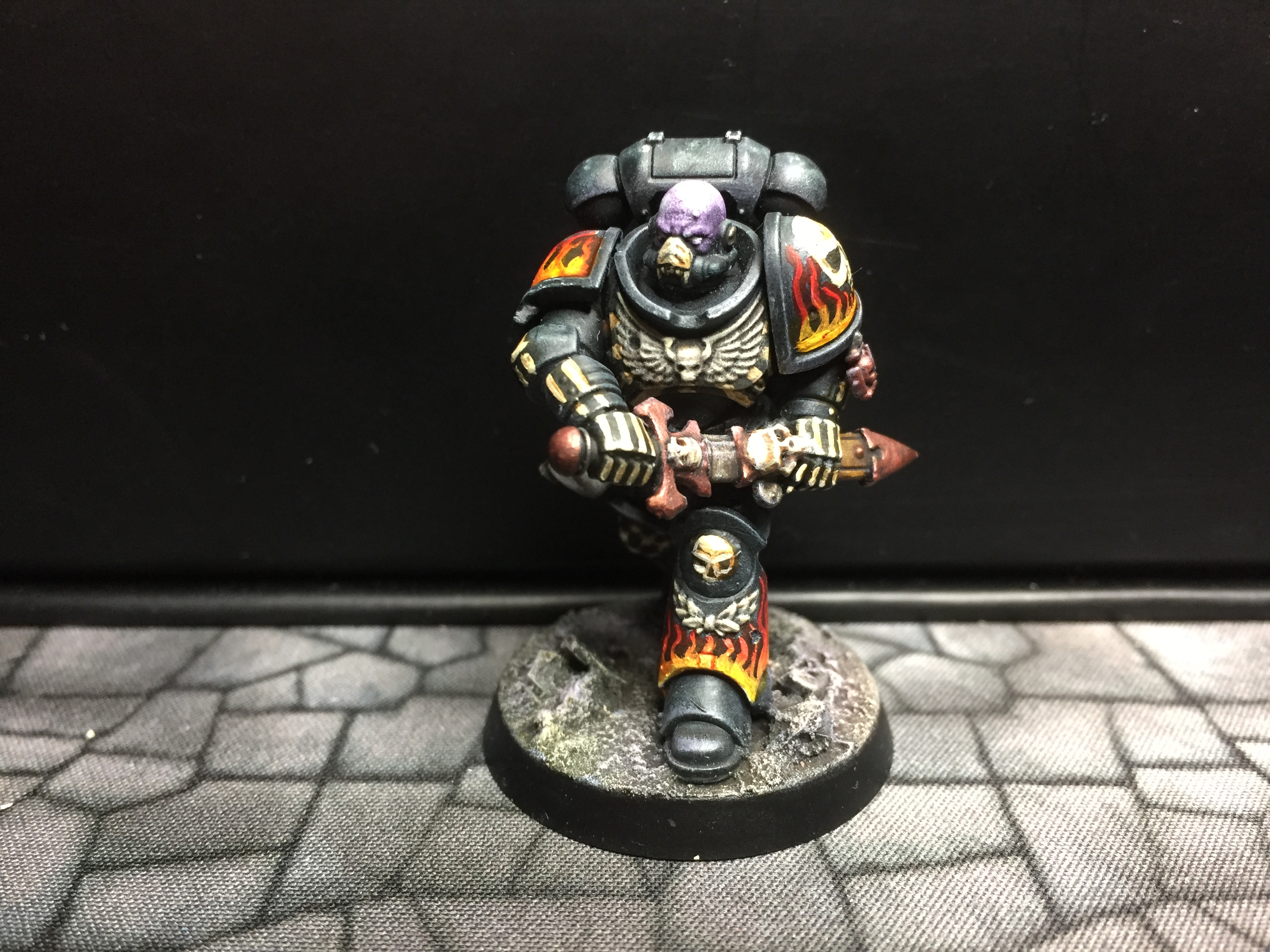 7: Now we get to the fun part – using white scar, I pick out the eyes and/or eye lenses. I also freehand on the details I want to add – in this case, there are a couple of skulls, and I did bones on the arms and some ribs. The rebreather got a bone muzzle type thing, and the helmet (clipped to the mini’s belt at the back) had the faceplate painted like a skull. The flames are just rough wiggly lines, and I also did a chequer pattern on the right knee. Don’t be too precious with this stage, you can always cut back in with Abaddon Black to tidy things up, but rough and ready is just fine for now: