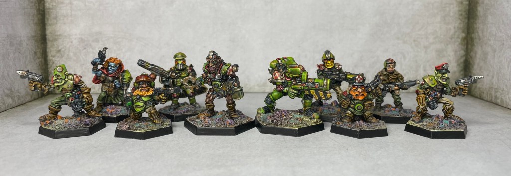 This pair are both from the ‘Malig Goblinoid Infantry’ faction from ‘The Ion Age’ range. There wasn’t too much conversion work needed here, but I did sculpt on some data pads to suggest tools for hacking. Again, the painting really followed the same formula as the rest of the crew, though I did roll with the whole Goblinoid look here.