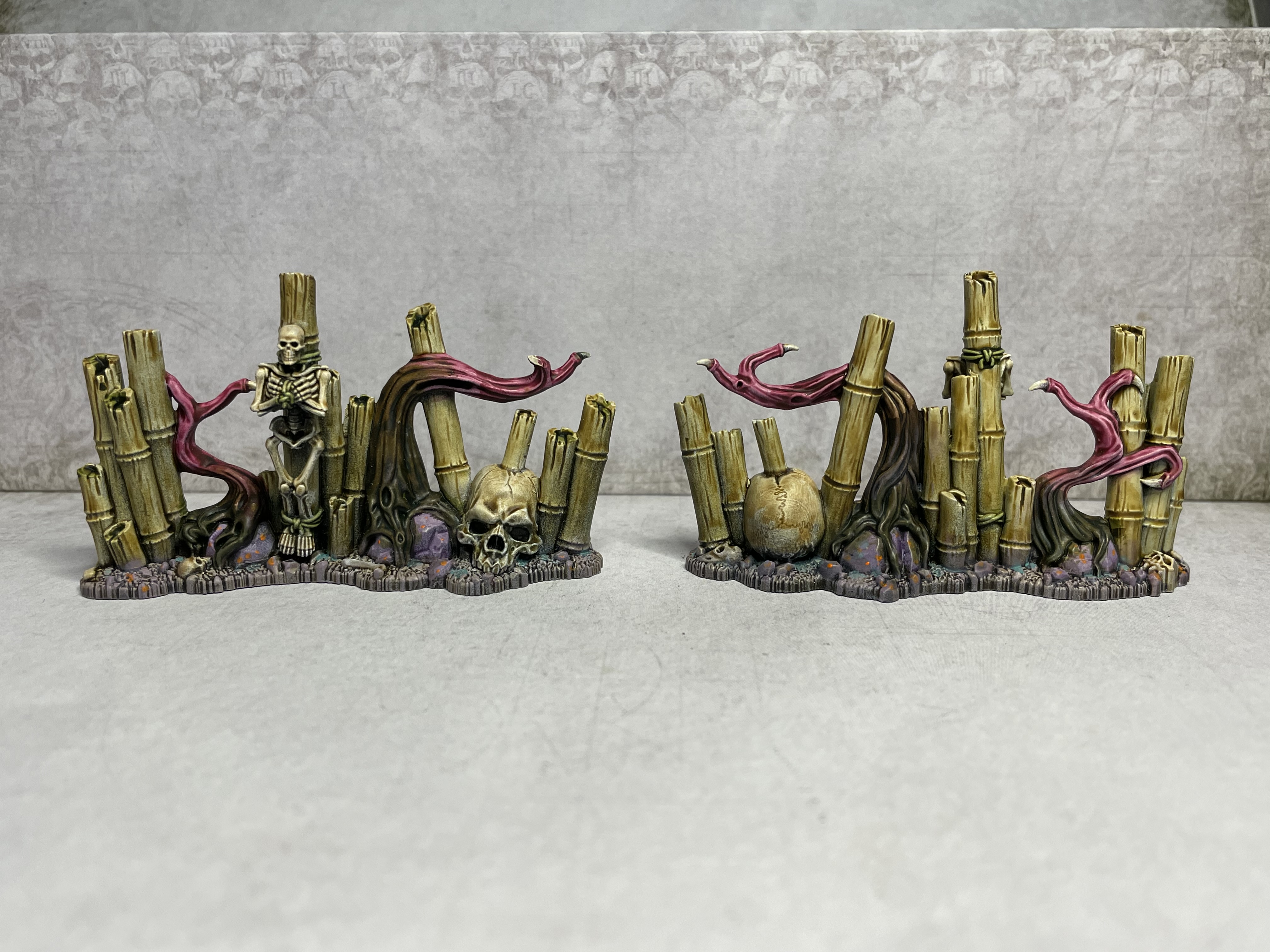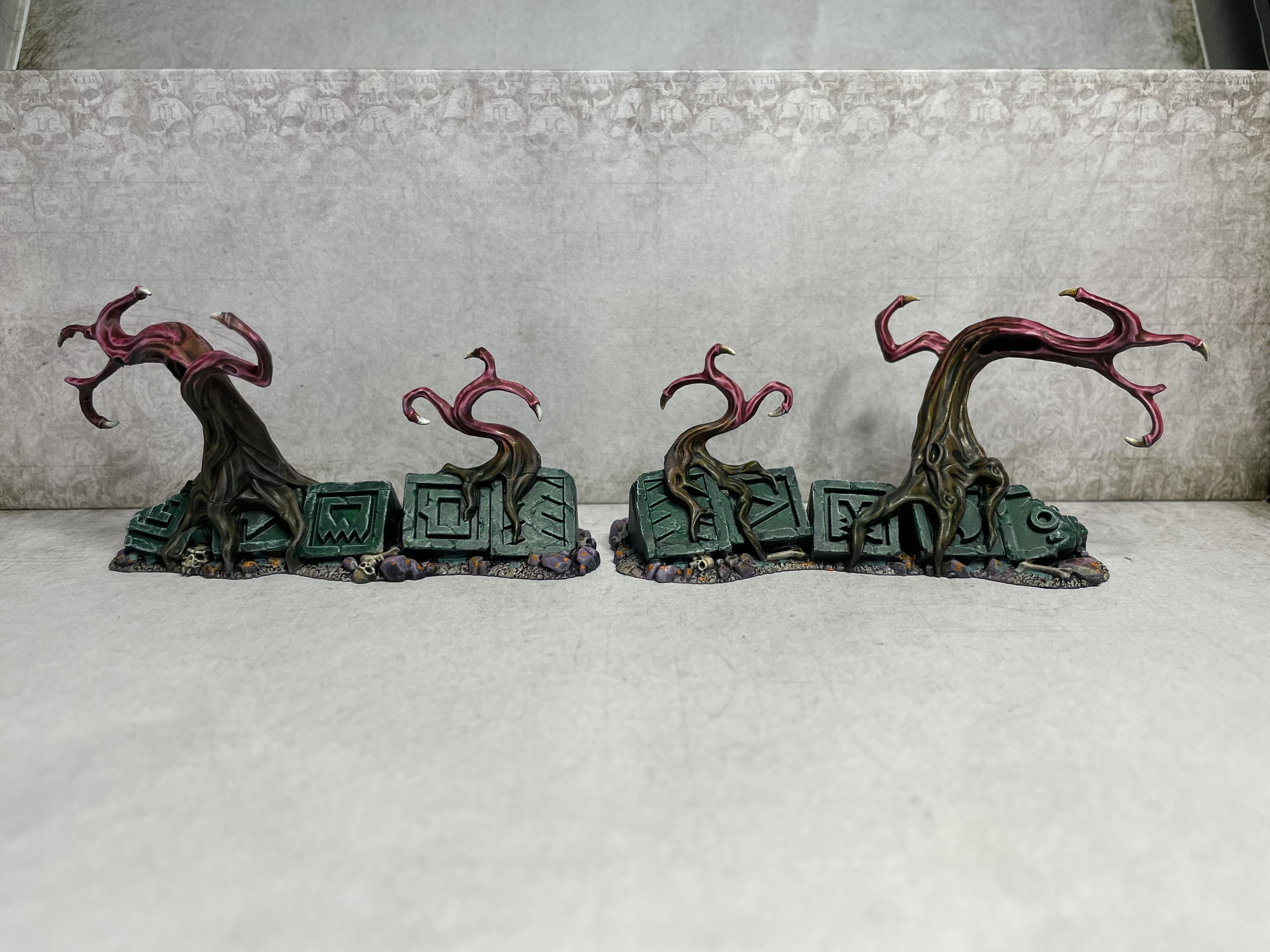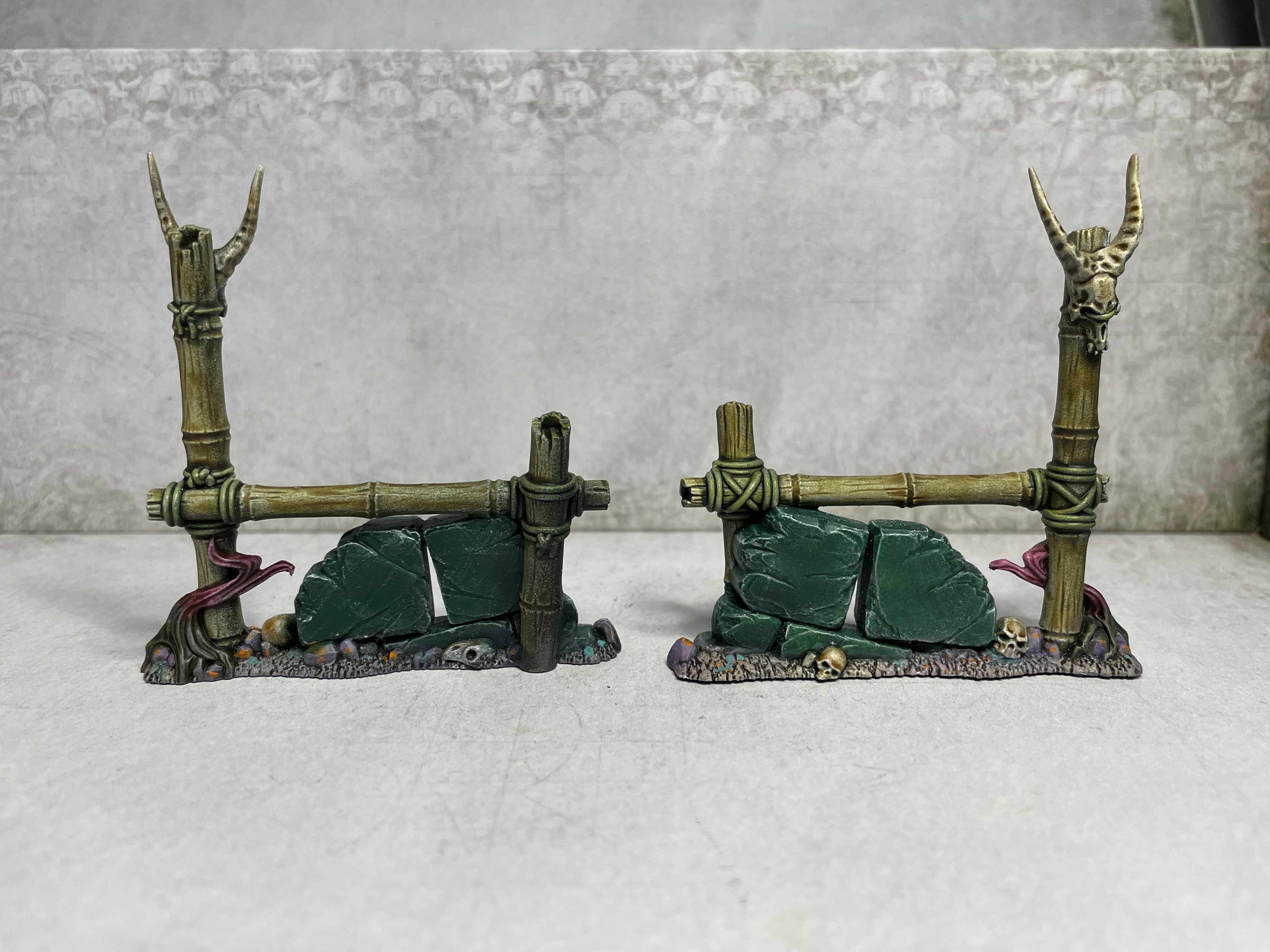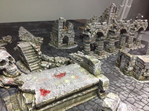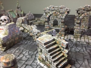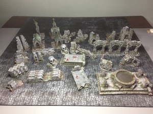 Finally, my Frostgrave terrain has been left out & has been staring me in the face these last two weeks. It is lovely pre-painted stuff, and has been worth every penny spent on it, but the lack of detail was starting to annoy me. You can see in the pics above that it is just grey, grey and more grey. Usually this stuff gets packed away straight after a game, so I don’t get to dwell on it too much, but I took advantage of it being left out for so long & gave it some attention. Nothing hectic really – a bit of green wash, lichen spots, the odd blood splat and painting up the wood, but I think it makes for a big improvement overall. I also did the same to my Garden of Morr set to tie it all together: