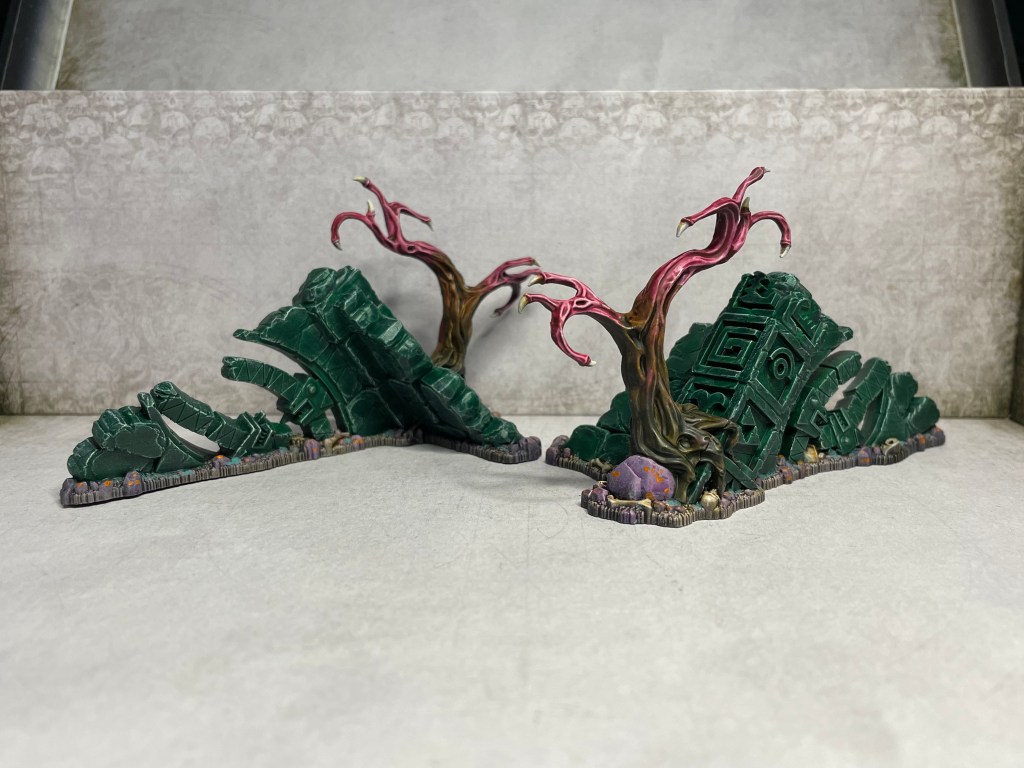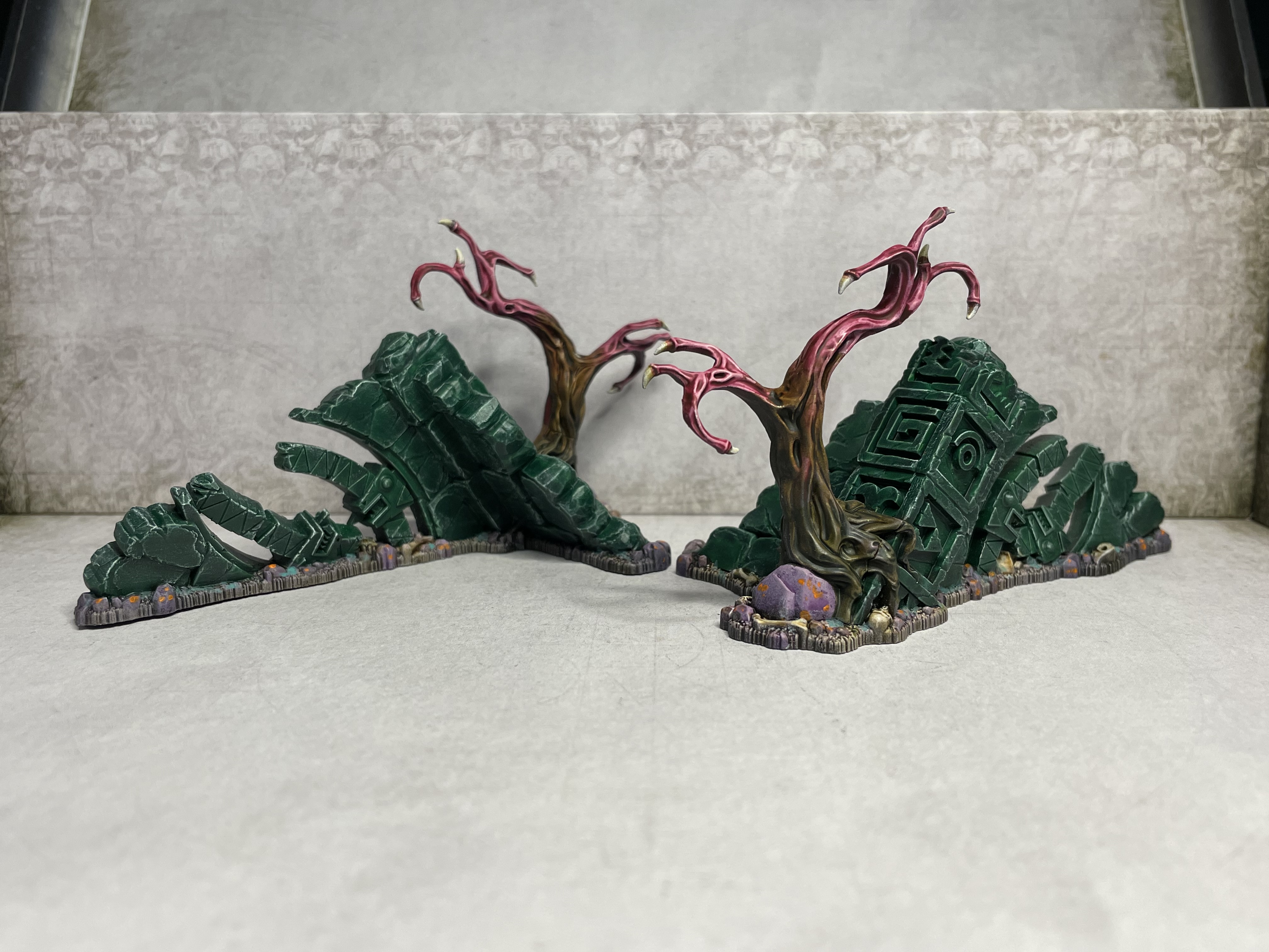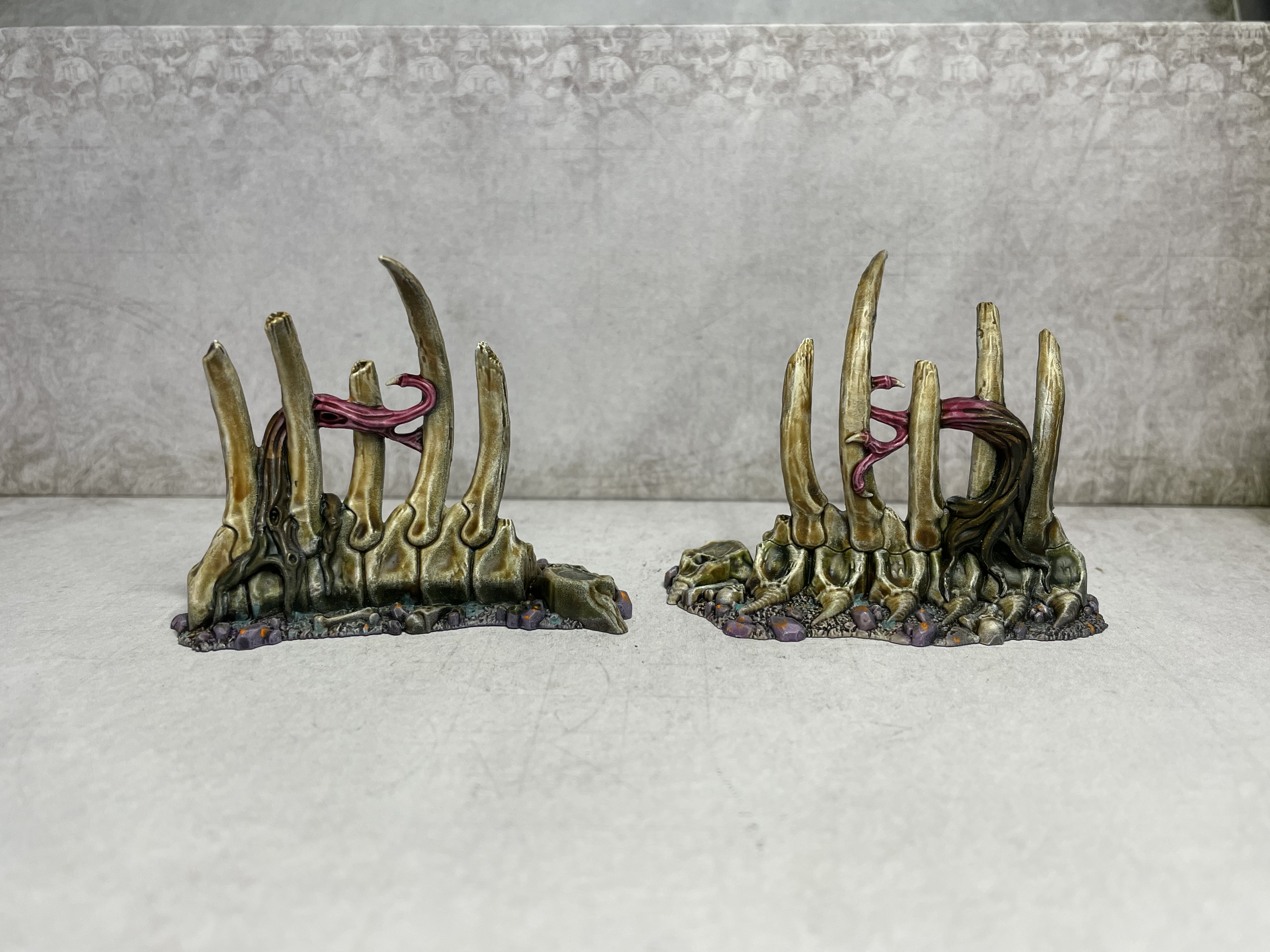 Finally, my Frostgrave terrain has been left out & has been staring me in the face these last two weeks. It is lovely pre-painted stuff, and has been worth every penny spent on it, but the lack of detail was starting to annoy me. You can see in the pics above that it is just grey, grey and more grey. Usually this stuff gets packed away straight after a game, so I don’t get to dwell on it too much, but I took advantage of it being left out for so long & gave it some attention. Nothing hectic really – a bit of green wash, lichen spots, the odd blood splat and painting up the wood, but I think it makes for a big improvement overall. I also did the same to my Garden of Morr set to tie it all together: