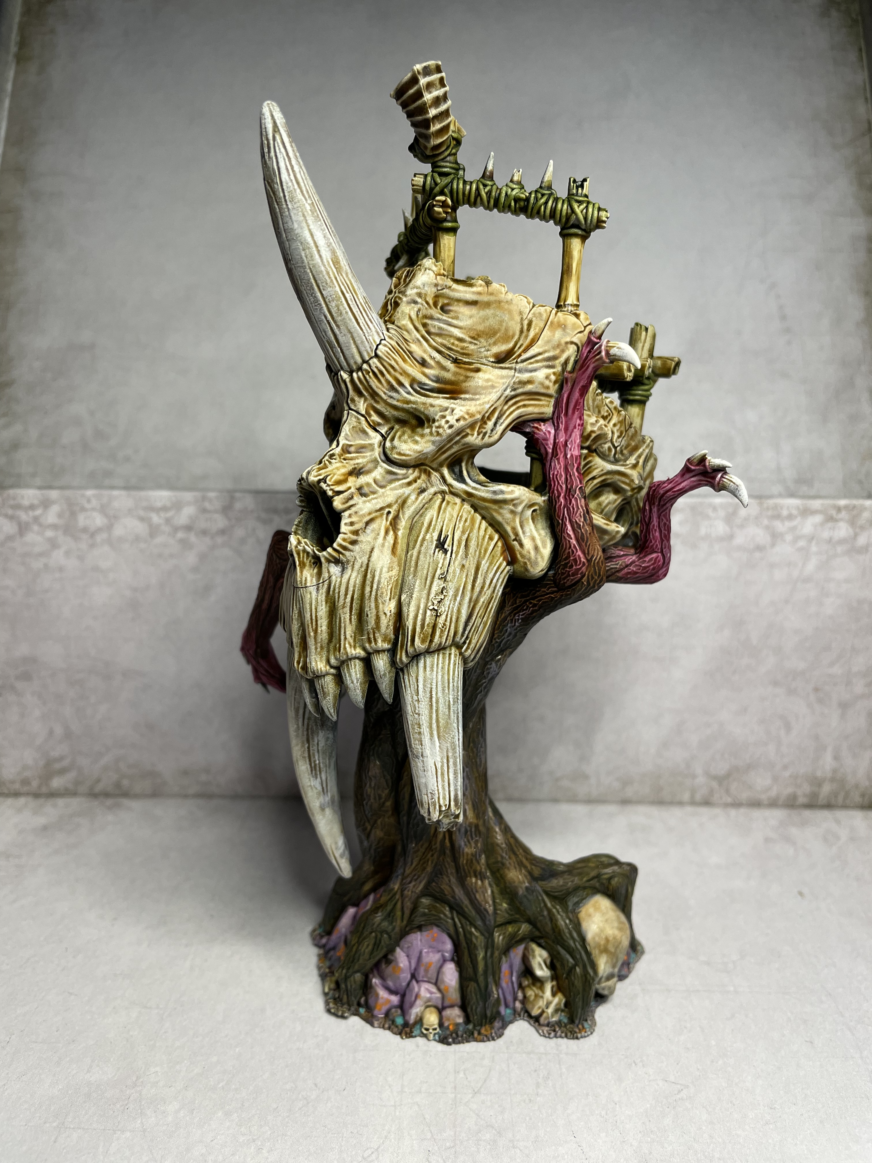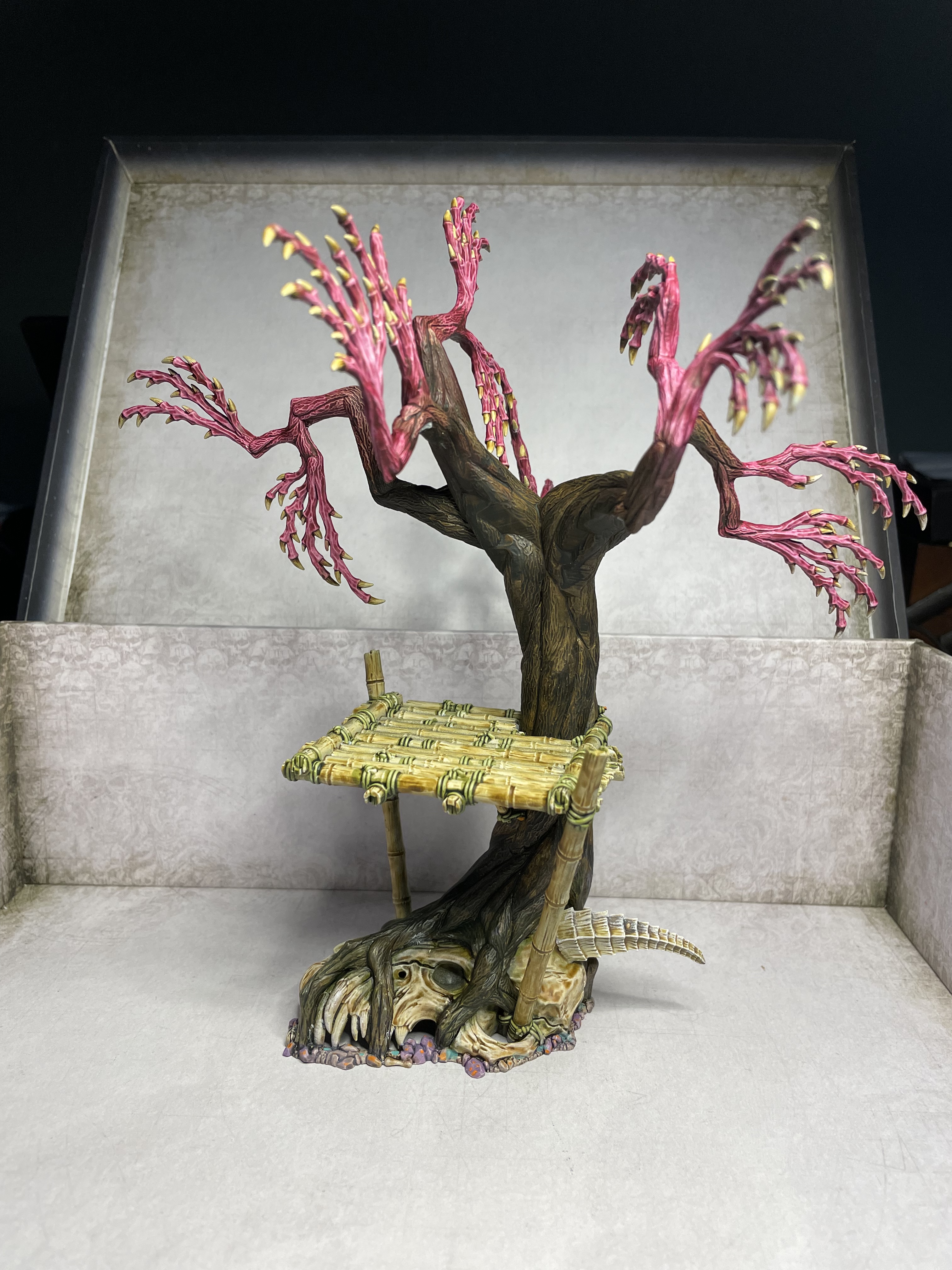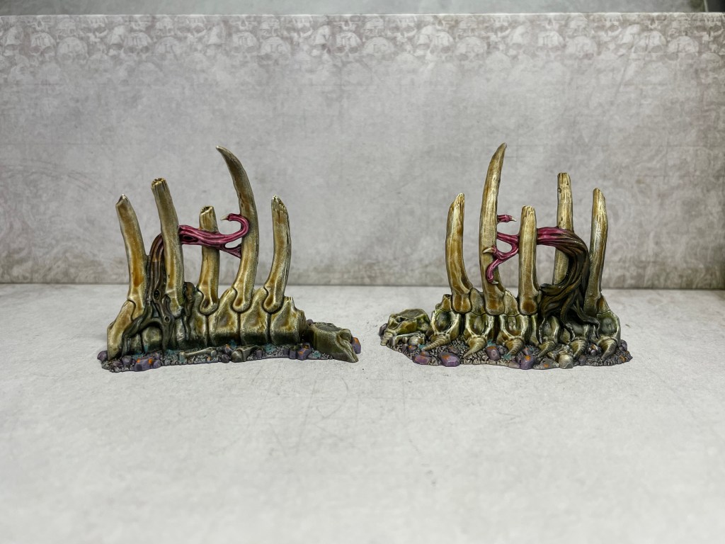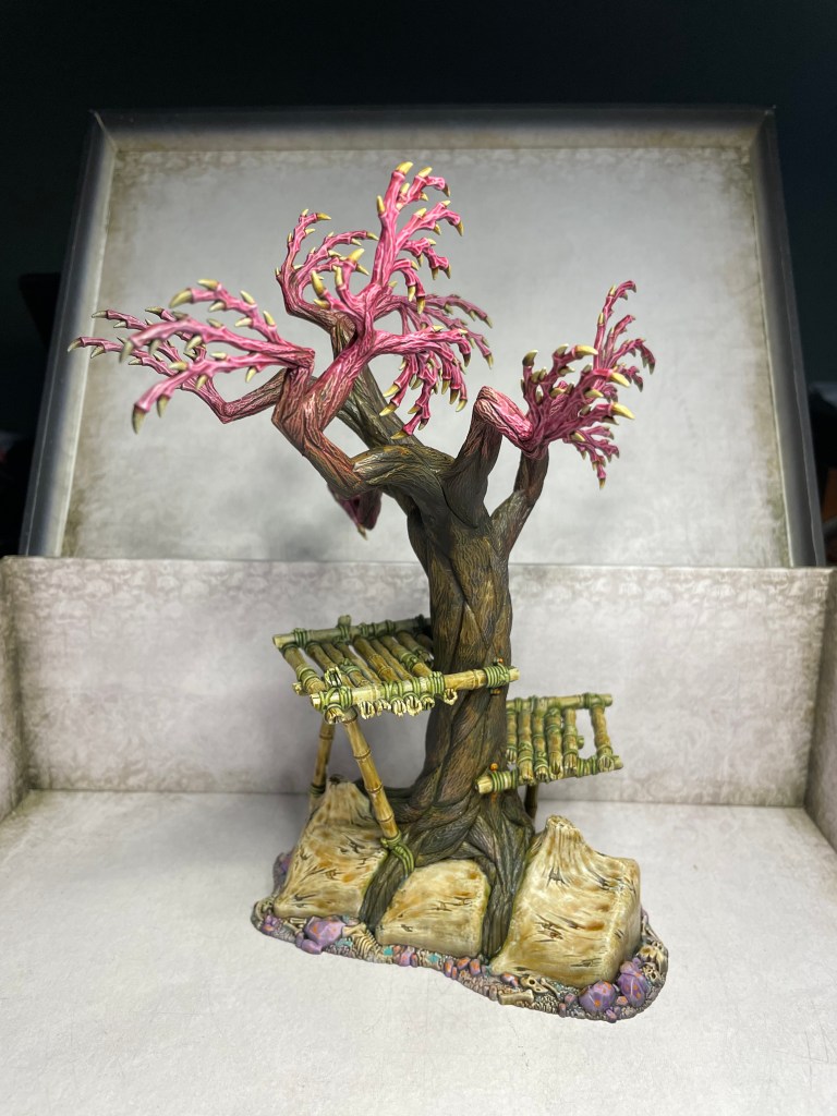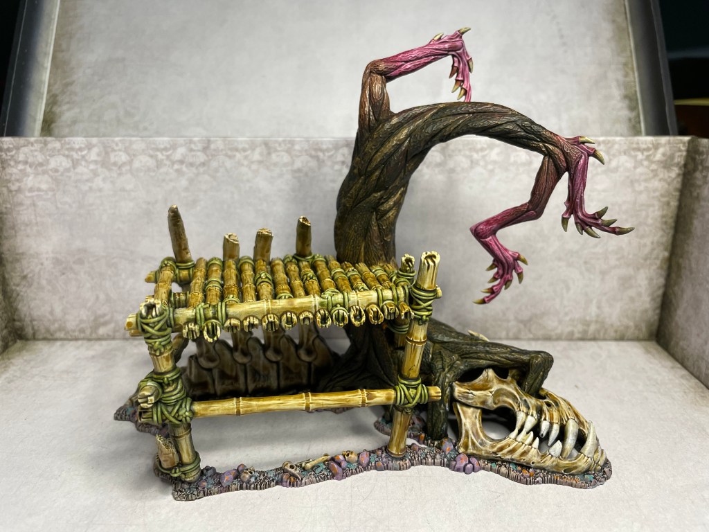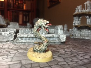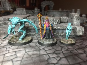 We were going to play Frostgrave as a trio of Wizards, but my eldest got a bit teenagery about it all, so it has just been me & my youngest son playing co-op. We deliberately went for non-fighty wizards to start – he went Illusionist, and I went for Soothsayer. Neither has any combat spells in their starting deck, and we haven’t taken warbands either, so we’ve been a bit crap really!! 😊 That said, the illusionist can cast ‘Monstrous Form’ or ‘Beauty’, and my son and I agreed that it would be good to have minis to represent this. We roped in a mildly converted Knightmare Miniatures ‘Hook Horror’, and some random nudie elfin lady that I had in the pile. Both got a spooky glow-type paint job to show their illusory & magical nature on the table top: