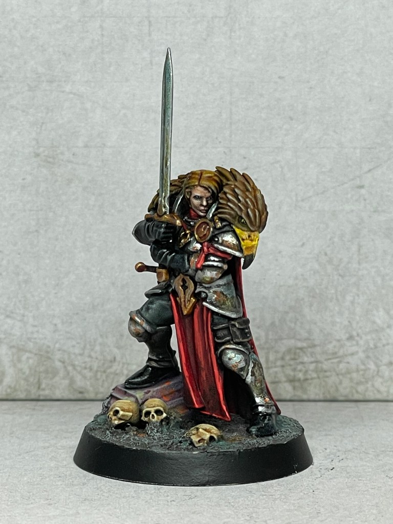 Emelda is a lovely mini – great pose, lovely detail and a really characterful face, and that eagle’s head is a really nice touch too. She has more than a hint of Brienne of Tarth about her & that is an excellent thing in my book. I painted her armour to look tarnished & worn, but there is no doubting the sharpness of that sword!