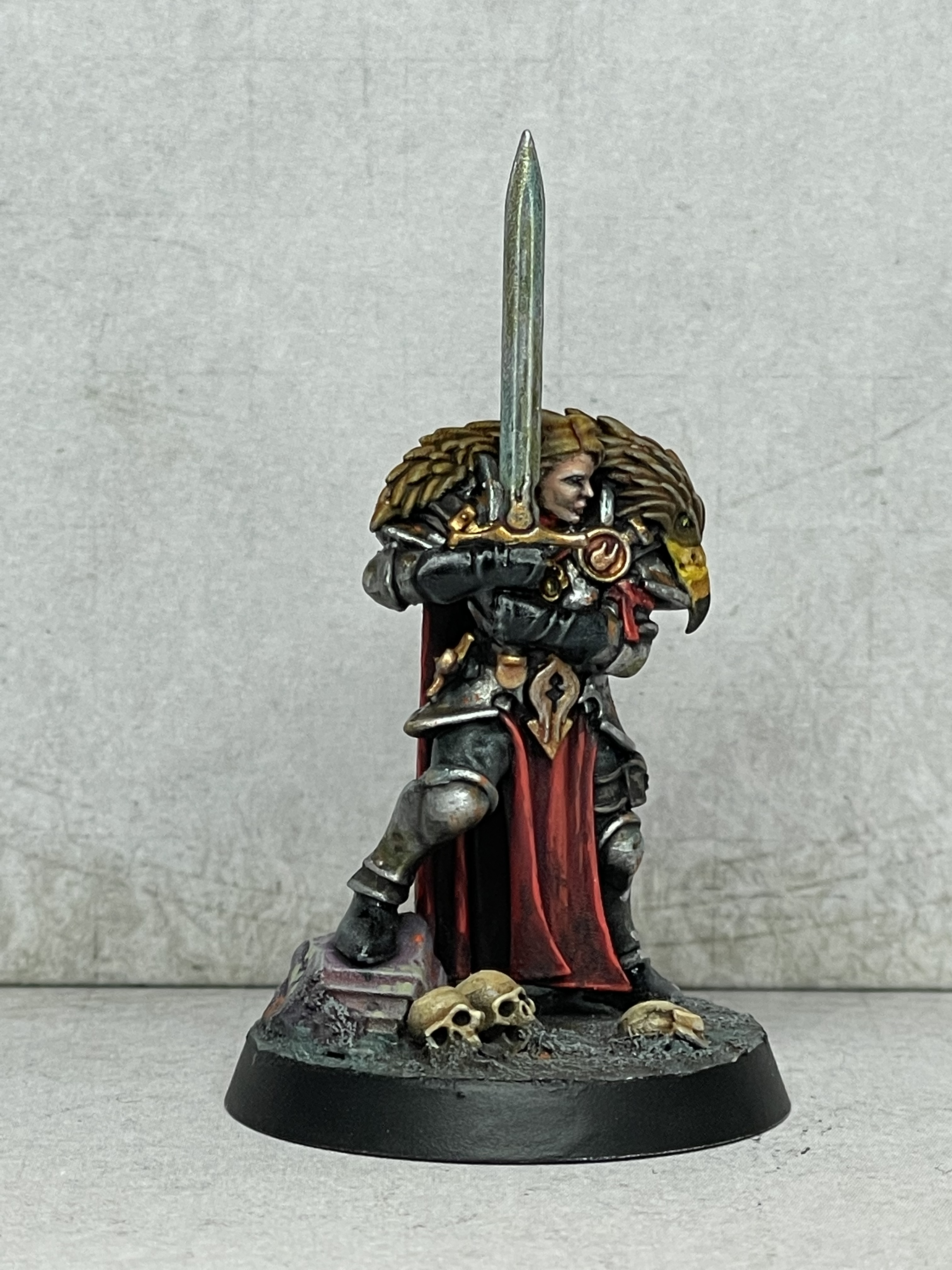 Emelda is a lovely mini – great pose, lovely detail and a really characterful face, and that eagle’s head is a really nice touch too. She has more than a hint of Brienne of Tarth about her & that is an excellent thing in my book. I painted her armour to look tarnished & worn, but there is no doubting the sharpness of that sword!