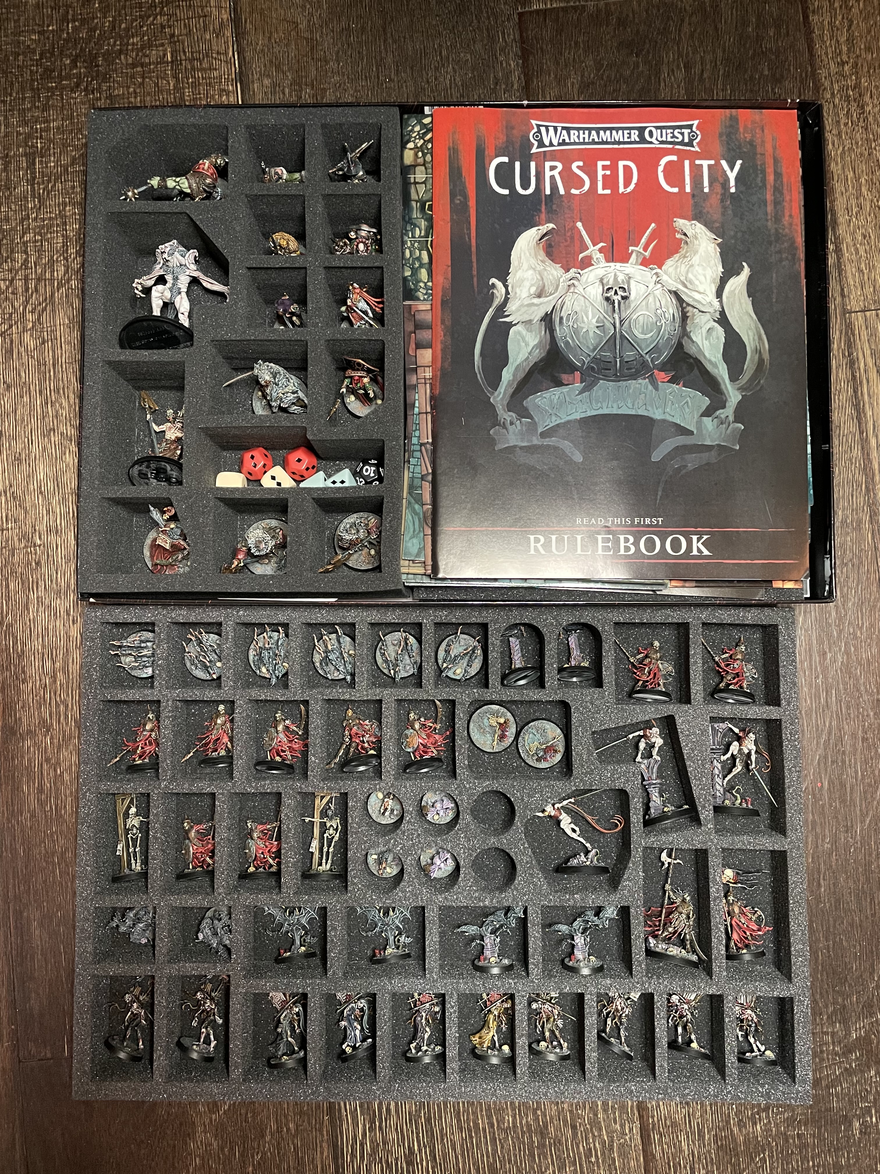 Oh, and one last thing to close out the project – I wanted to give my Cursed City minis a home to be proud of so I bought a bespoke storage system from Feldherr. I’m really pleased with my purchase – It all fits in the original game box, albeit with an extra 2 inches of height when closed (necessitating an elastic strap for the box). Here they all are, snug and safe: