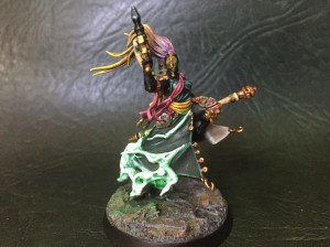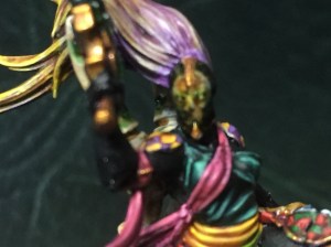 She is a conversion I did a few years ago, but never had the courage to paint – she’s a really complicated figure, and is intimidating as hell! She is based on the Mistweaver Saih from Warhammer Quest, but spliced with the Harlequin Shadowseer mini… yeah… two really detailed and tricky minis 😊